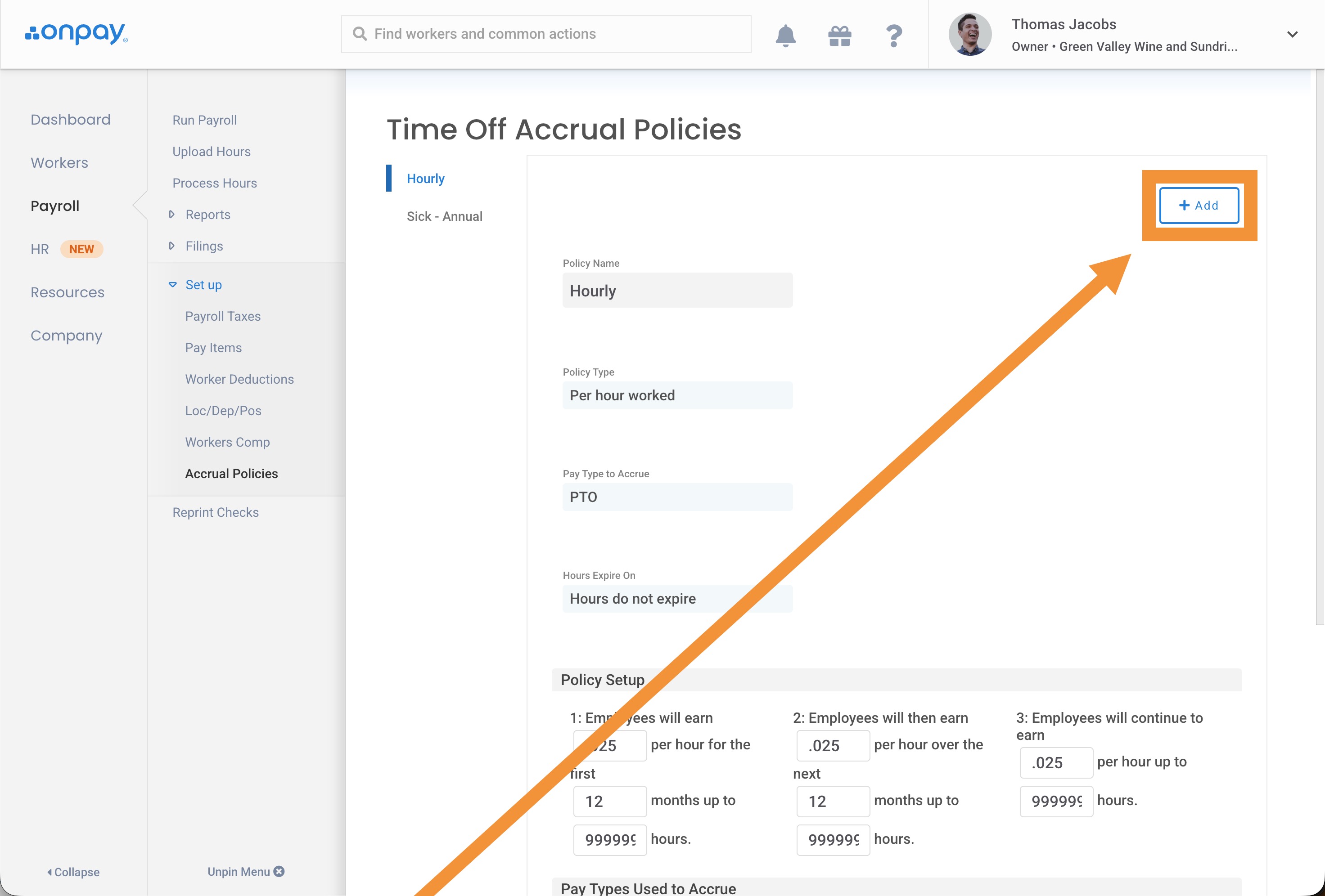 The Policy Setup is in three periods. This means hours accrued by workers can increase with their tenure in up to three stages. To create a probationary period, where no time is accrued until this introductory period is over, enter "0" per hour, then the number of months in the probationary period. If you don't want accruals to increase, enter the same information in each period. Unused hours will rollover to the next period. We'll explore more examples later.