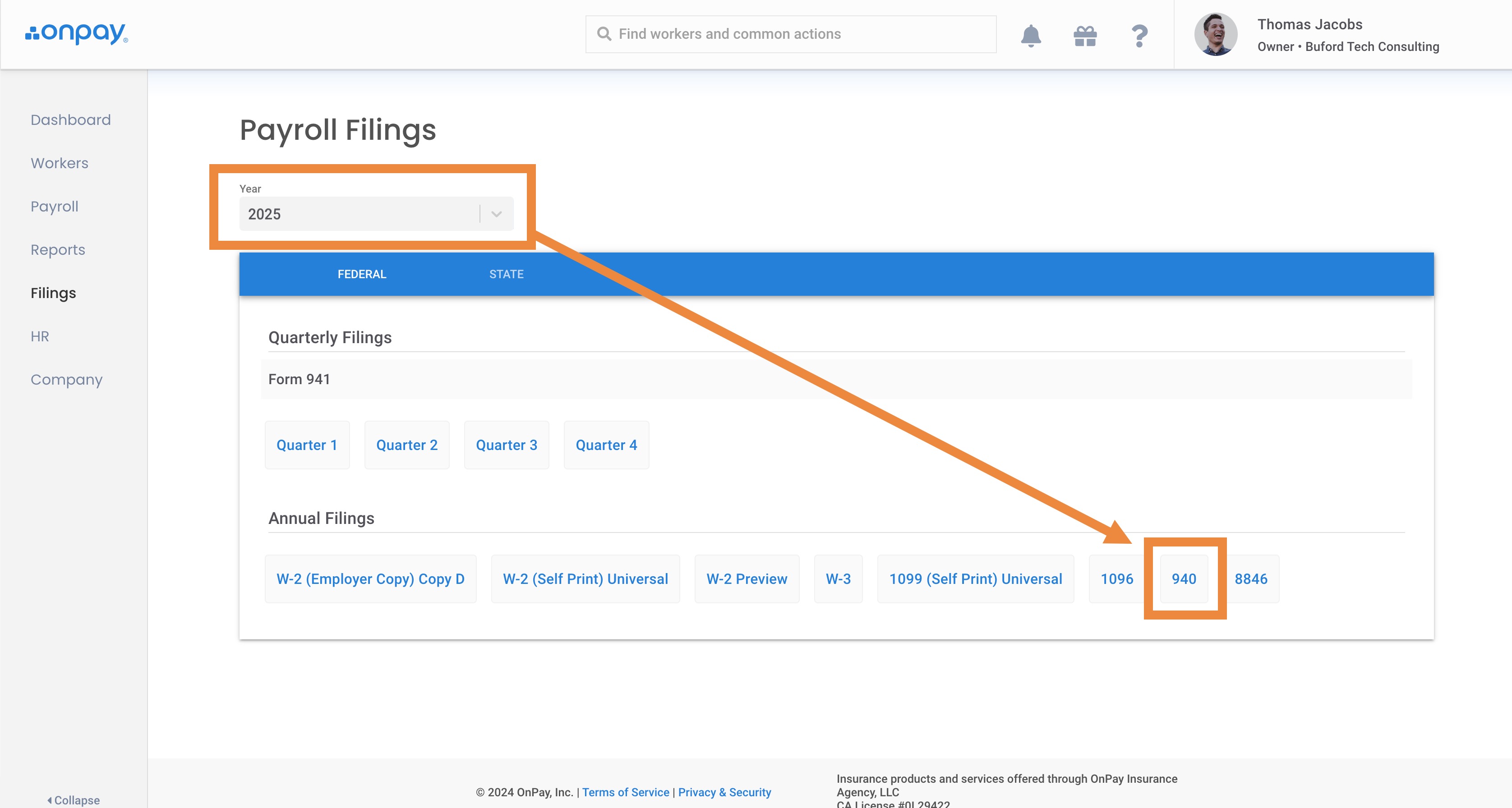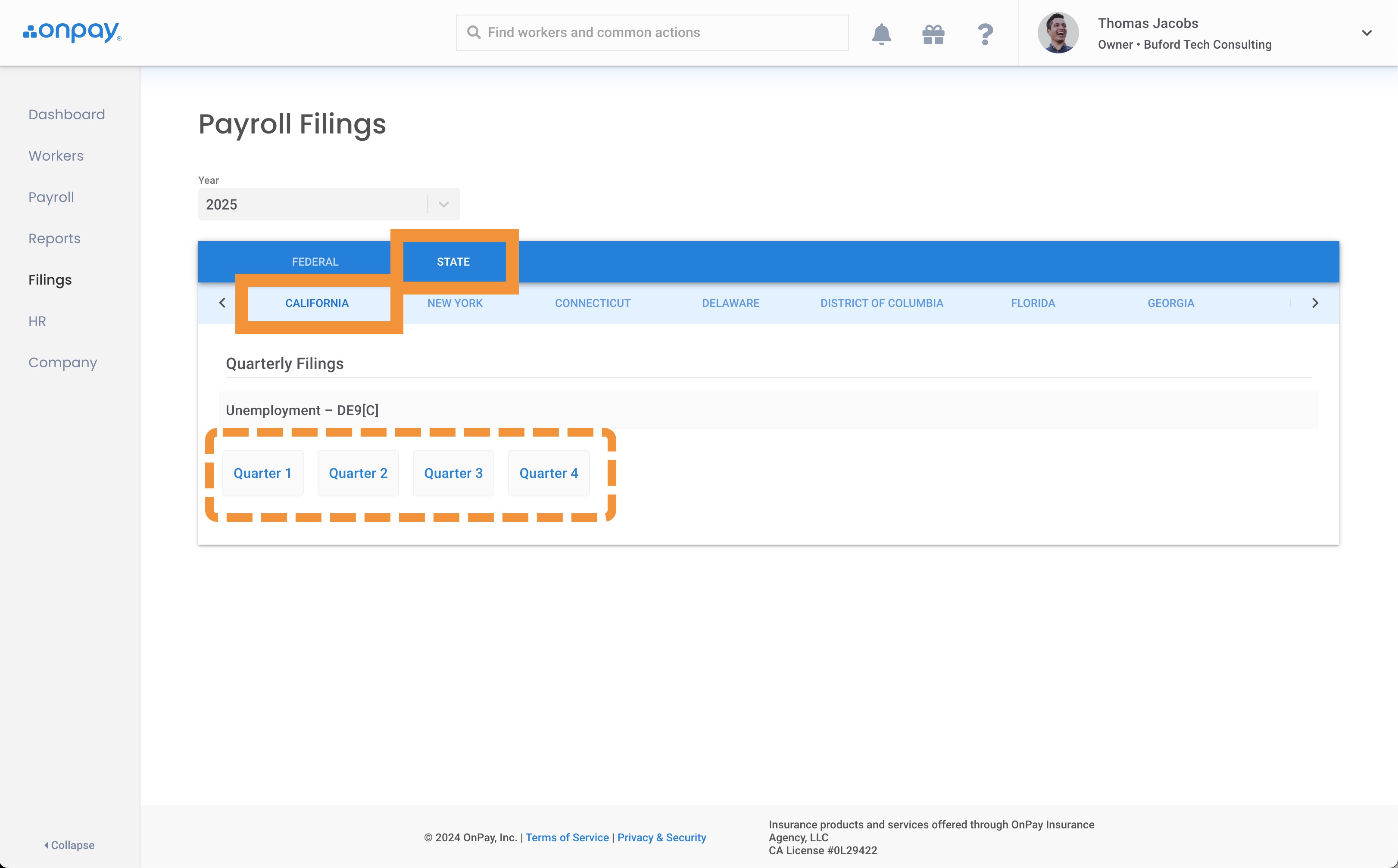 The simplest way to view employee taxable wages, especially if you have employees that work in multiple states, is the state’s quarterly unemployment returns found in the Filings menu.