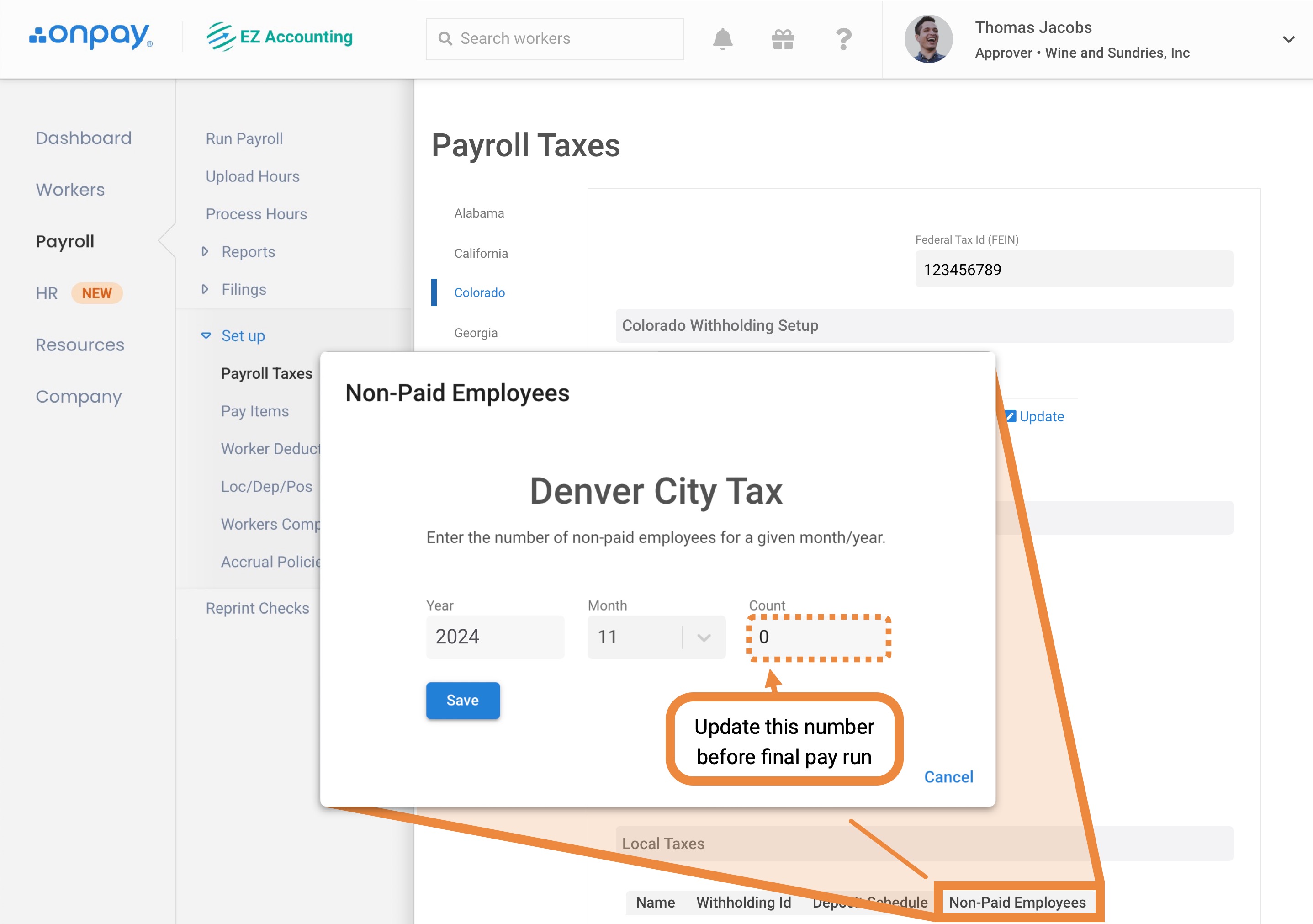Scroll down to the "Local Taxes" section to update your non-paid employee count, then click Save.