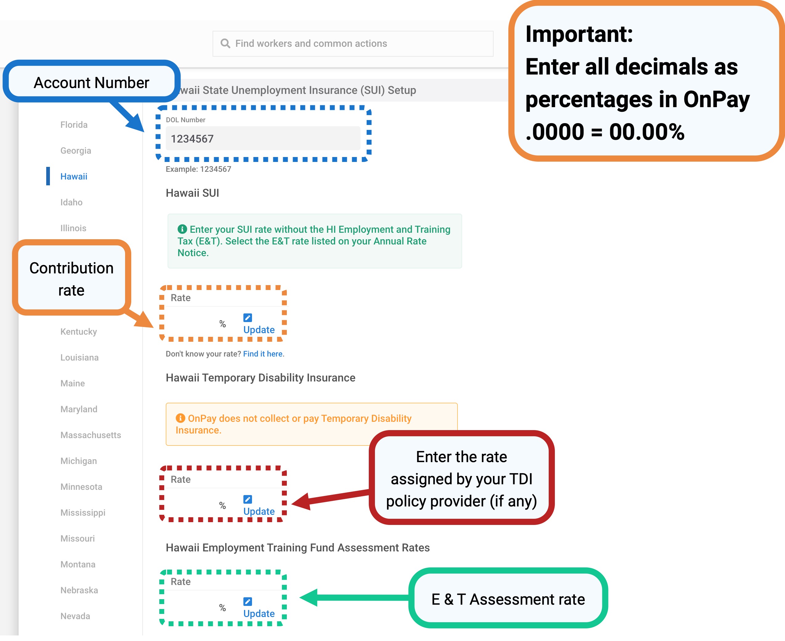 Use the Update buttons to enter your Hawaii SUI rate, Temporary Disability Insurance rate*, and your Administrative Assessment rate separately. All rates must be entered as percents (Ex: .0000 = 00.00%).