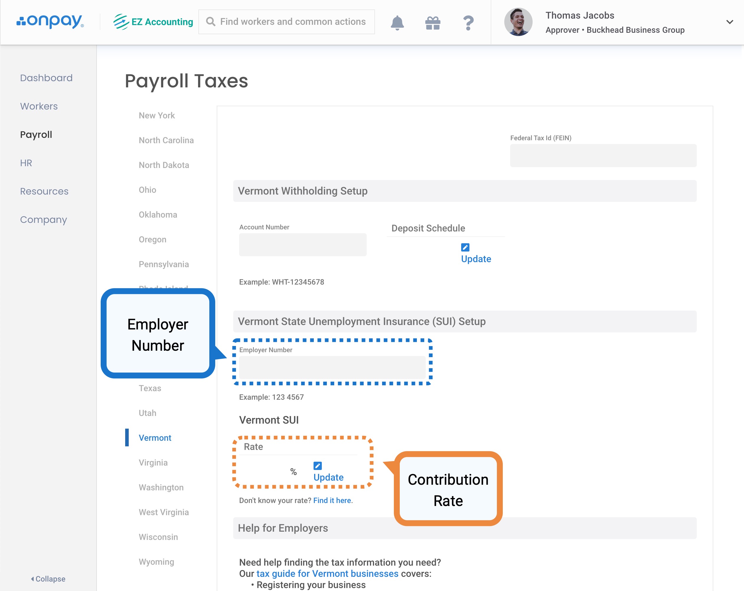 For OnPay to effectively calculate state tax contributions, you'll need to ensure the tax rates entered in OnPay are correct for each state where your company has a tax obligations. For example, if you operate in both Vermont and New York, you must keep payroll tax information up-to-date for each (and every) state where you pay employees.