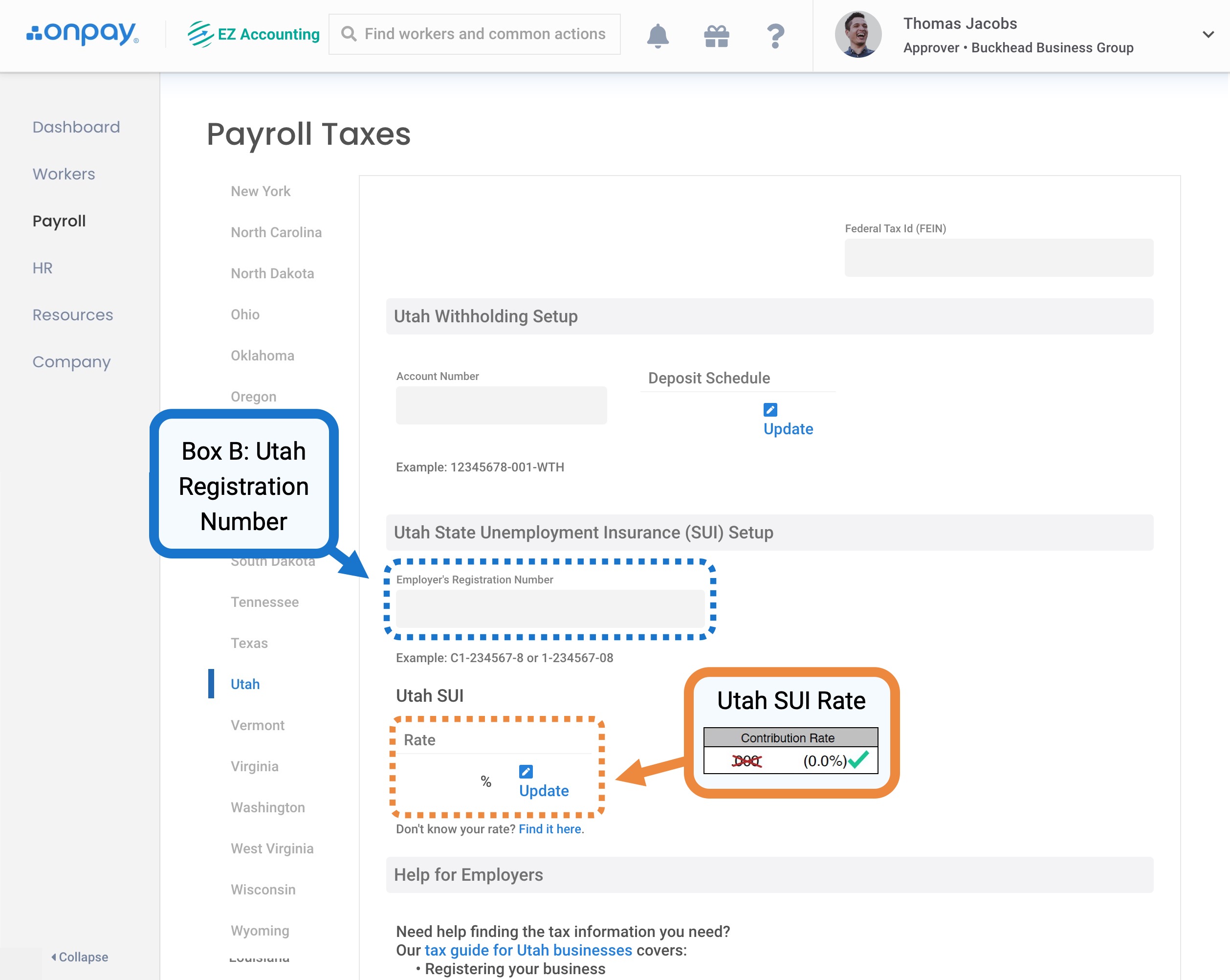 - Your Utah SUI rate is listed on the right, in the box labelled "Contribution Rate"