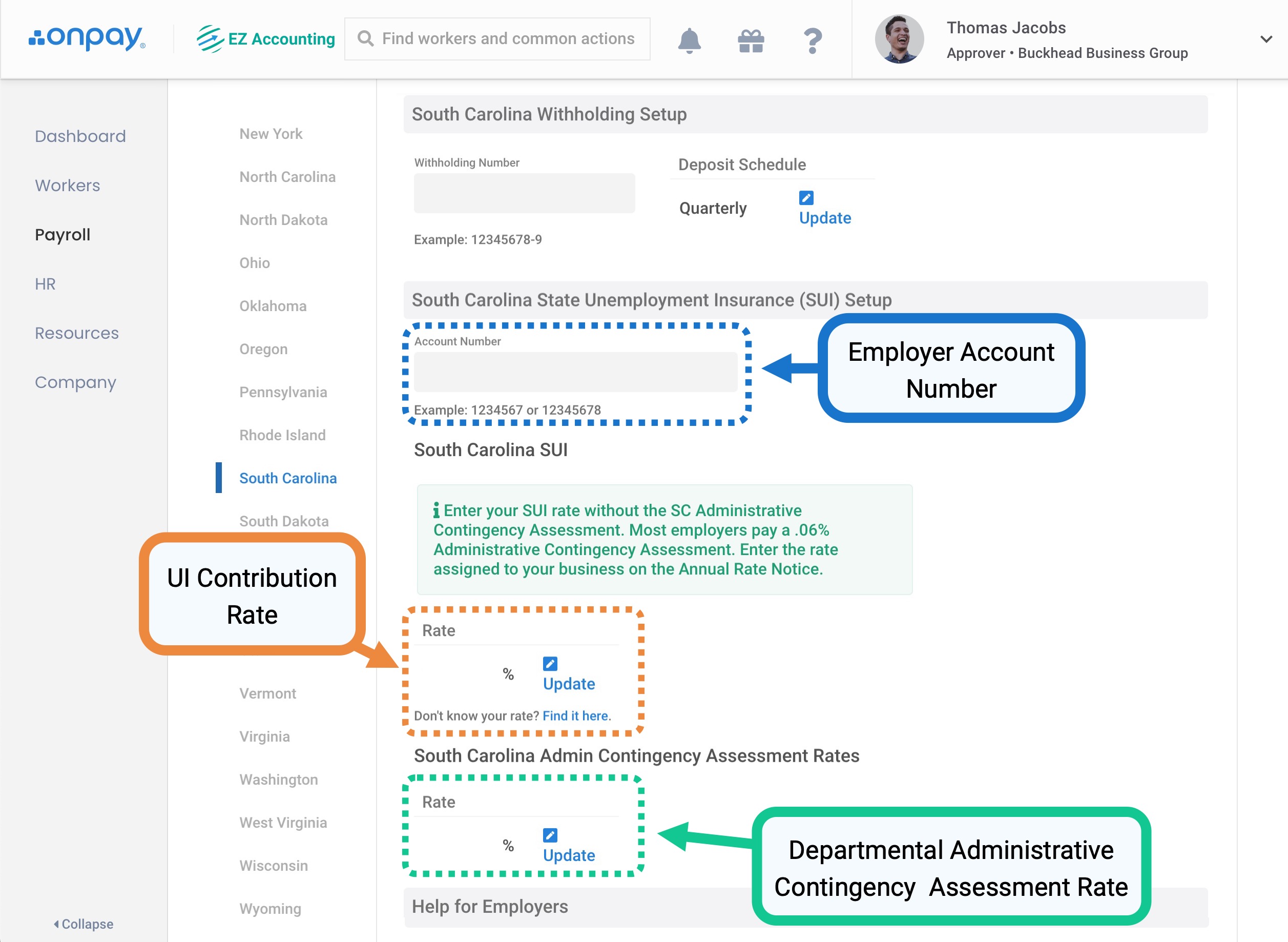 For OnPay to effectively calculate state tax contributions, you'll need to ensure the tax rates entered in OnPay are correct for each state where your company has a tax obligations. For example, if you operate in both Carolinas you must keep payroll tax information up-to-date for each (and every) state where you pay employees.