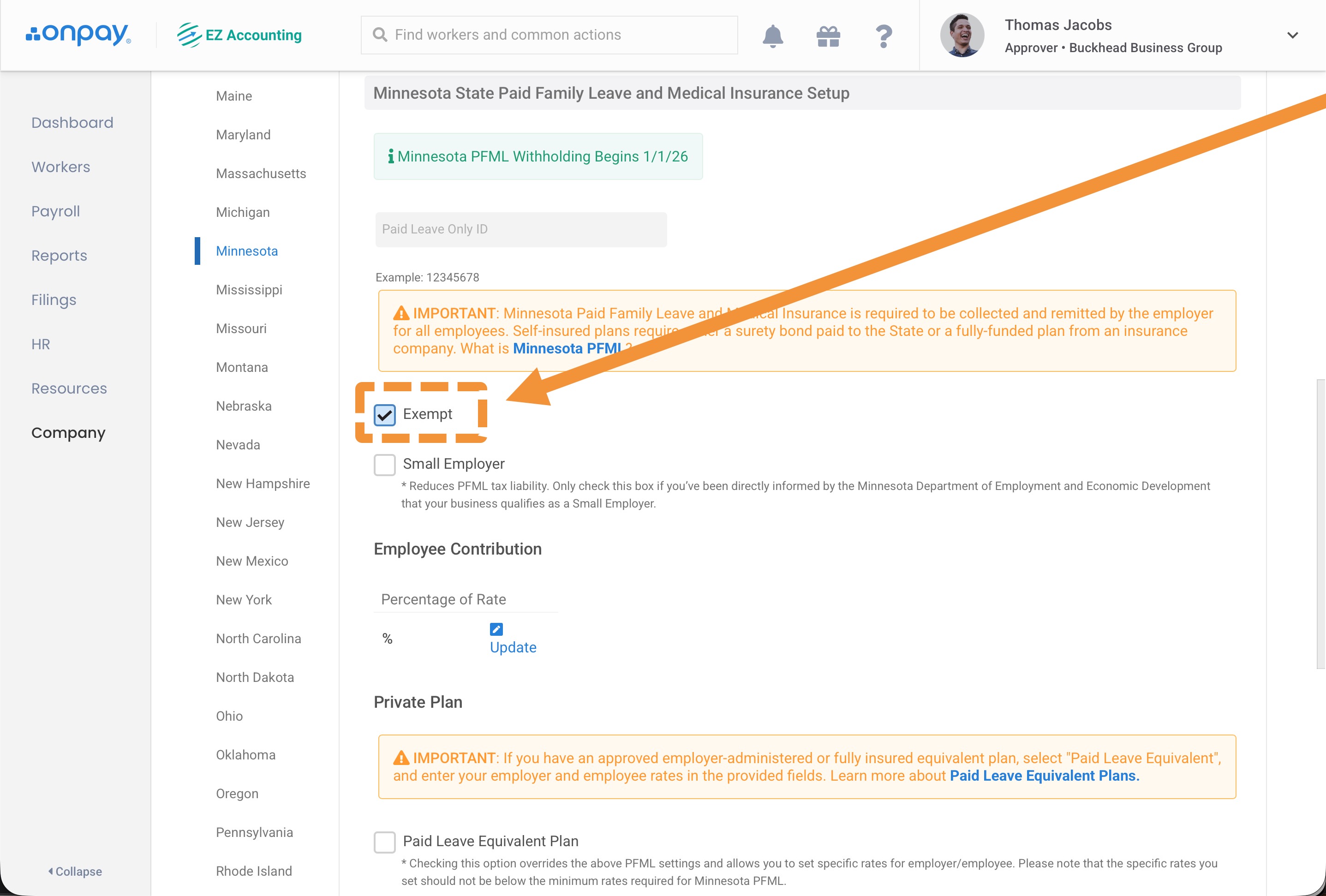 Most employers are not exempt from Minnesota Paid Leave. Independent contractors, self-employed individuals, and Tribal Nations are not covered by the program, but they can opt in. Only check this box if you’ve been directly informed by the Minnesota Department of Employment and Economic Development that your business qualifies as "exempt".