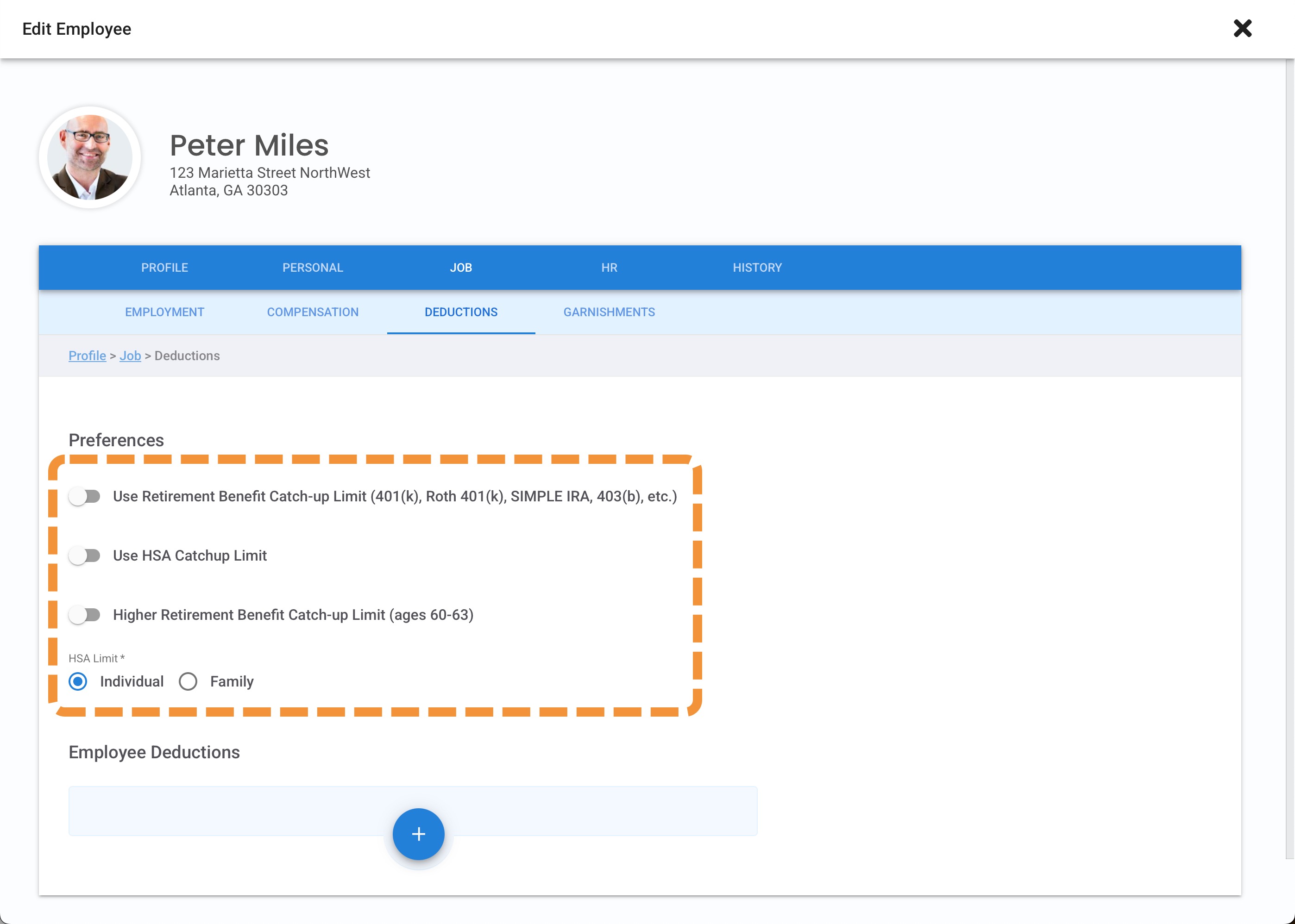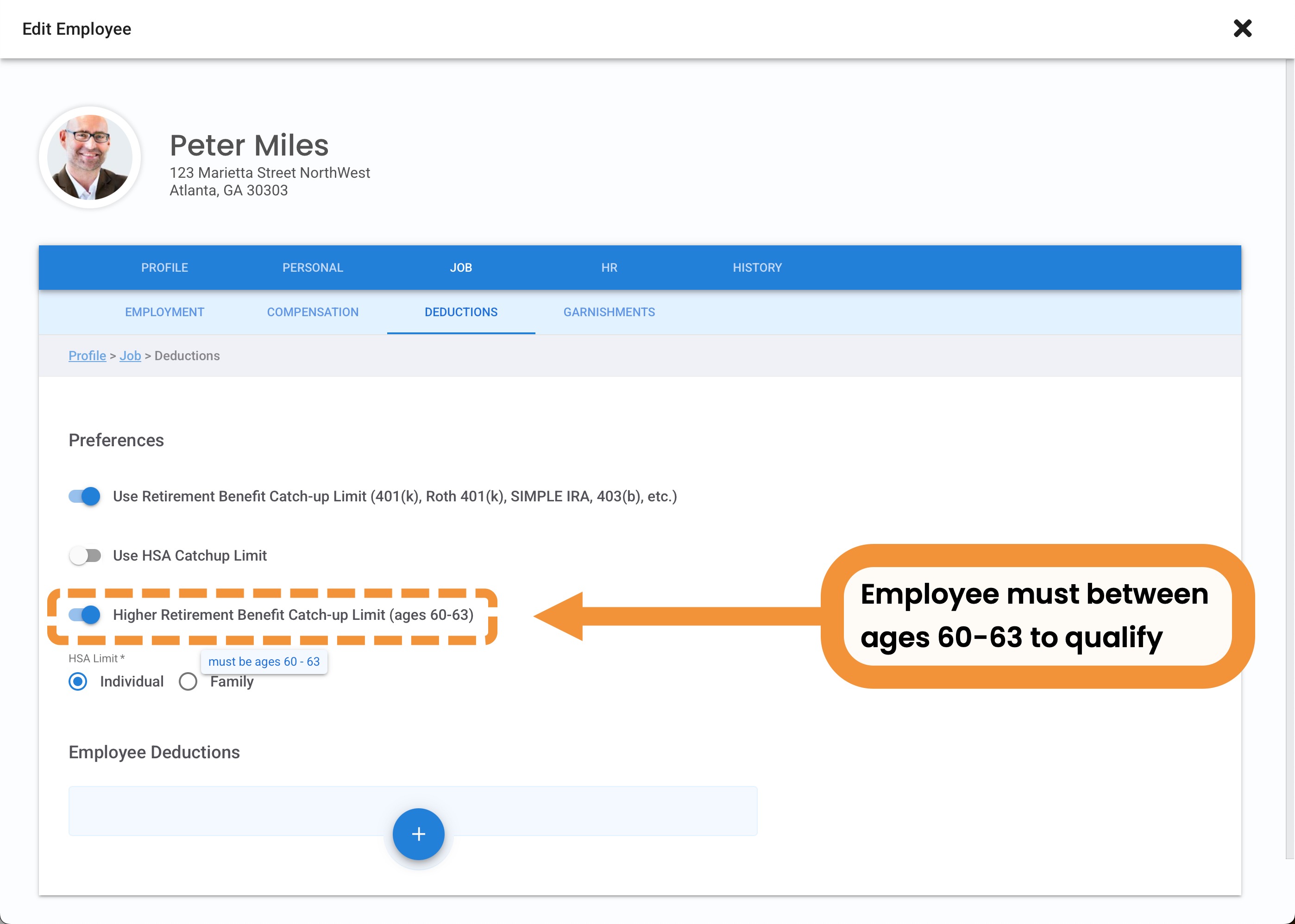Employees between the ages of 60 and 63 are eligible for higher catch-up contributions. Toggling this switch "on" will allow the higher contribution limits for any retirement savings plan added under "Employee Deductions".