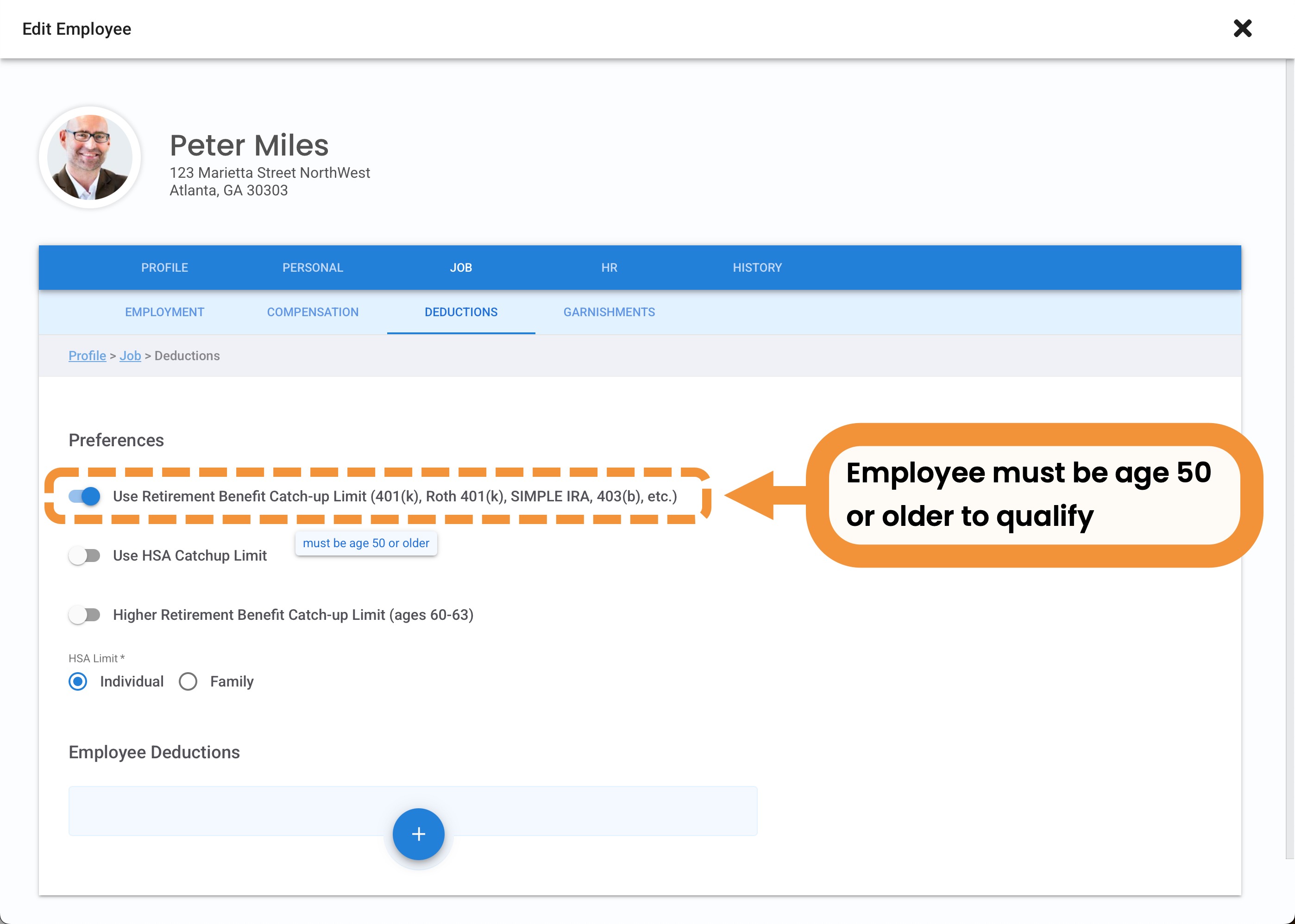 Employees fifty years old or older are eligible for catch-up contributions for retirement savings plans. Toggling this switch "on" will allow the catch-up contribution limits for any retirement savings plan added under "Employee Deductions".