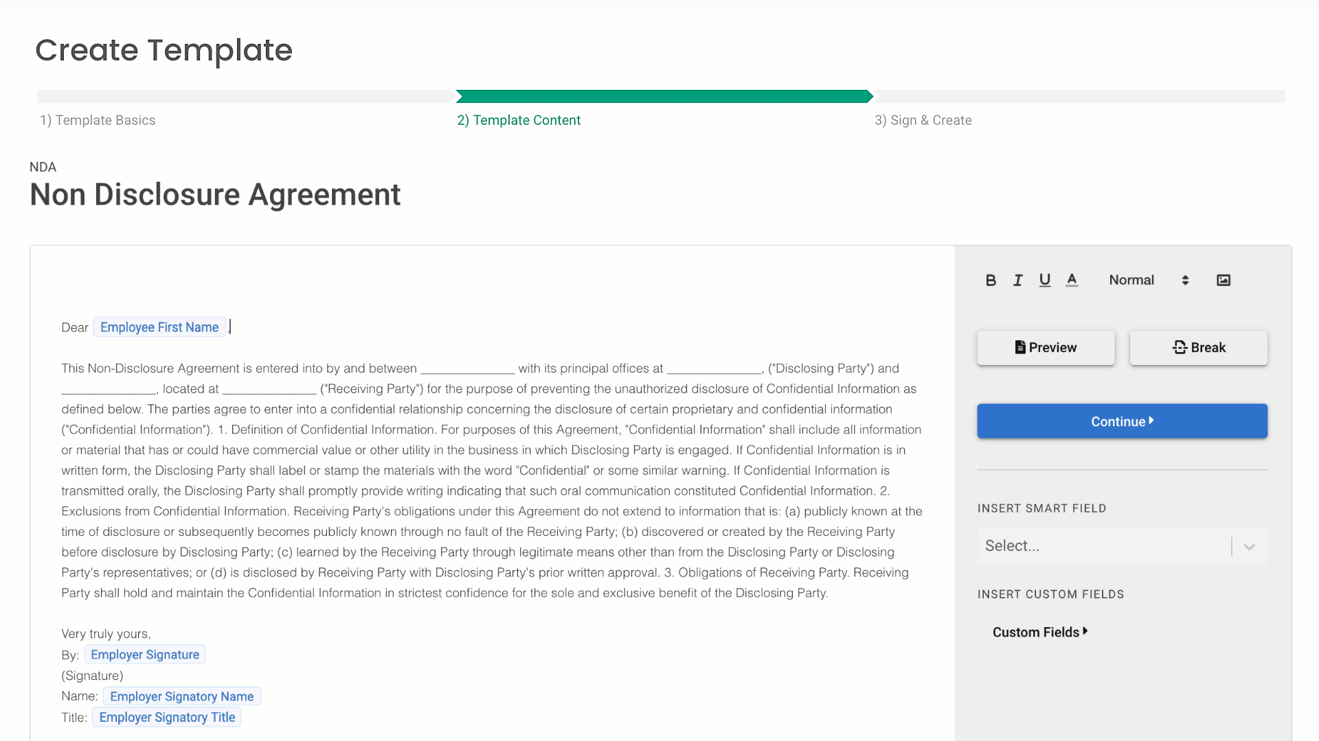 You can type to draft your document, or copy/paste text you have from an existing version, and add smart fields to generate personalized eSignature documents for employees to sign and return.