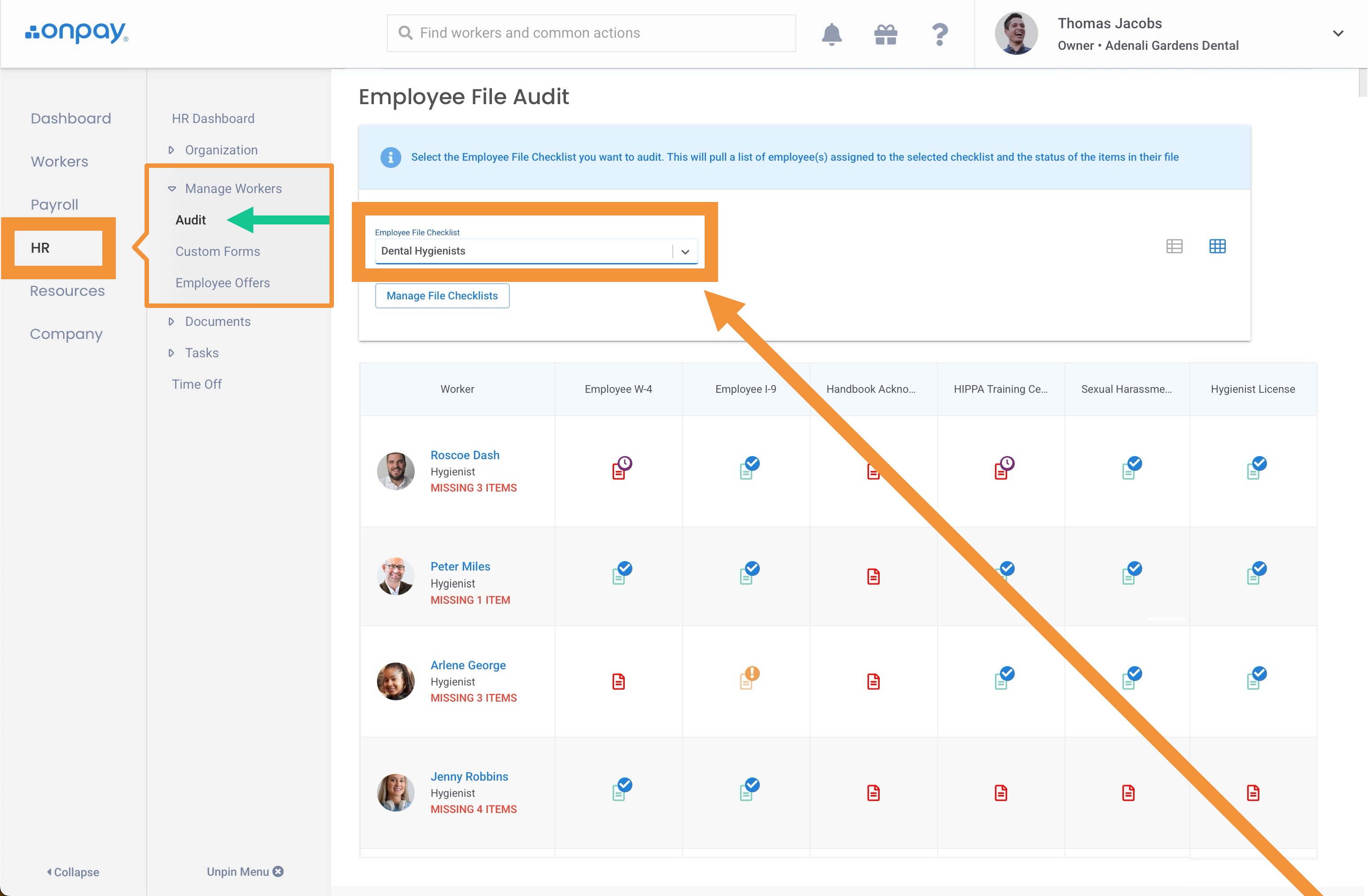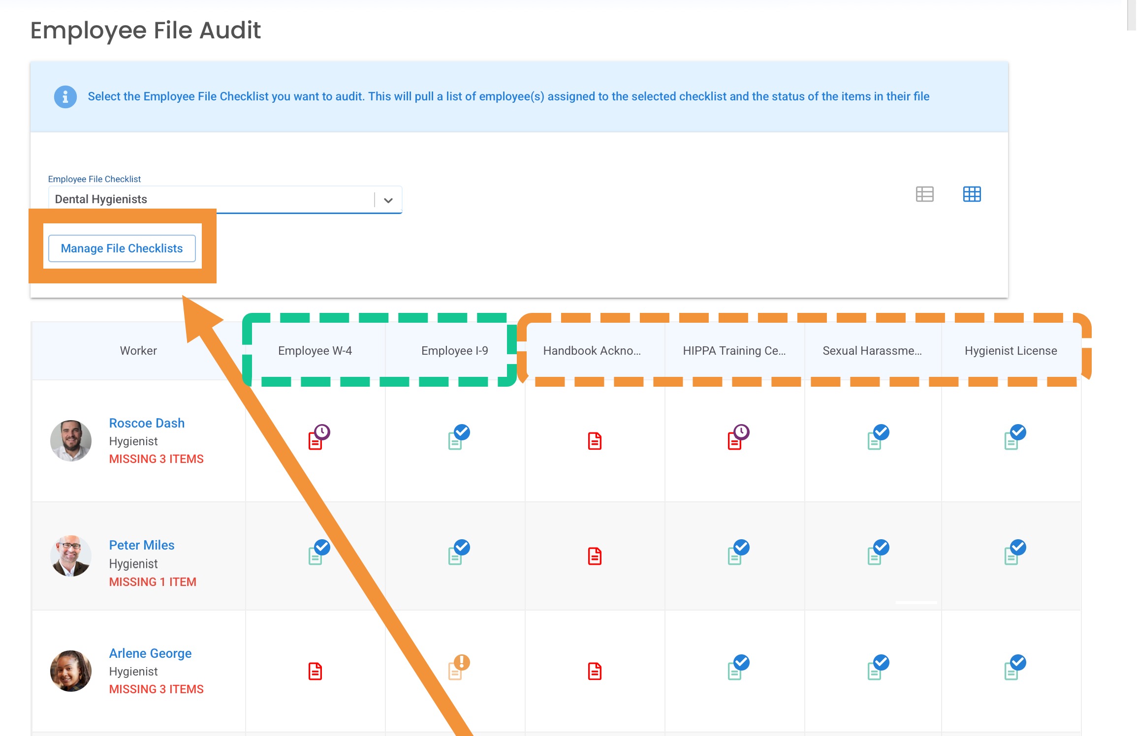 Go to HR>Manage Workers>Audit, and select the "Employee File Checklist" from the menu.