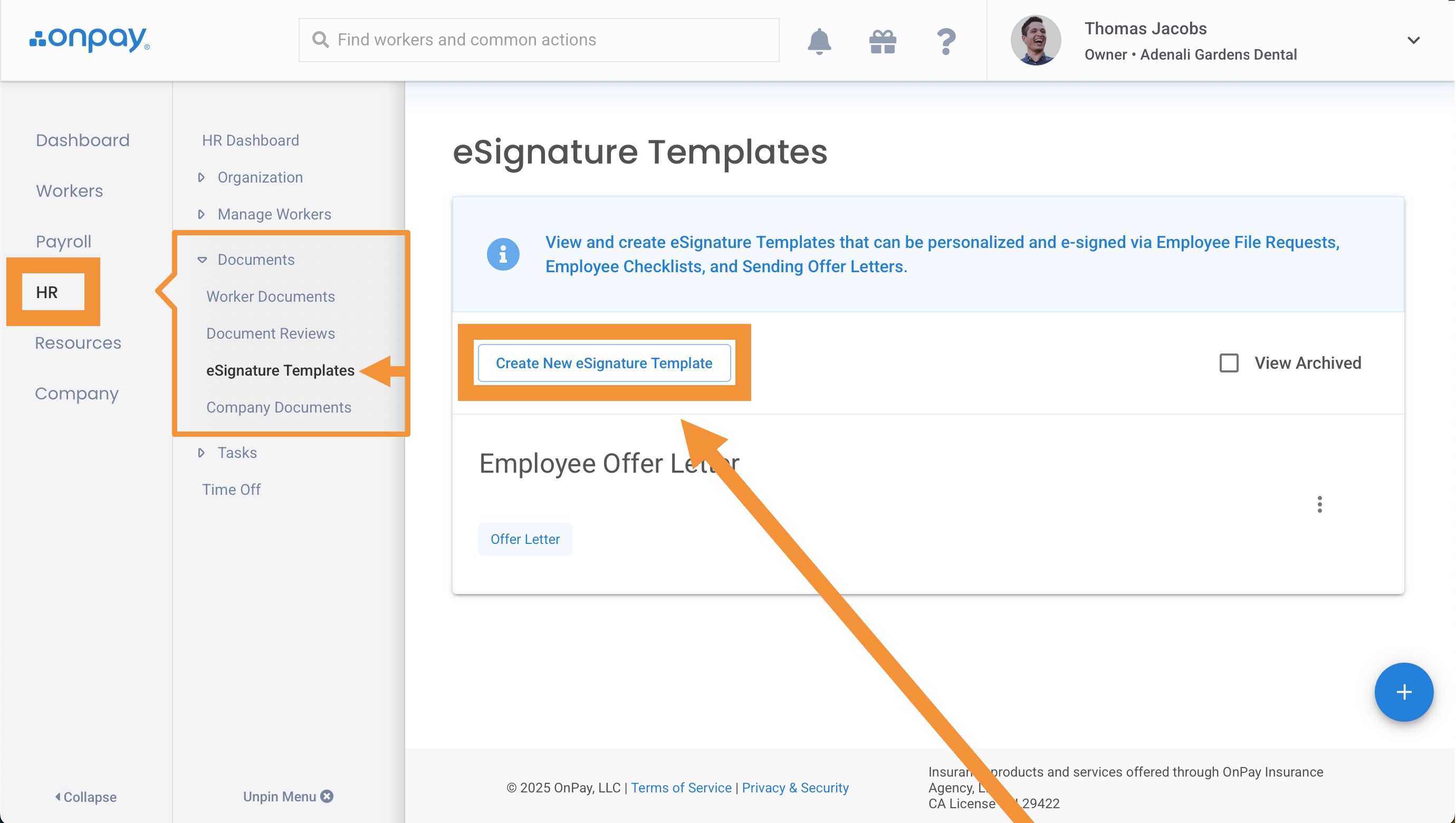 In the HR tab, click Documents, then eSignature Templates. Click Create New eSignature Template, found at the top of your list of templates.