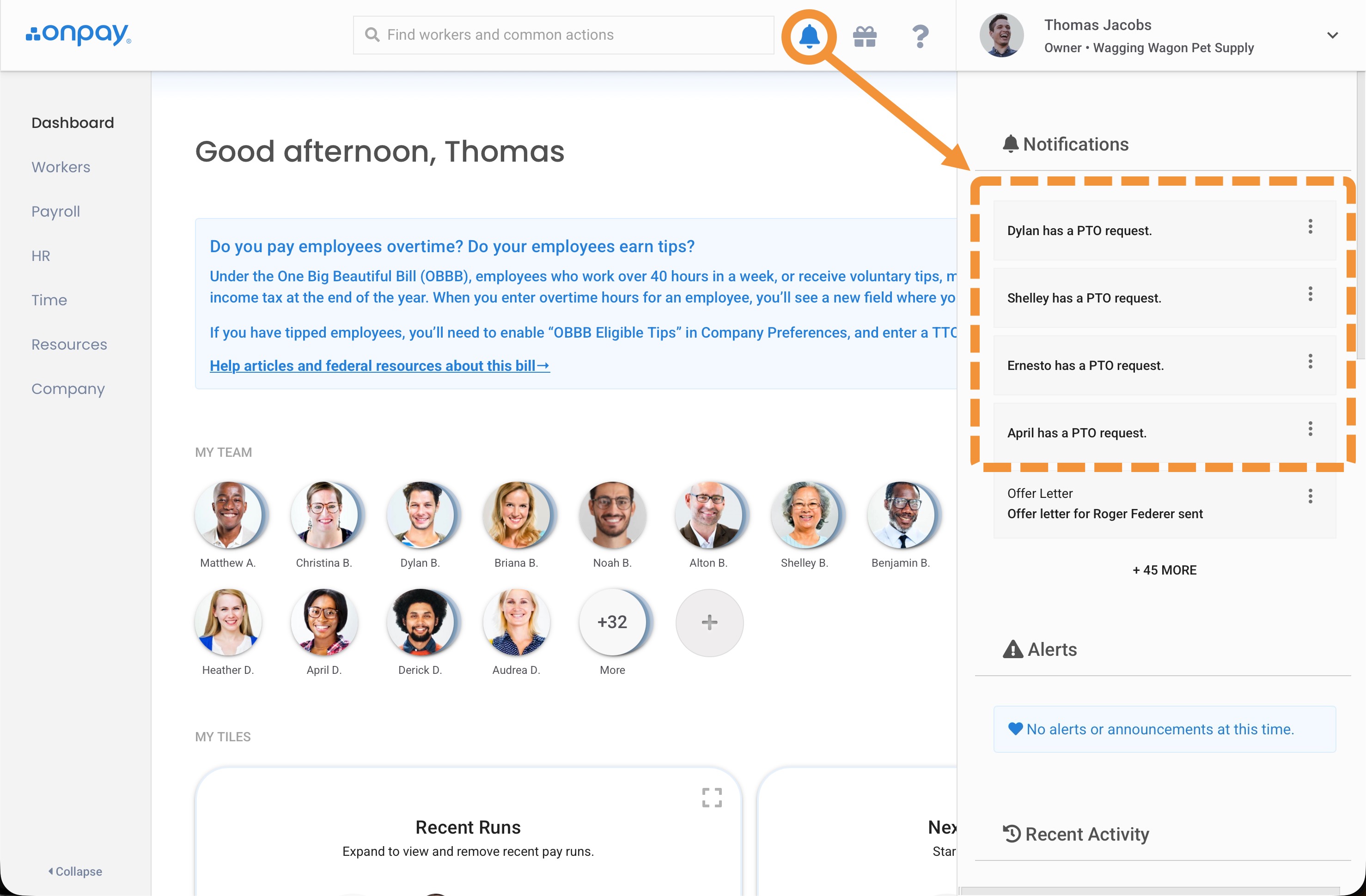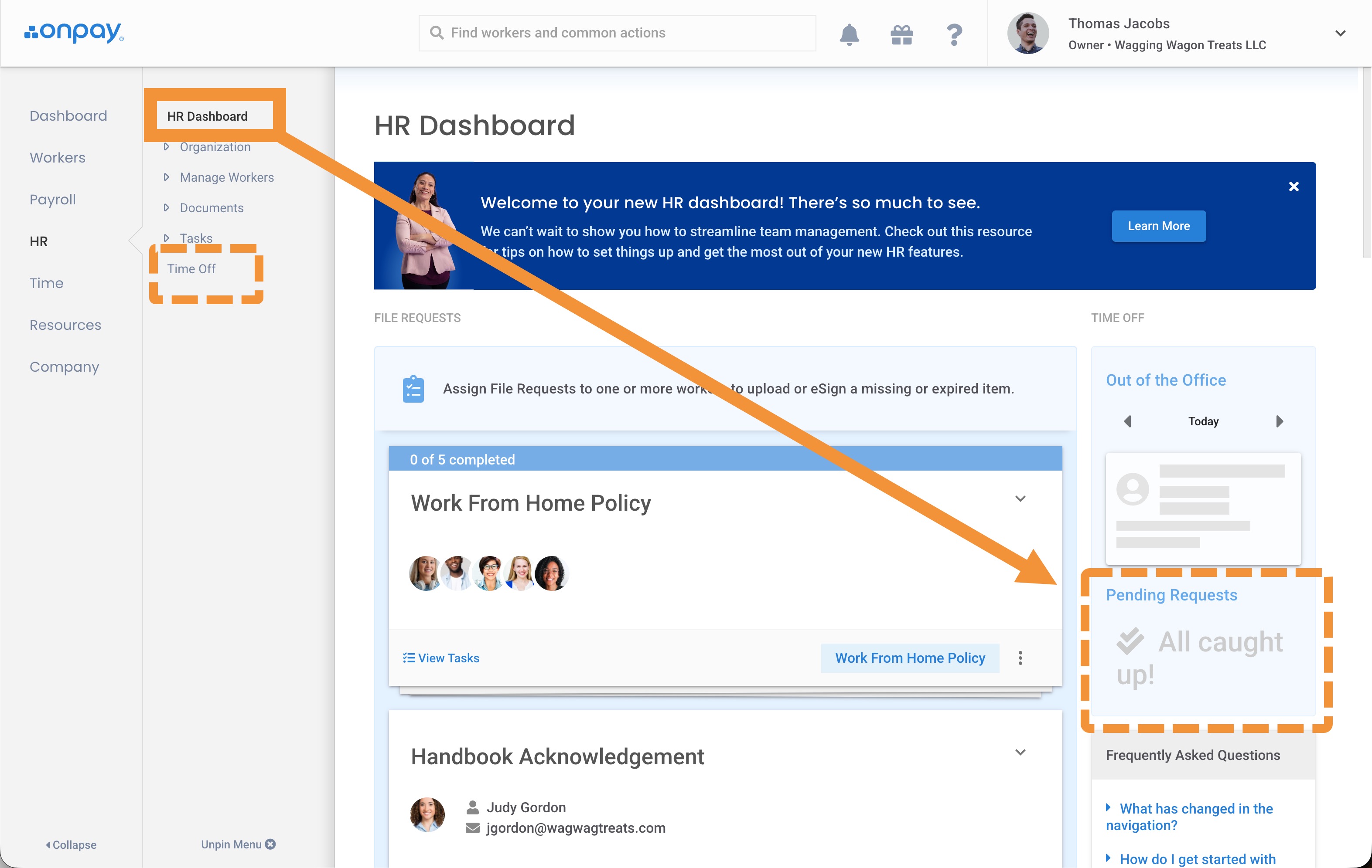 You can also see and respond to time off requests in the HR Dashboard, as well as in HR>Time Off.