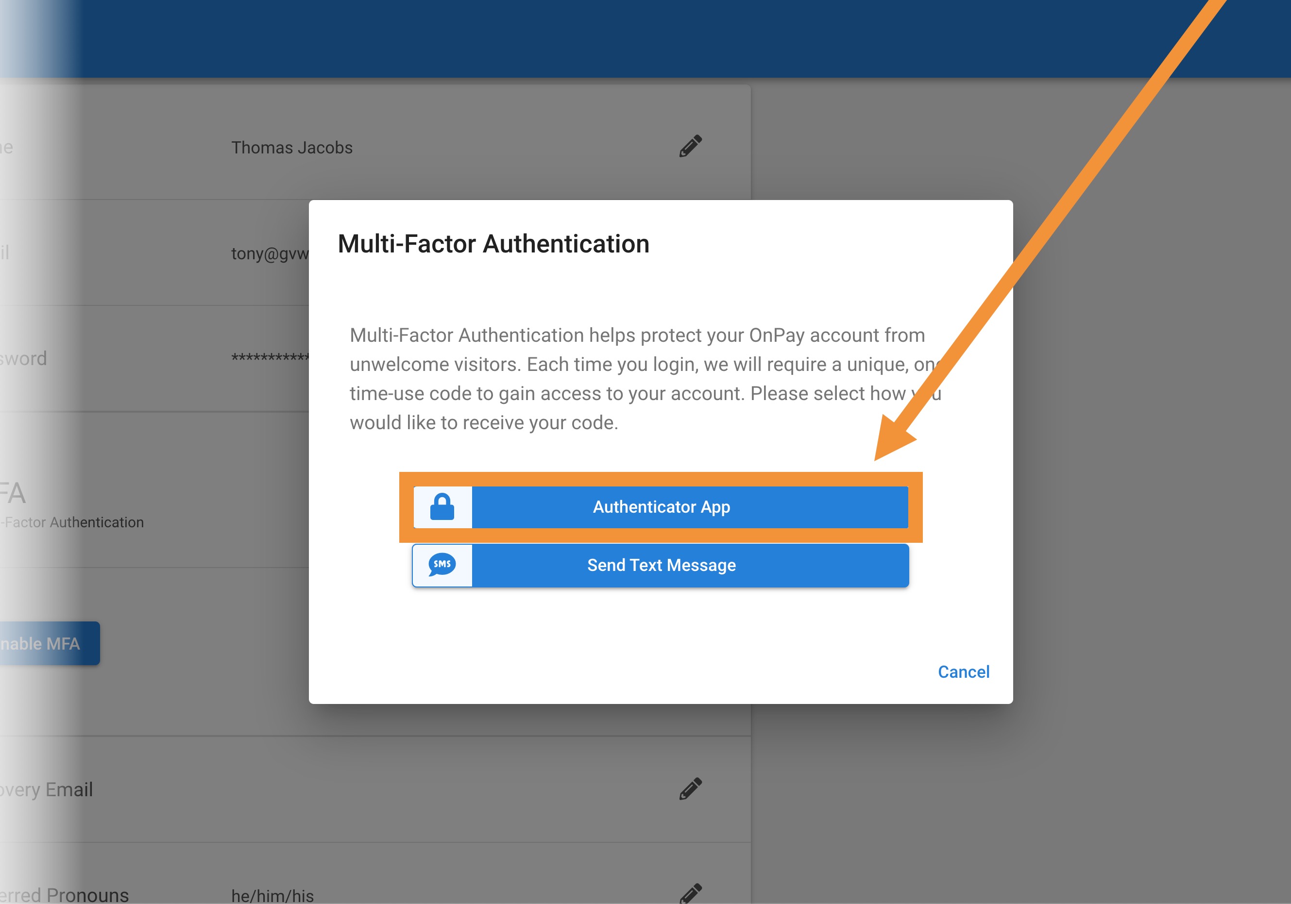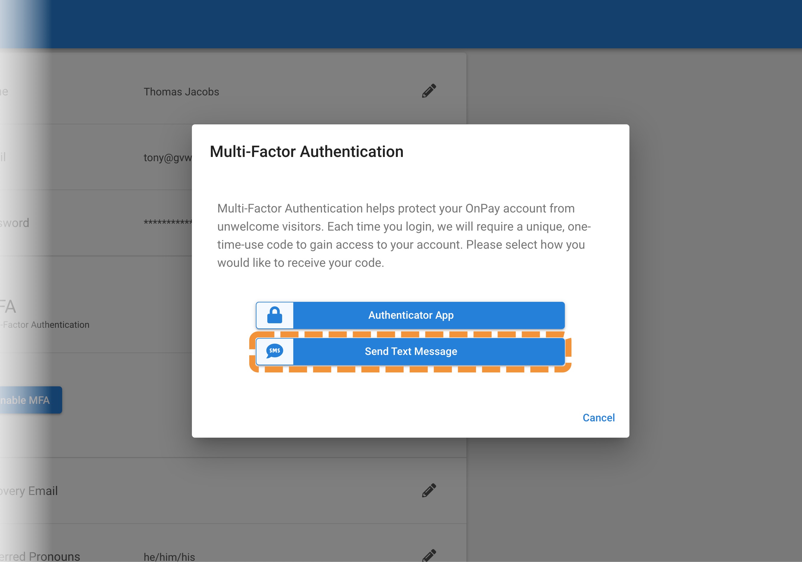 If you haven't already set it up for your account, you'll be prompted to choose how you'd like to generate your authentication code each time you log into OnPay.