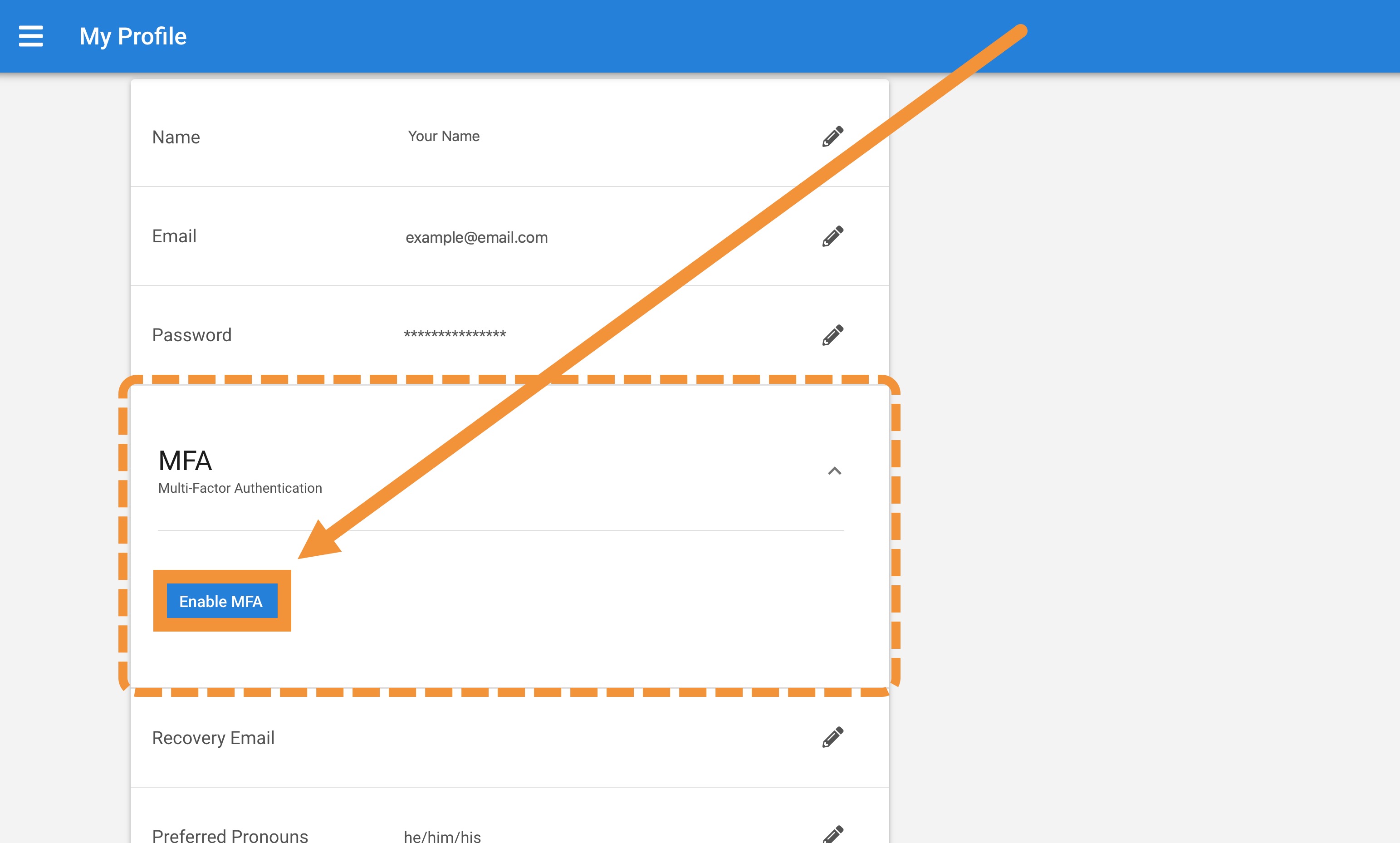 Here, you can edit your personal info, including name and email, add a recovery email, change your password, or add Multi-Factor Authentication (MFA) to your account.