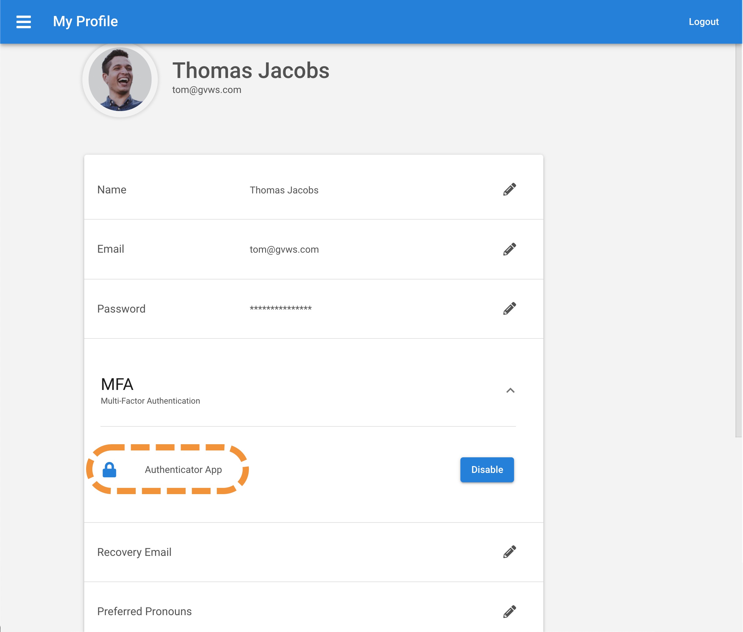 Once the valid code has been entered, this authentication method is listed in the "MFA" section of your profile.