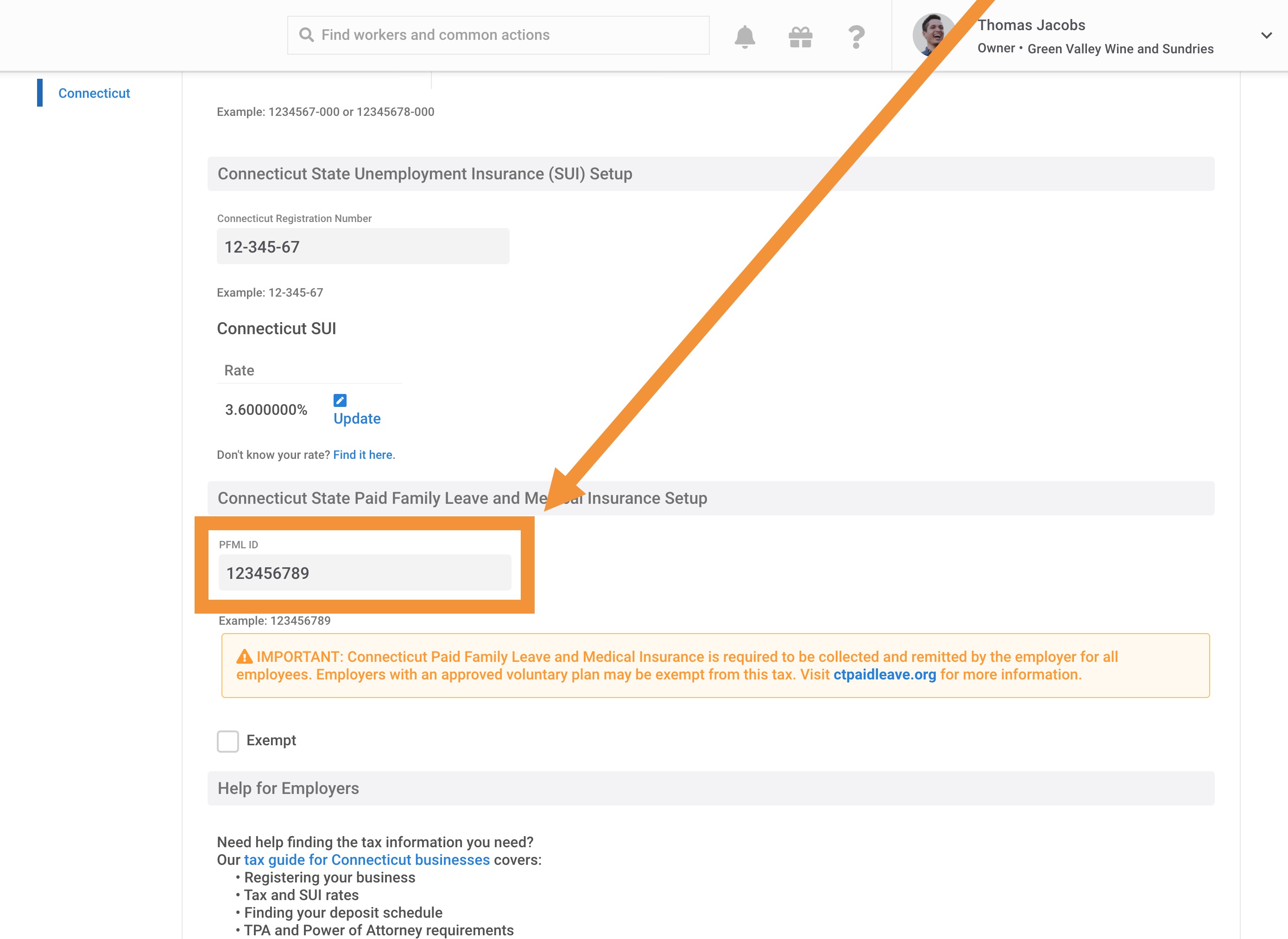 Scroll down to find the "Connecticut State Paid Family Medical Insurance Setup", and enter your PFML ID.