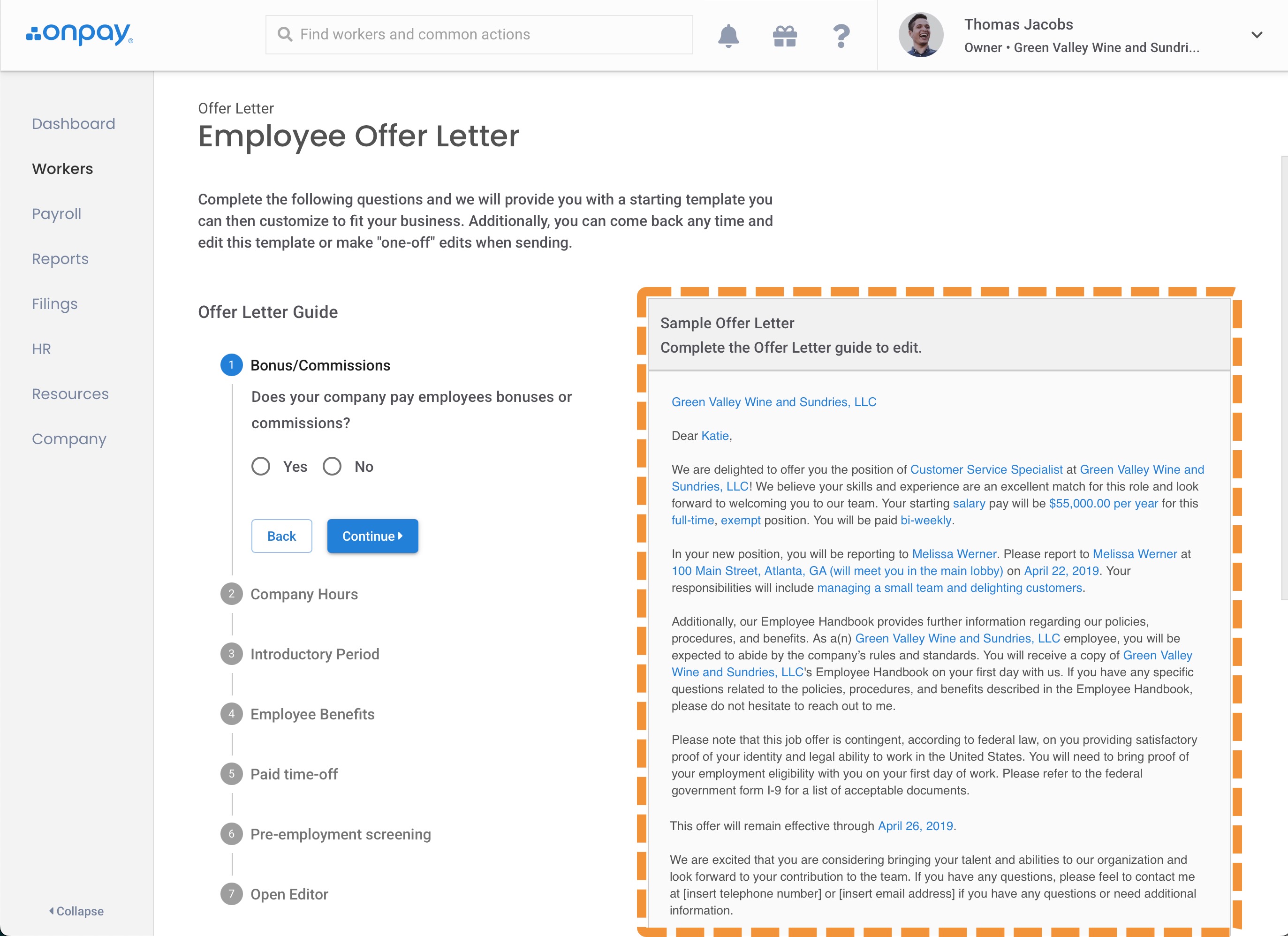 Rather than start with a blank page, the Offer Letter Guide lets you answer a few short questions about what it's like to work for your company, including work hours, benefits and time off, introductory or probationary period and background checks. This information is then used to populate text in the draft to the right as you continue through the survey.