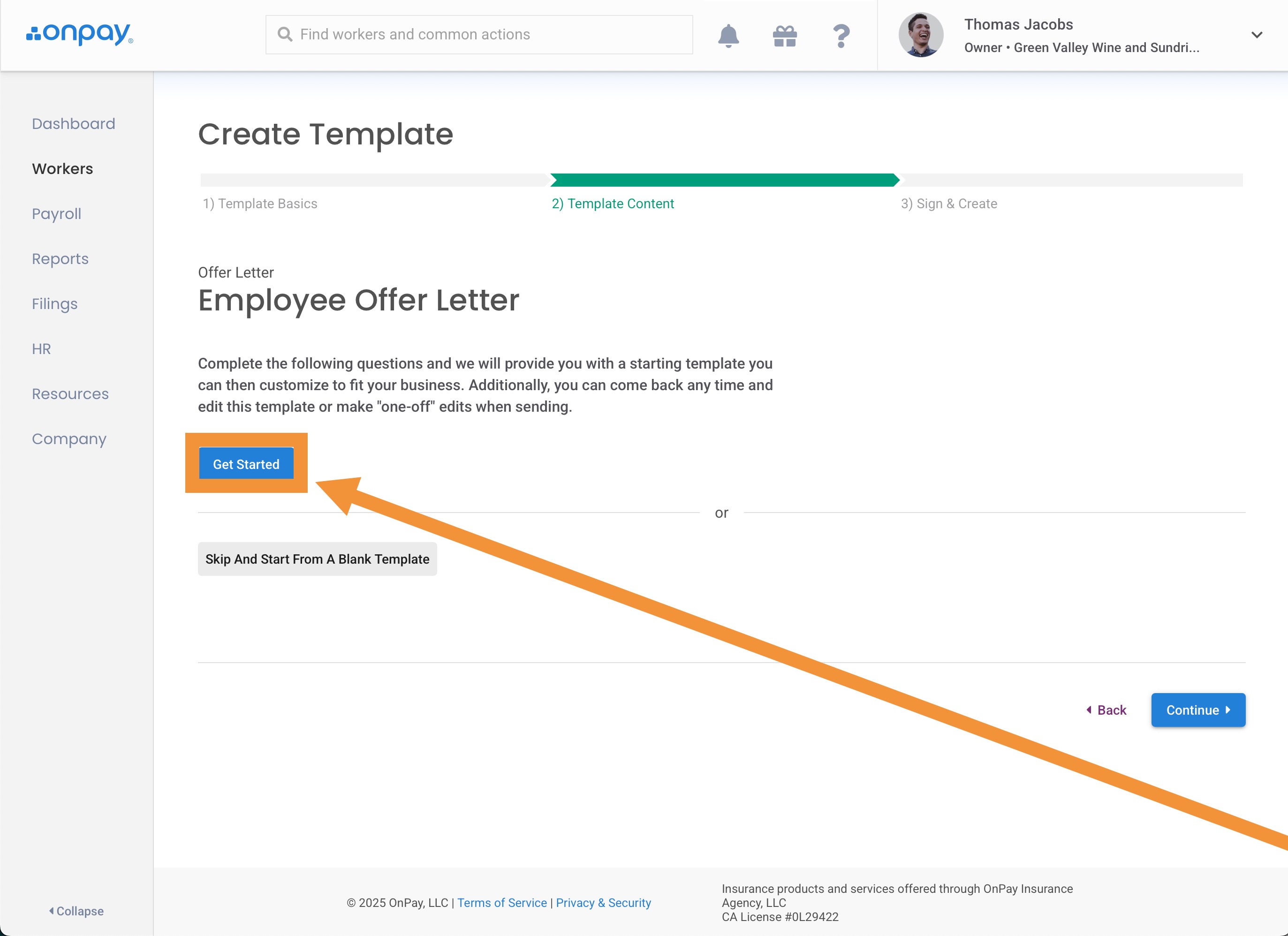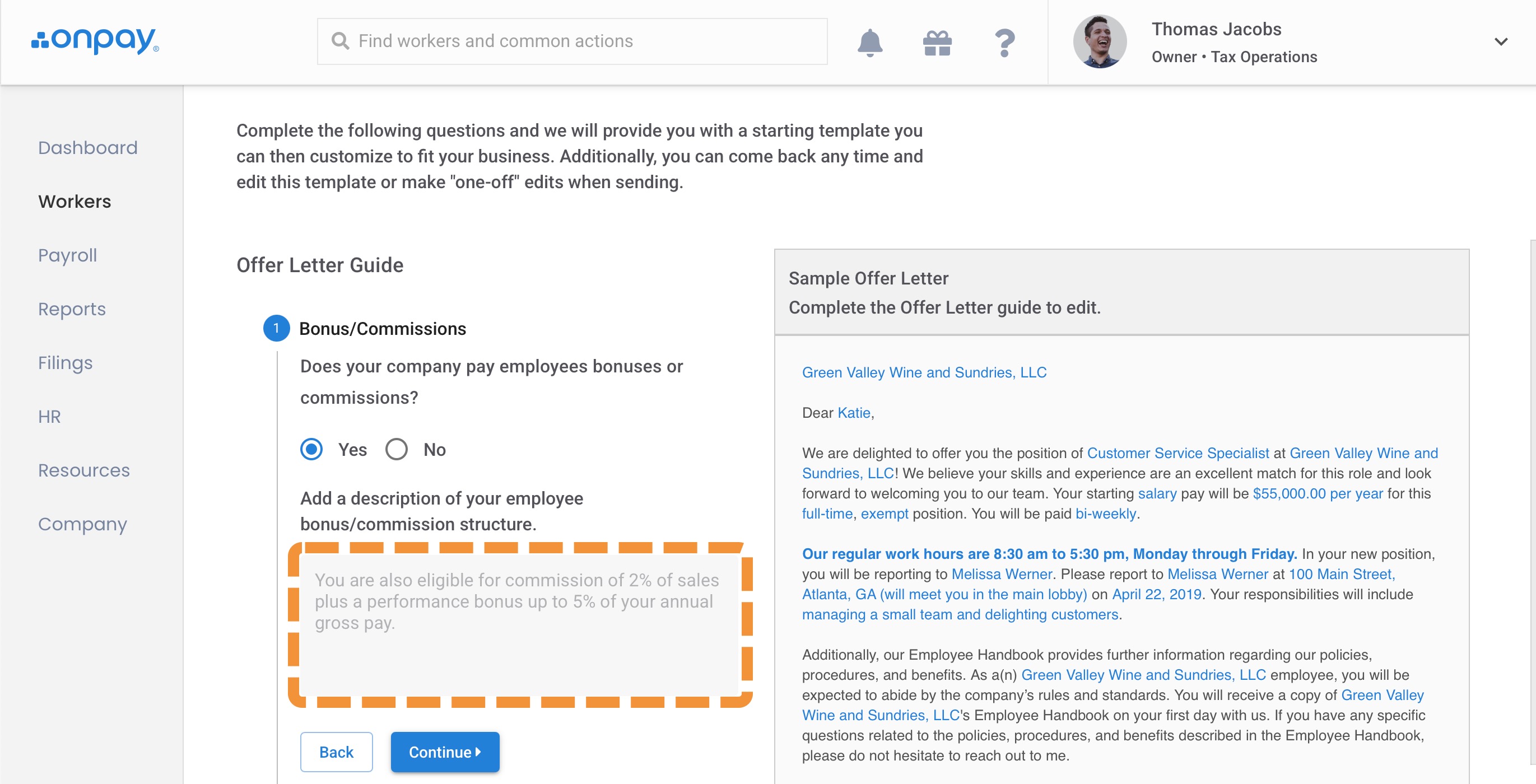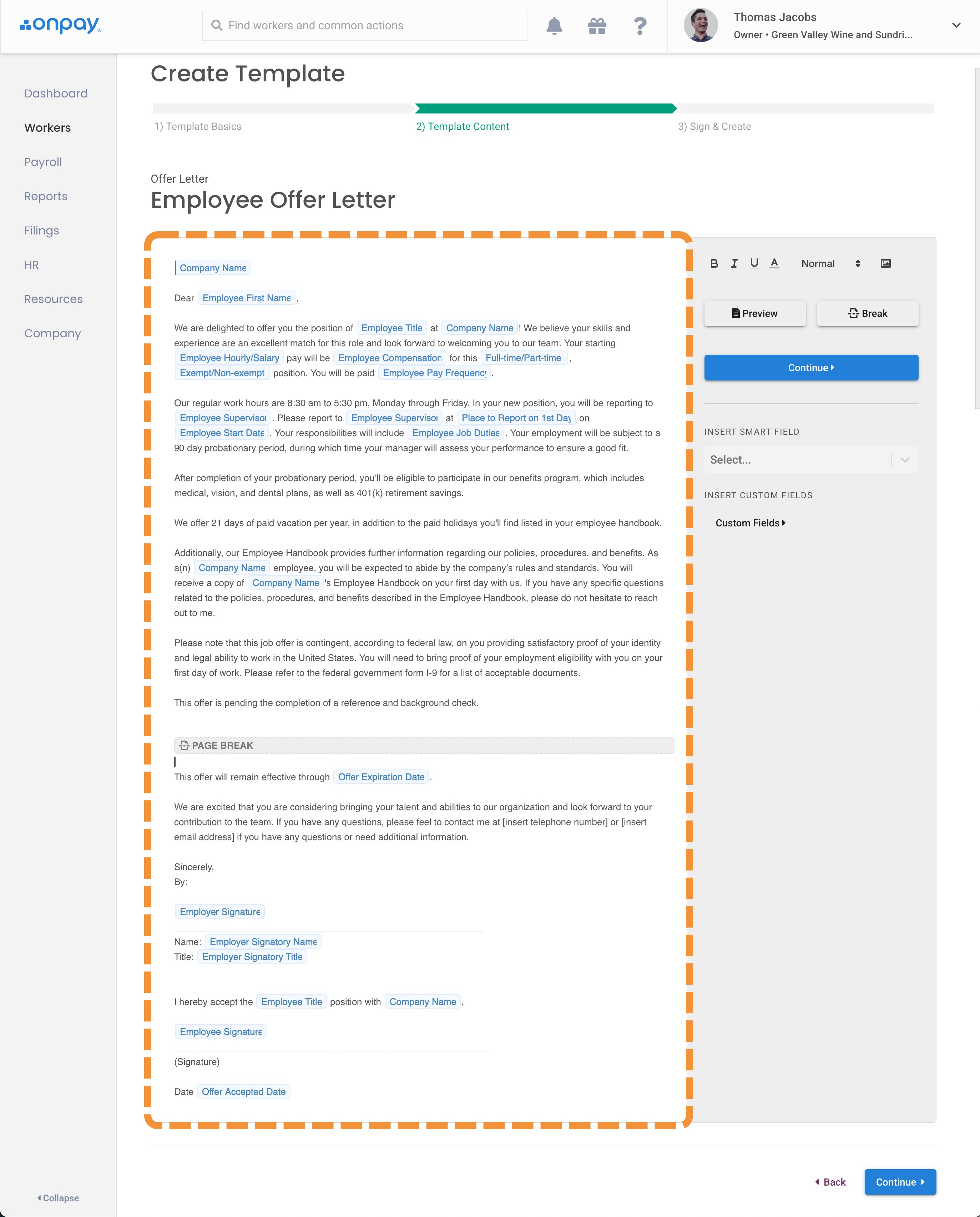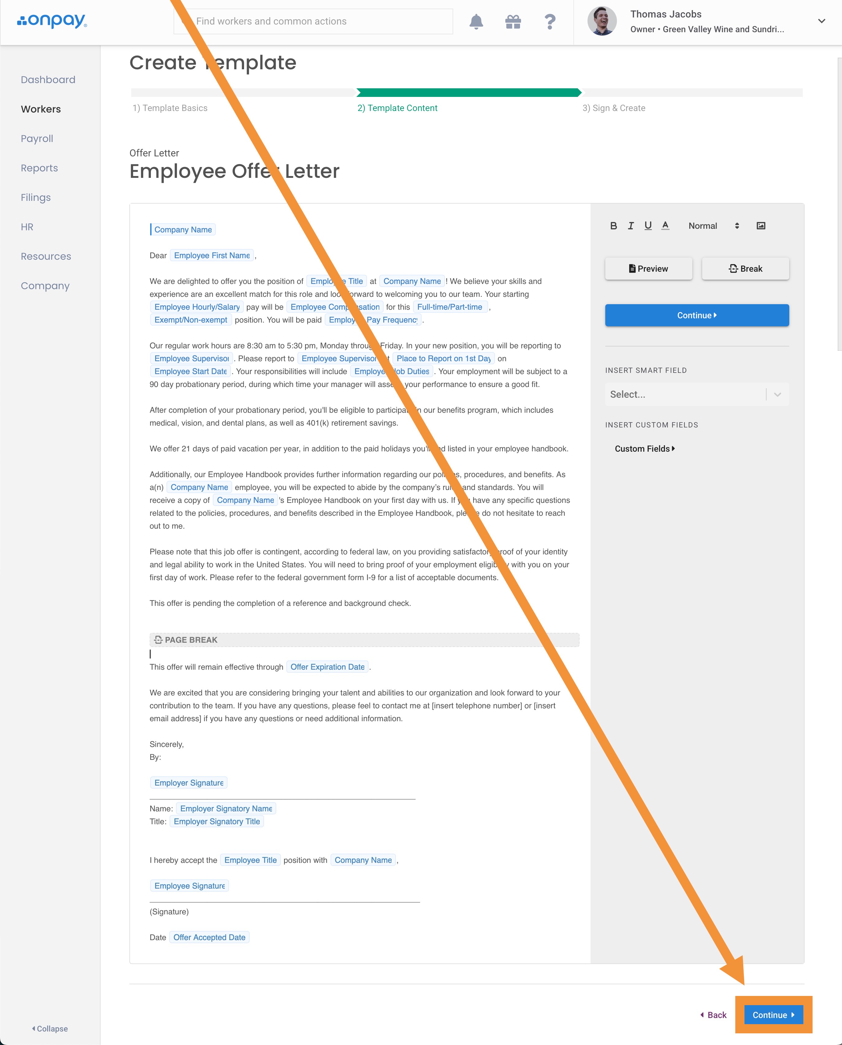 Click Continue after each step to see your descriptions populate in the body of your template in a bold, blue font. Don't worry, this font styling doesn't apply to the actual offer letters sent using this template, and you can always make changes to it later.