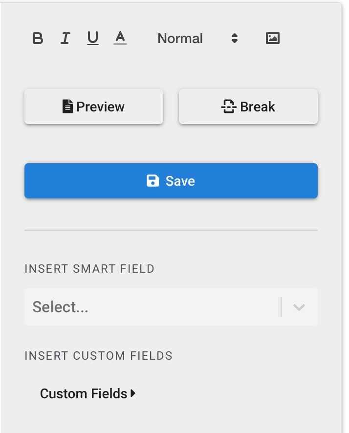 In the template editor, you can click anywhere in the body of the letter to edit or change the formatting of text, add images, or insert smart fields.