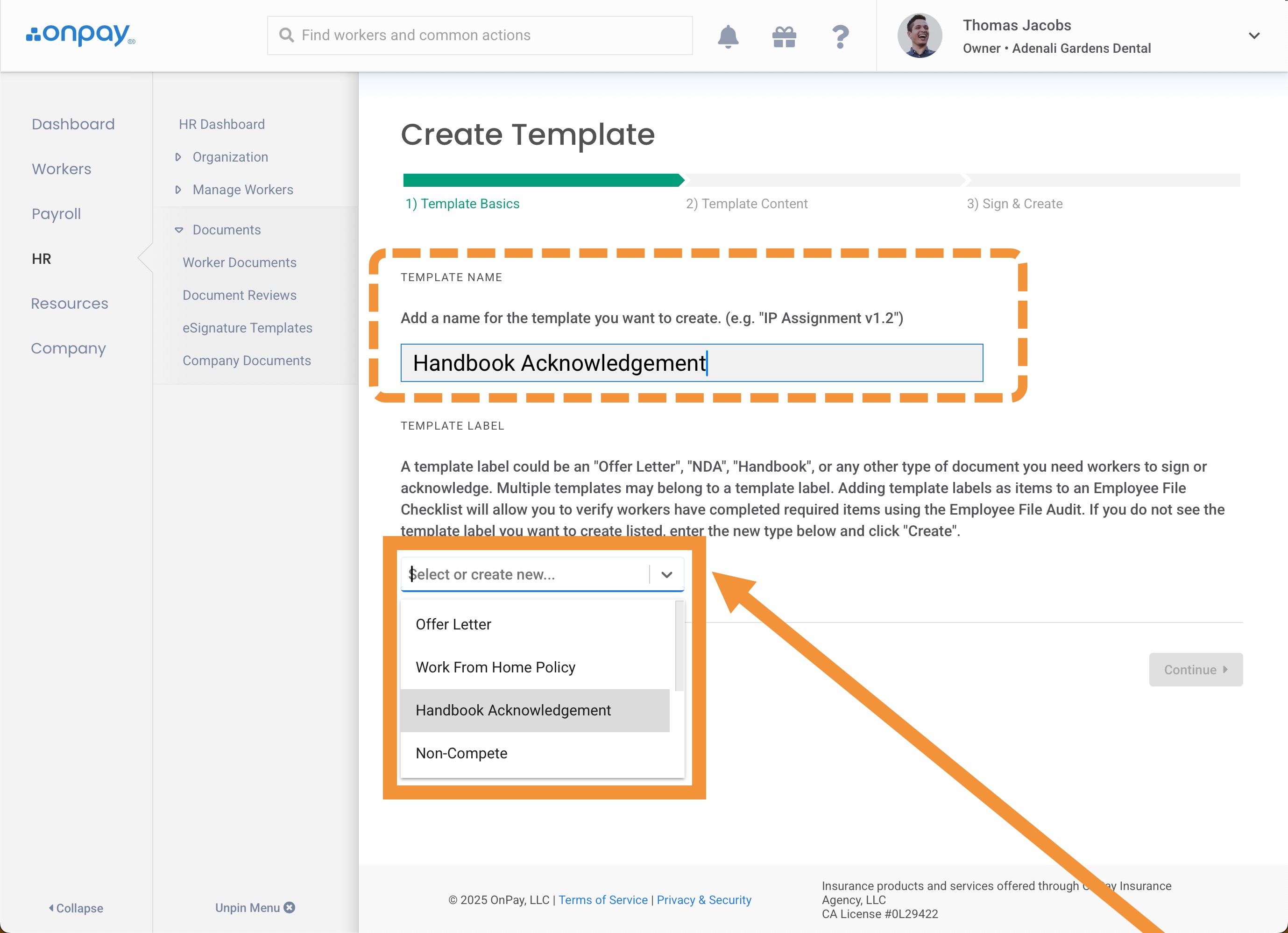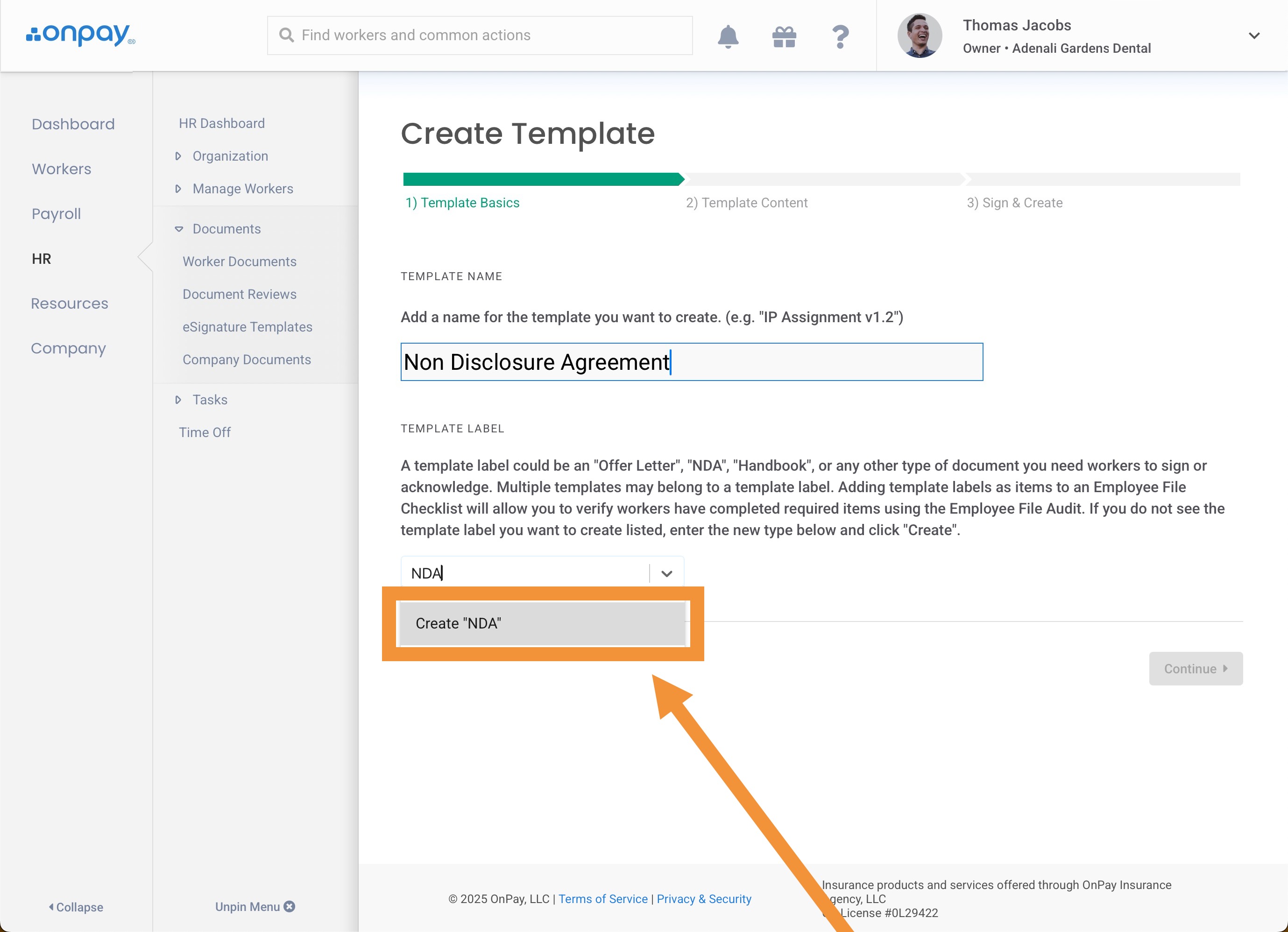 If you're not creating an Offer Letter Template, you can select another label, or type to create a new label, and click Continue to create additional eSignature Templates.