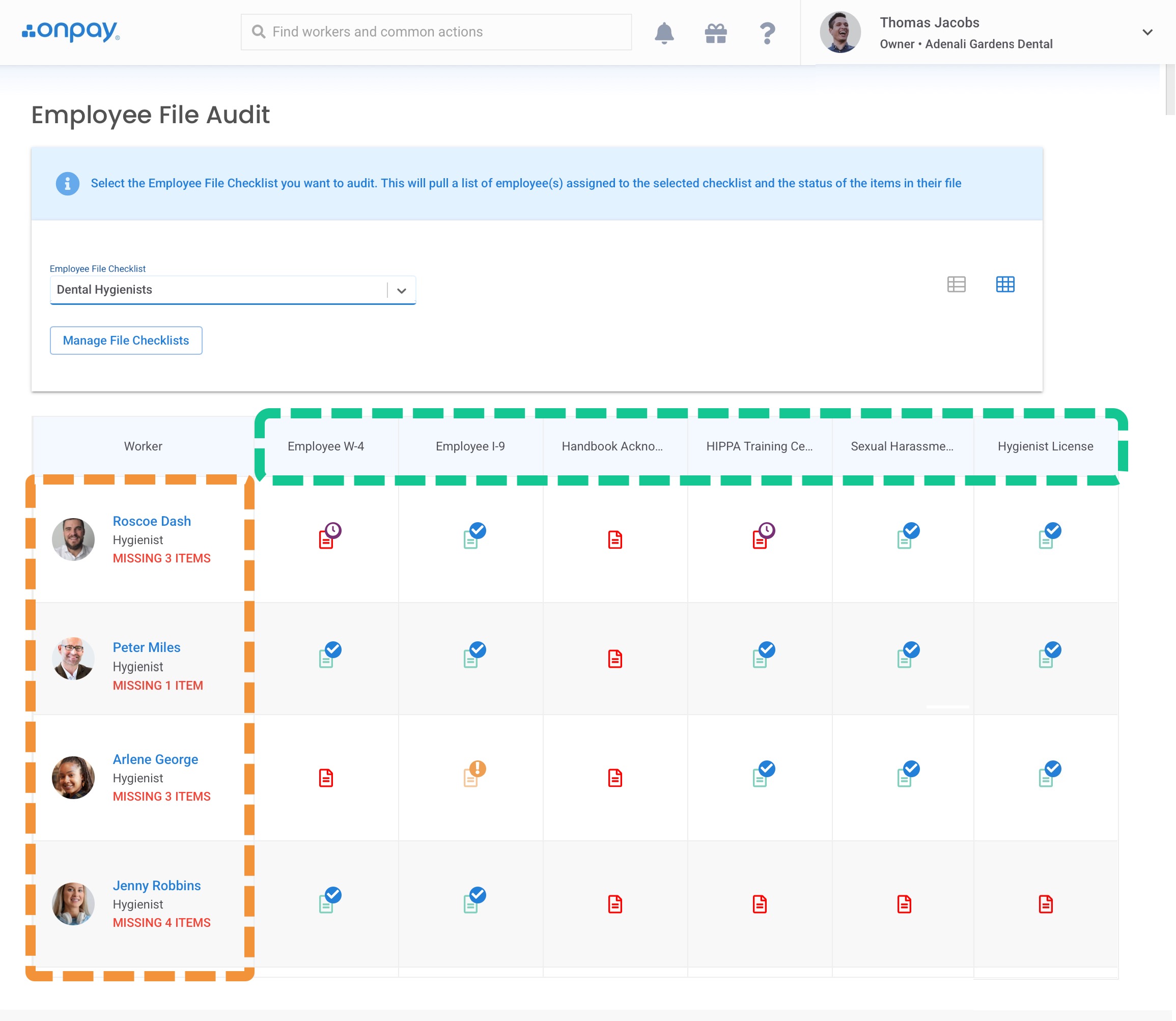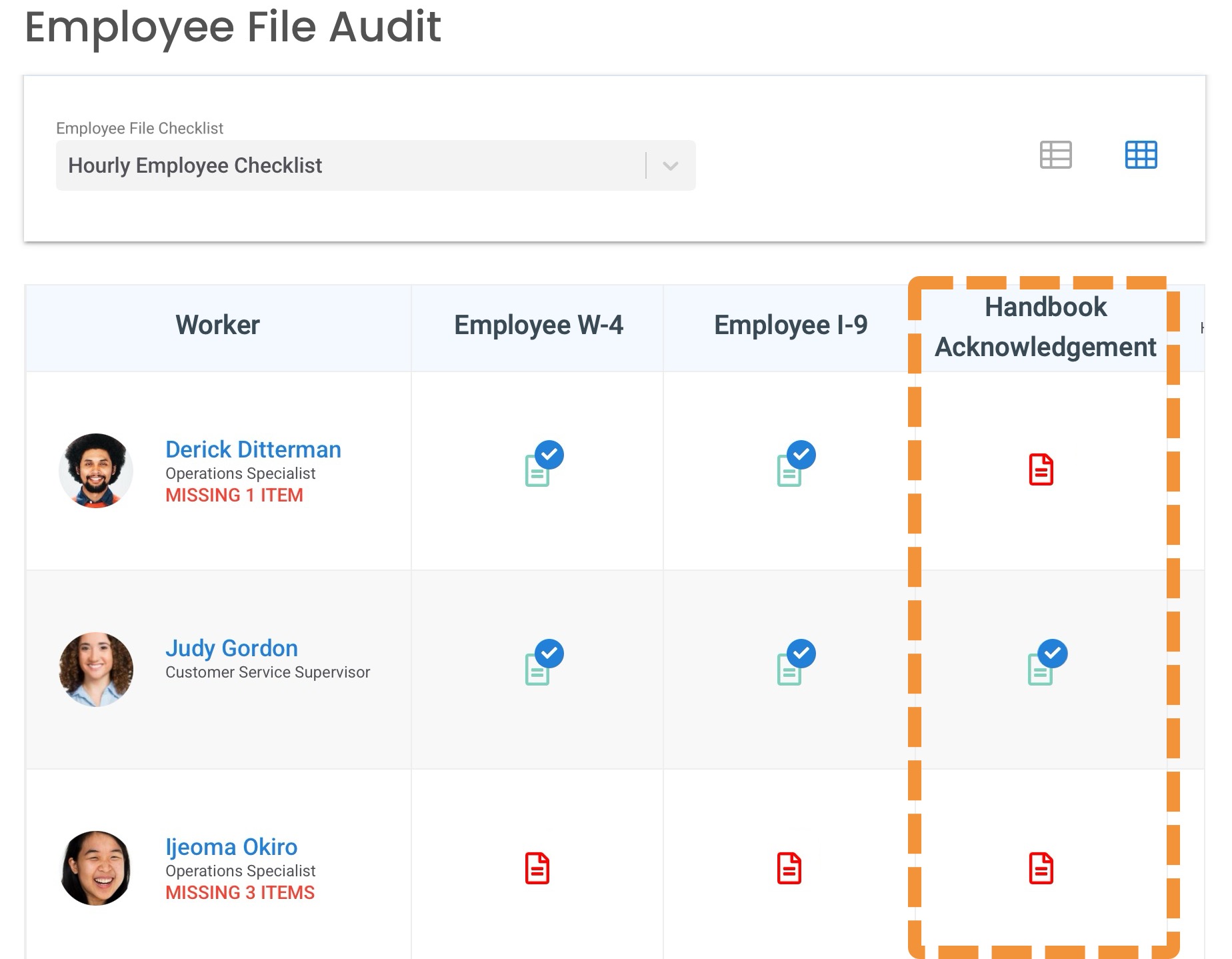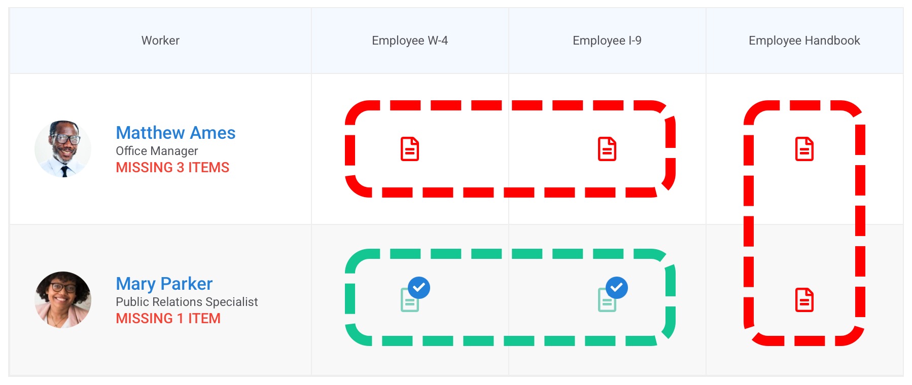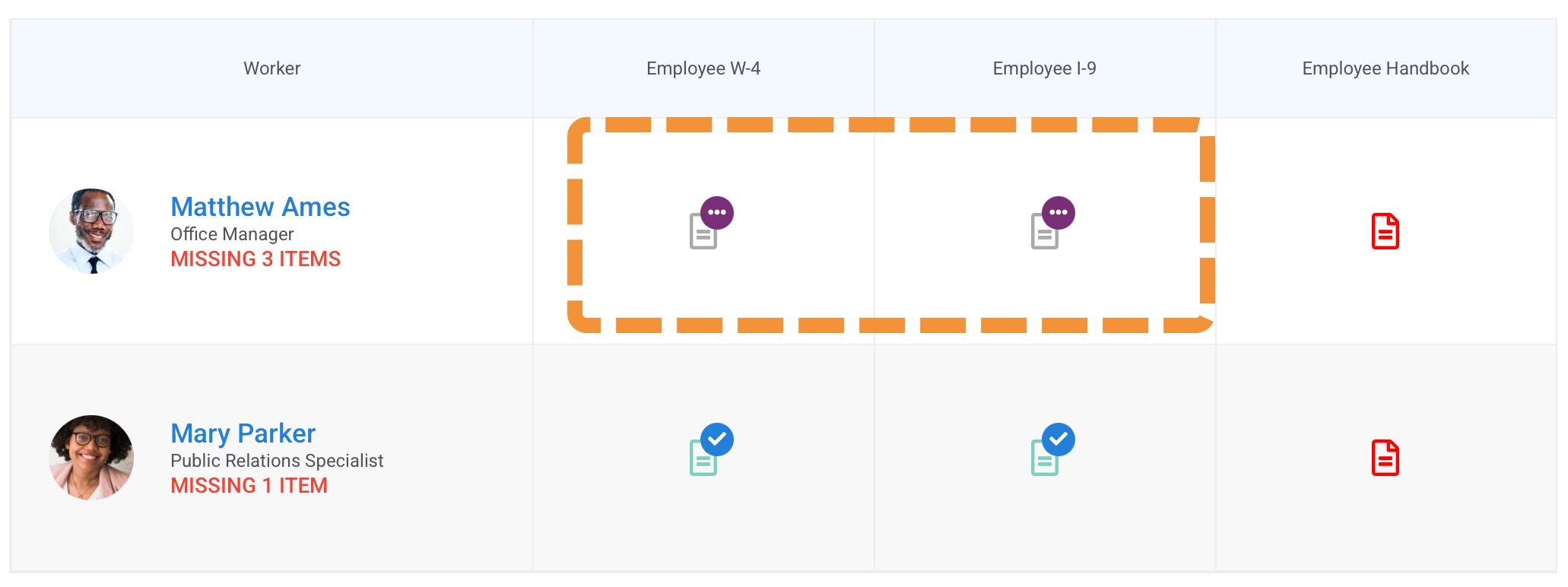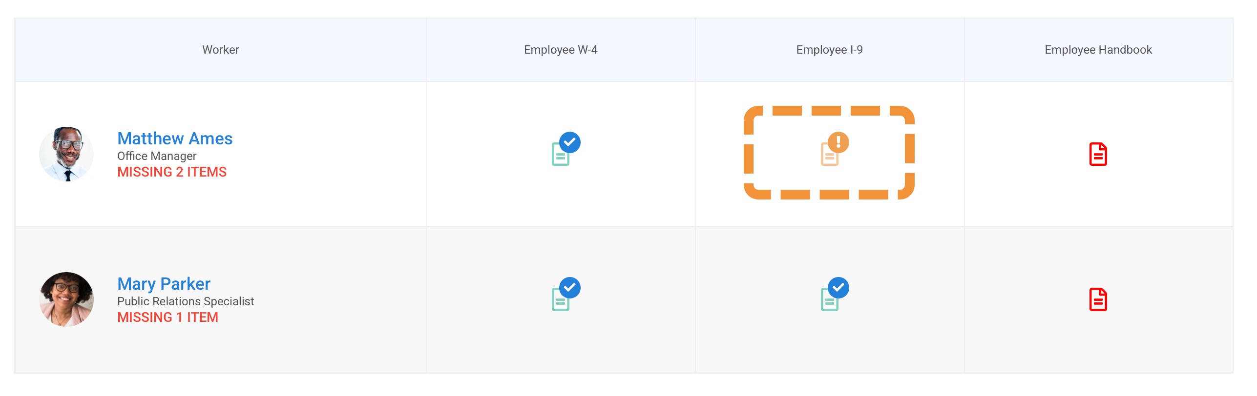In the example below, Forms W-4 and I-9 are missing for Matthew, but not for Mary, and they're both missing their employee handbook.
