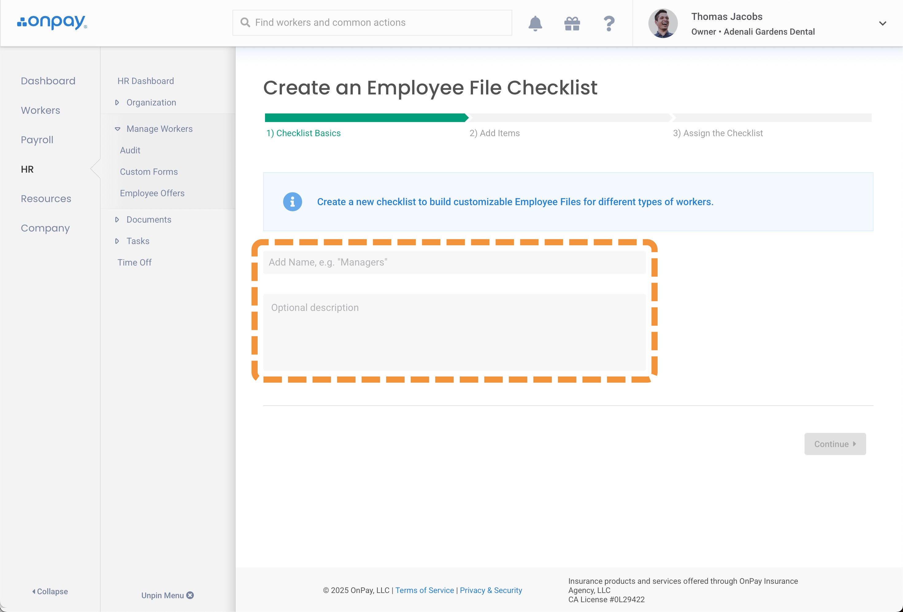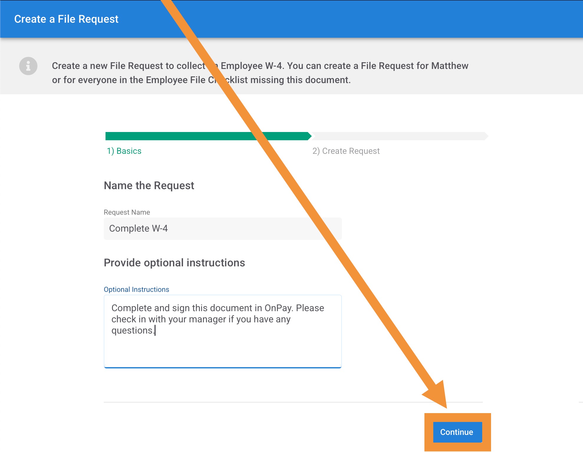 Give the request a name and instructions that tell your employee what they need to do, then click Continue.