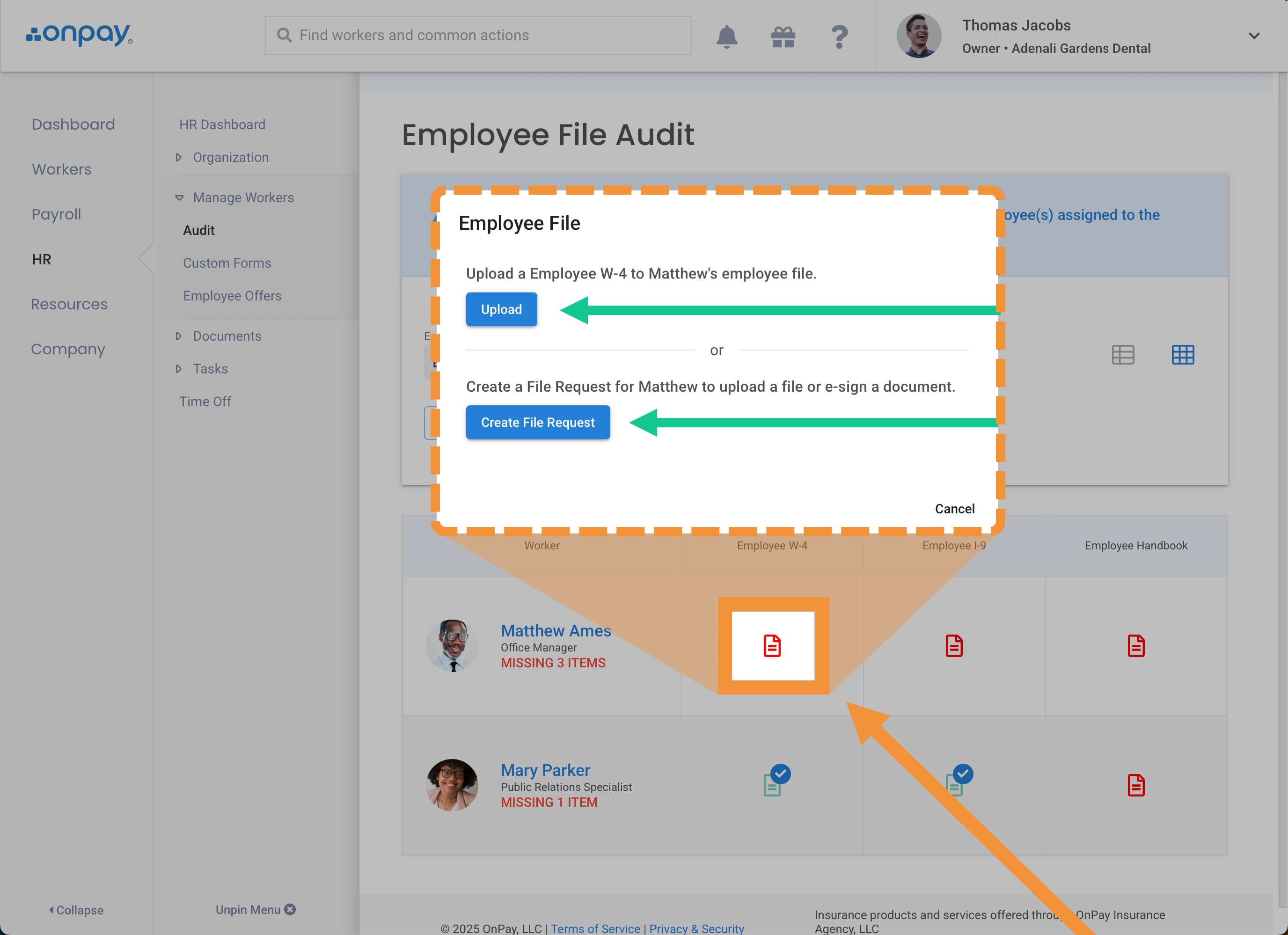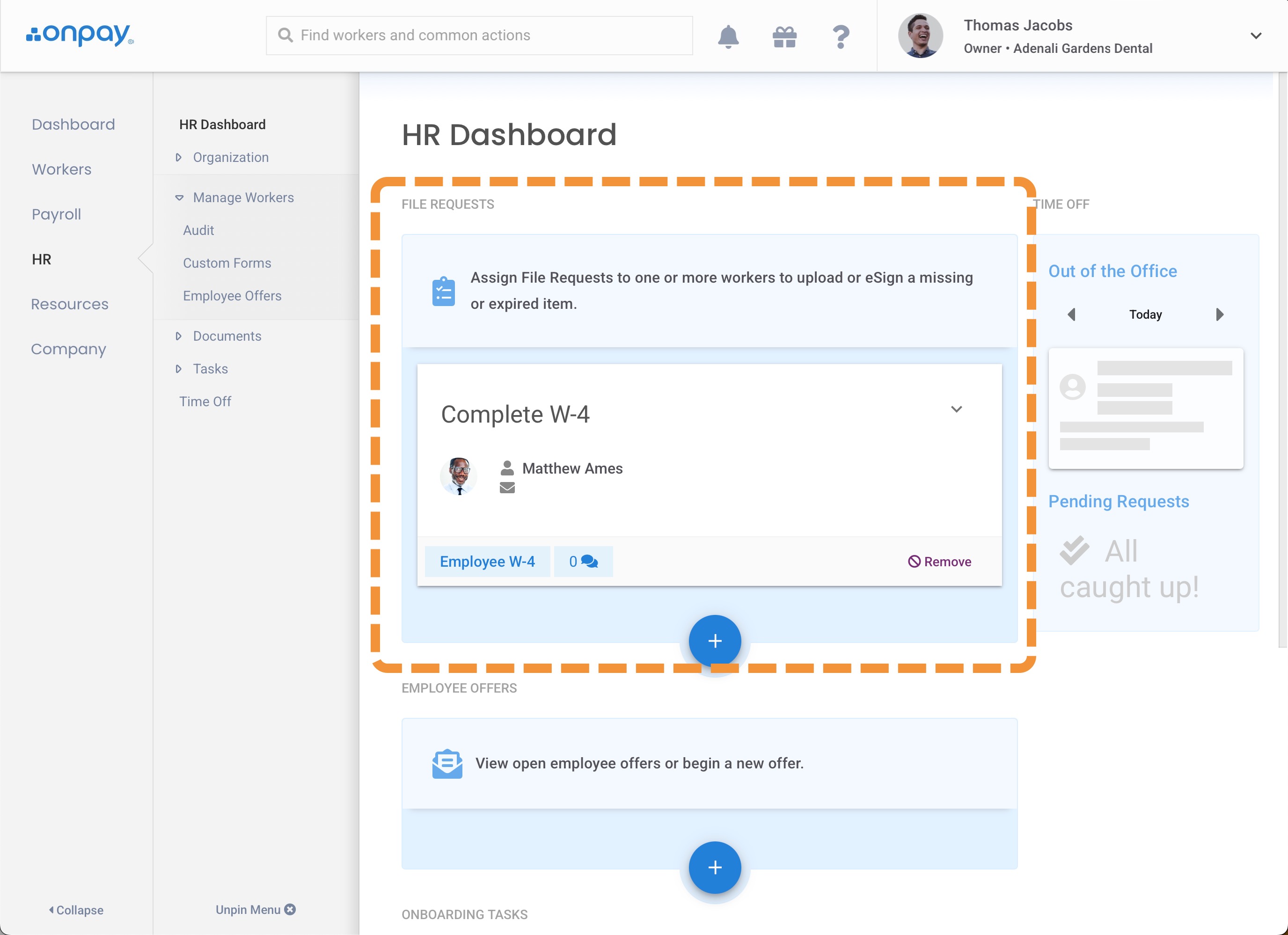 When you add HR to OnPay, you simplify the creation, collection, and retention of employee documents, with custom templates, automated workflows, secure storage, and a sophisticated file audit to help you keep up with it all. You're also able to manage File Requests, Employee Offers, Onboarding Tasks, and Time Off Requests, right from your HR Dashboard.