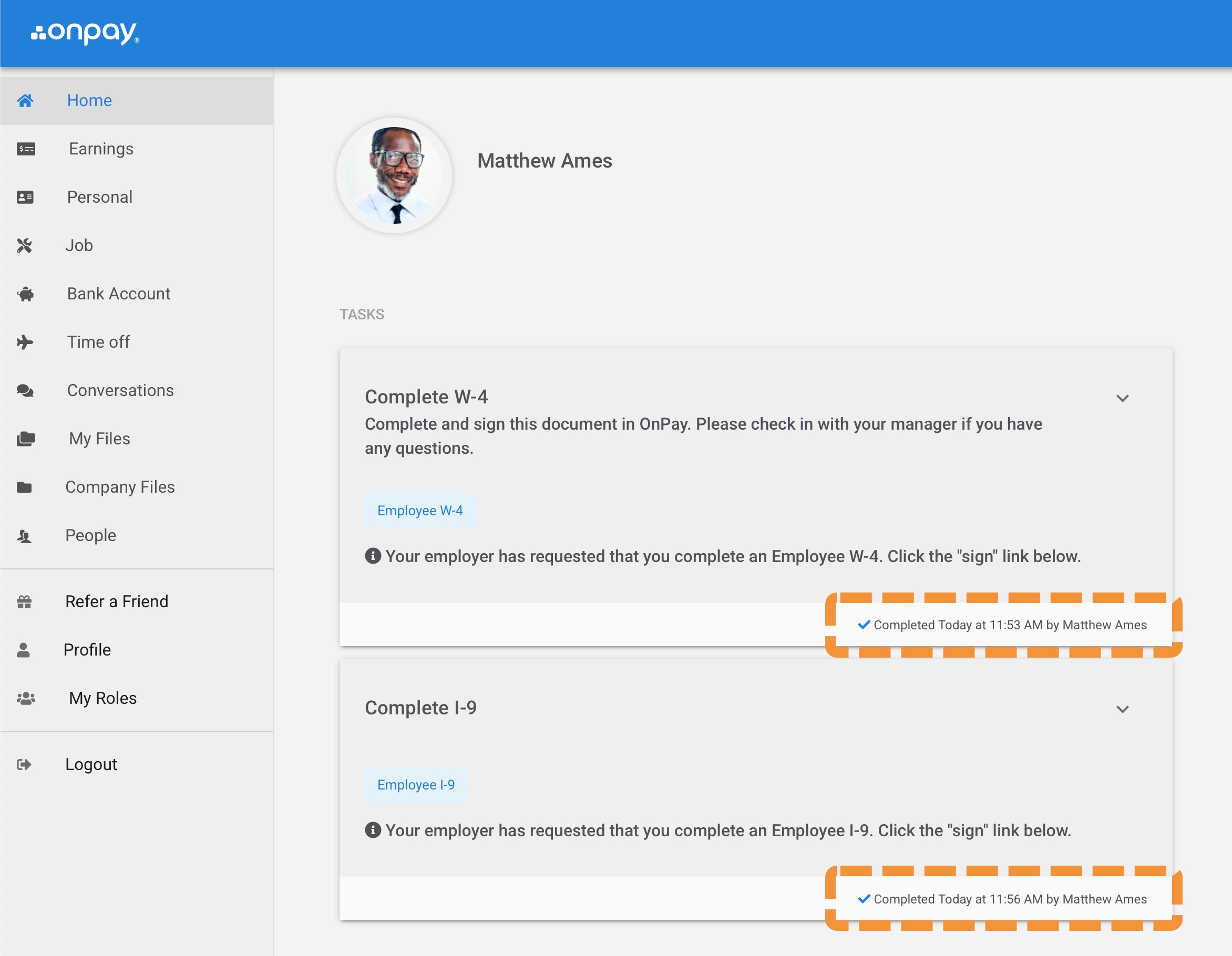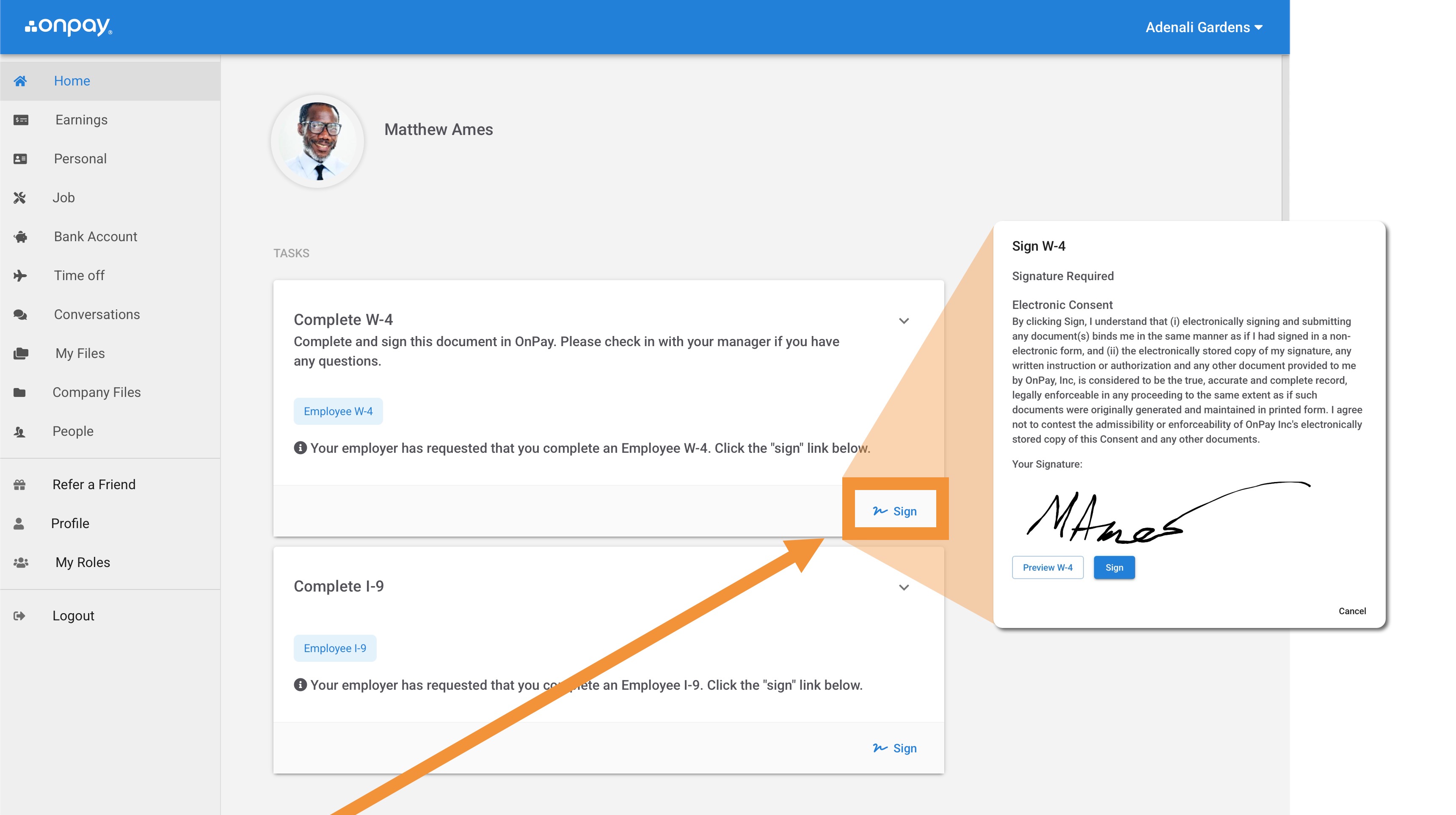 When they log into their employee portal, they'll see their tasks on their homepage, with instructions for completing each request. Employee forms and eSignature templates are signed digitally, right in OnPay.