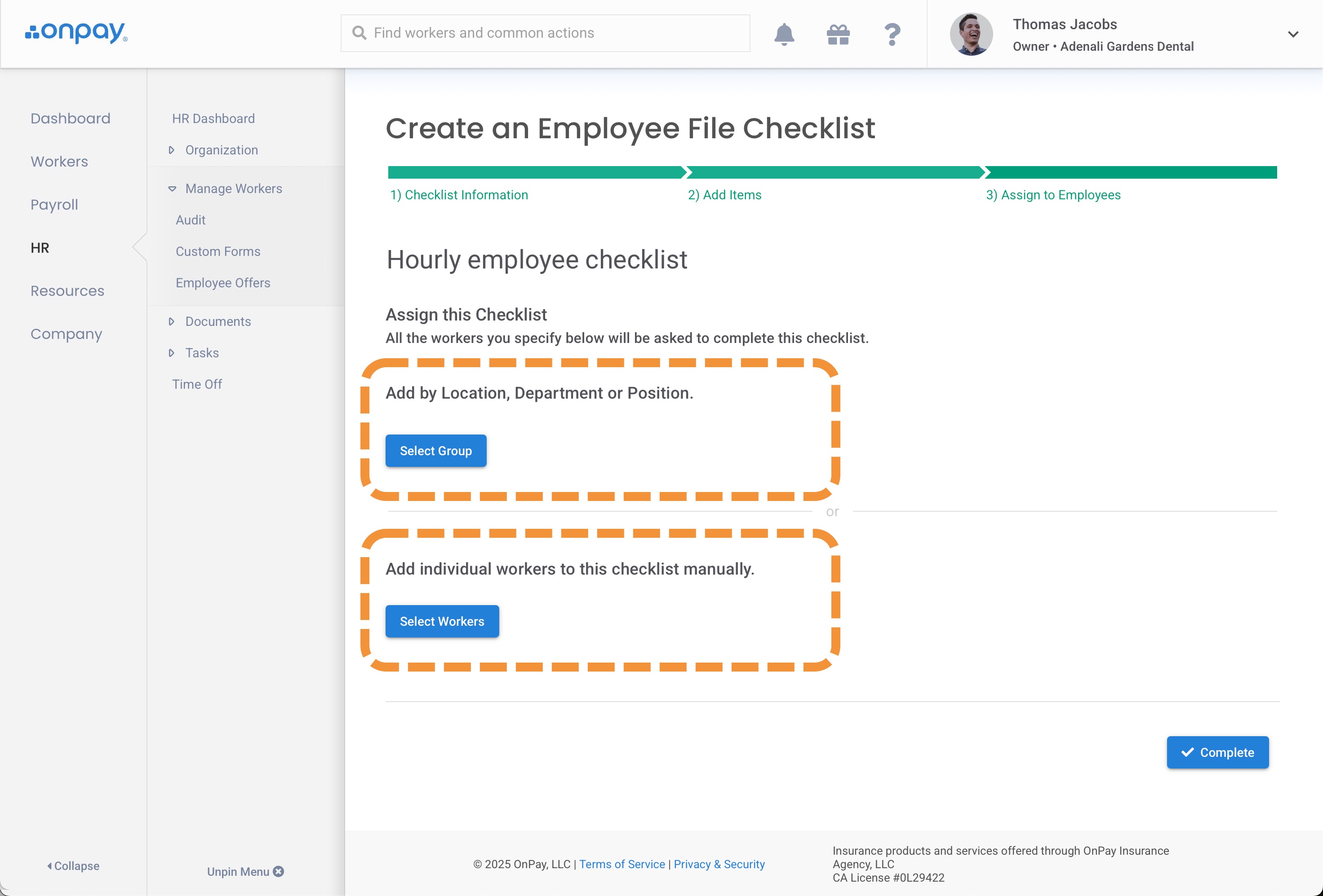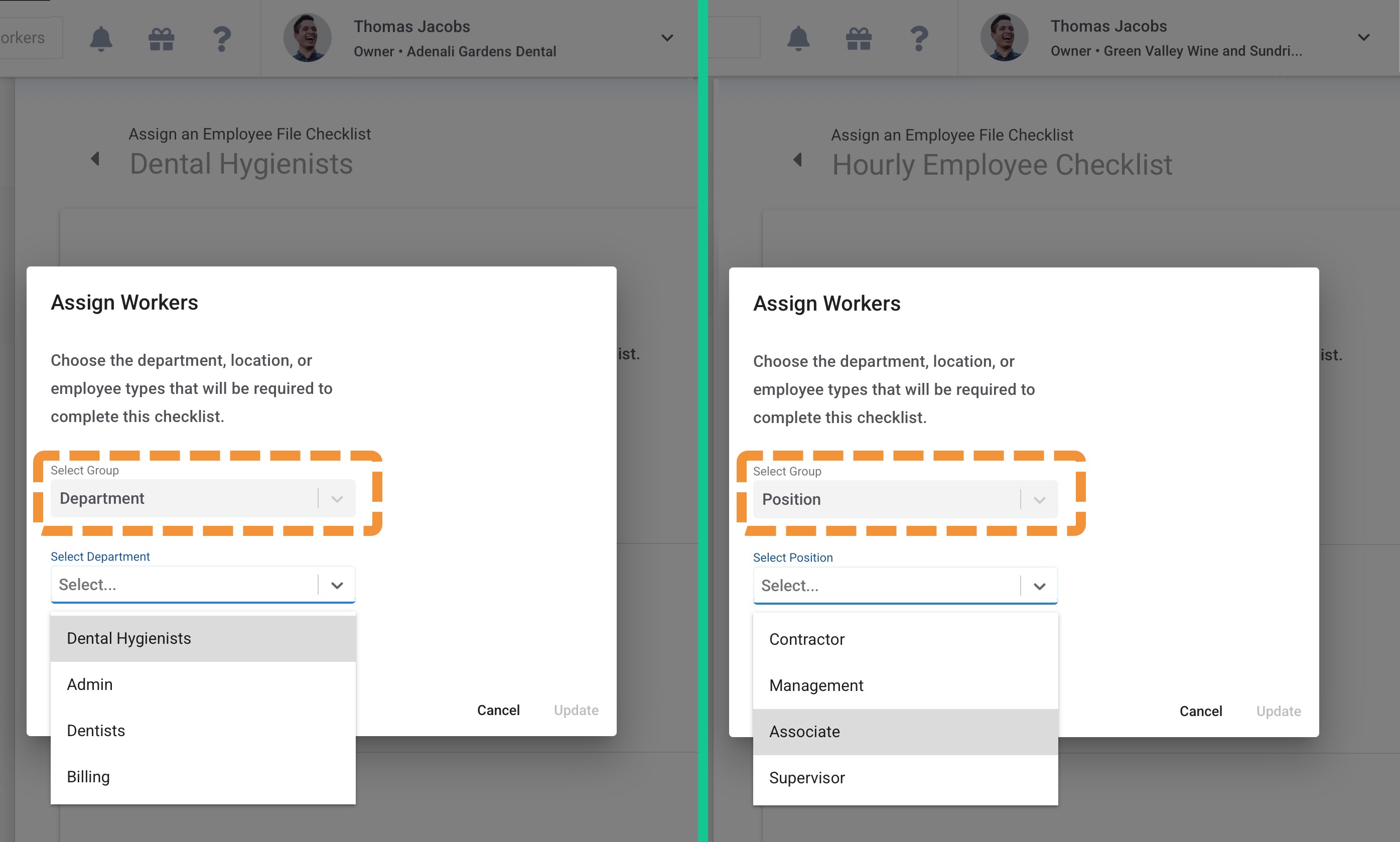 In this example, we have two different companies, a dental practice (left) and a convenience store (right). The dental practice has assigned employees to departments in their OnPay profiles, so they're assigning their checklists by "Department". But the convenience store doesn't have multiple departments, just different positions within the store, so they're assigning their checklists by "Position".