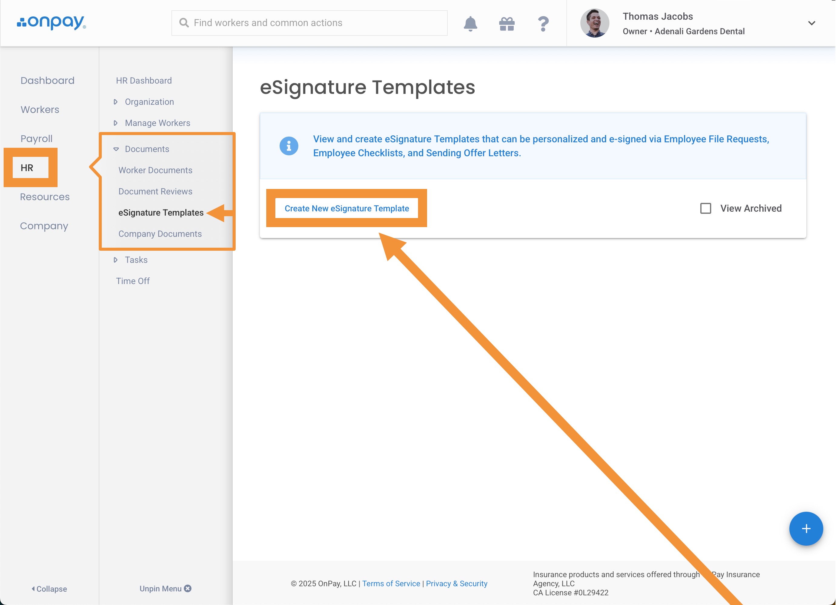 Go to HR, then Documents, then eSignature Templates, and click Create New eSignature Template.