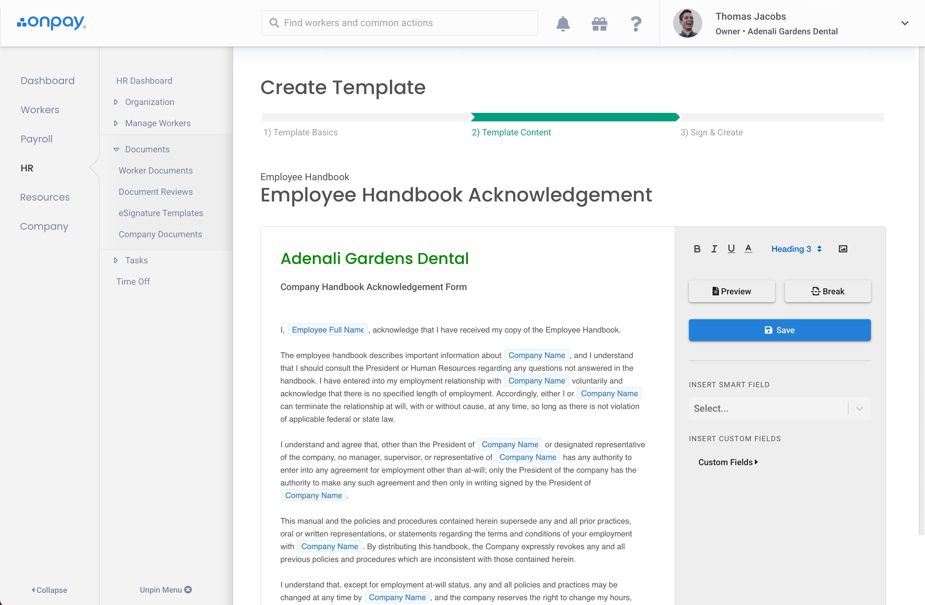 You can type to draft your document, or copy/paste text you have from an existing version, and add smart fields to generate personalized eSignature documents for employees to sign and return.