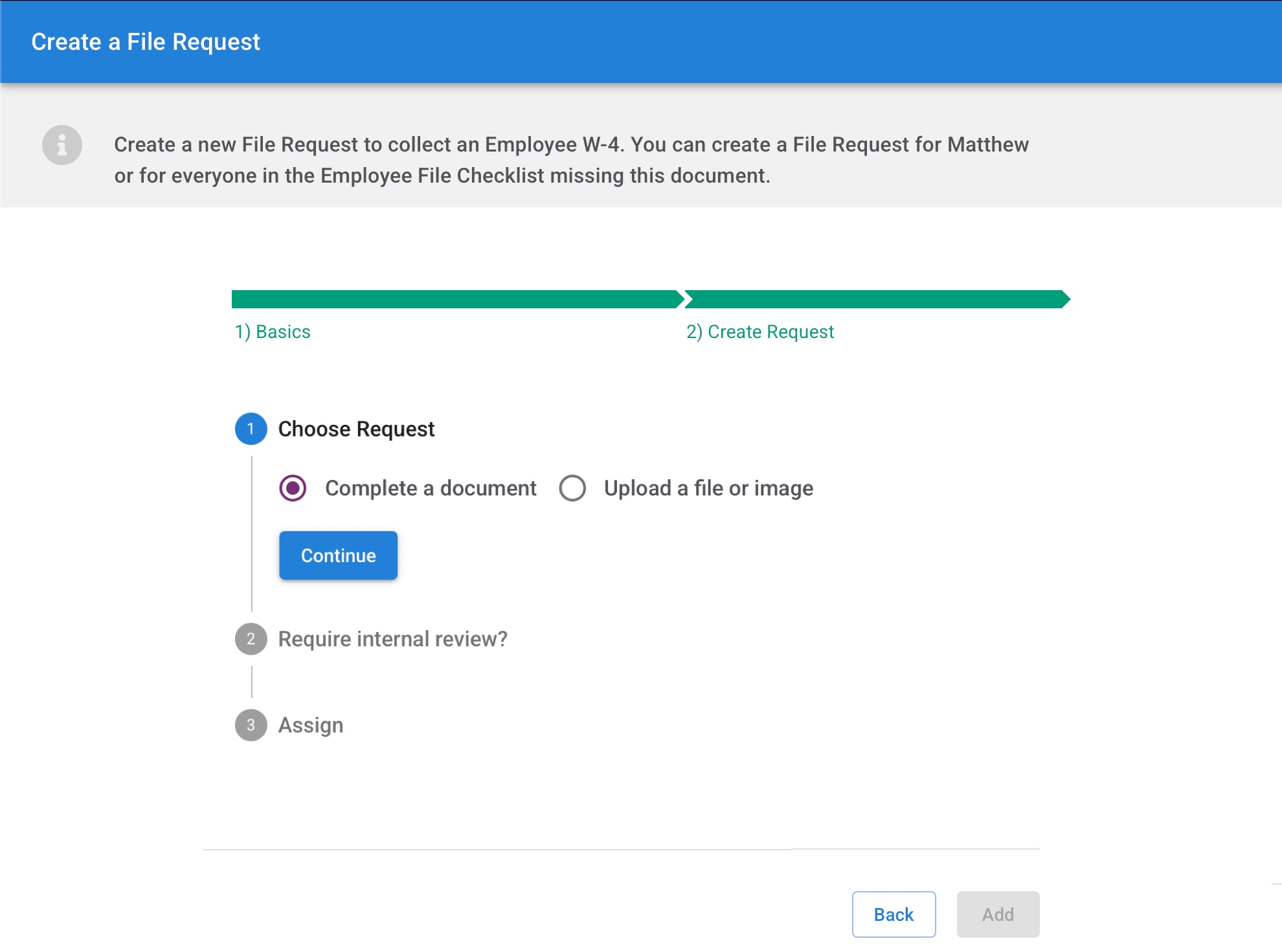 File Requests let you templatize and automate the communication and instructions involved in collecting HR documentation. Start by giving the employee(s) basic information about what's needed, then set up rules for how this request should be satisfied. File Requests can be assigned to an individual, or a group of employees, and you can even assign a supervisor to review.