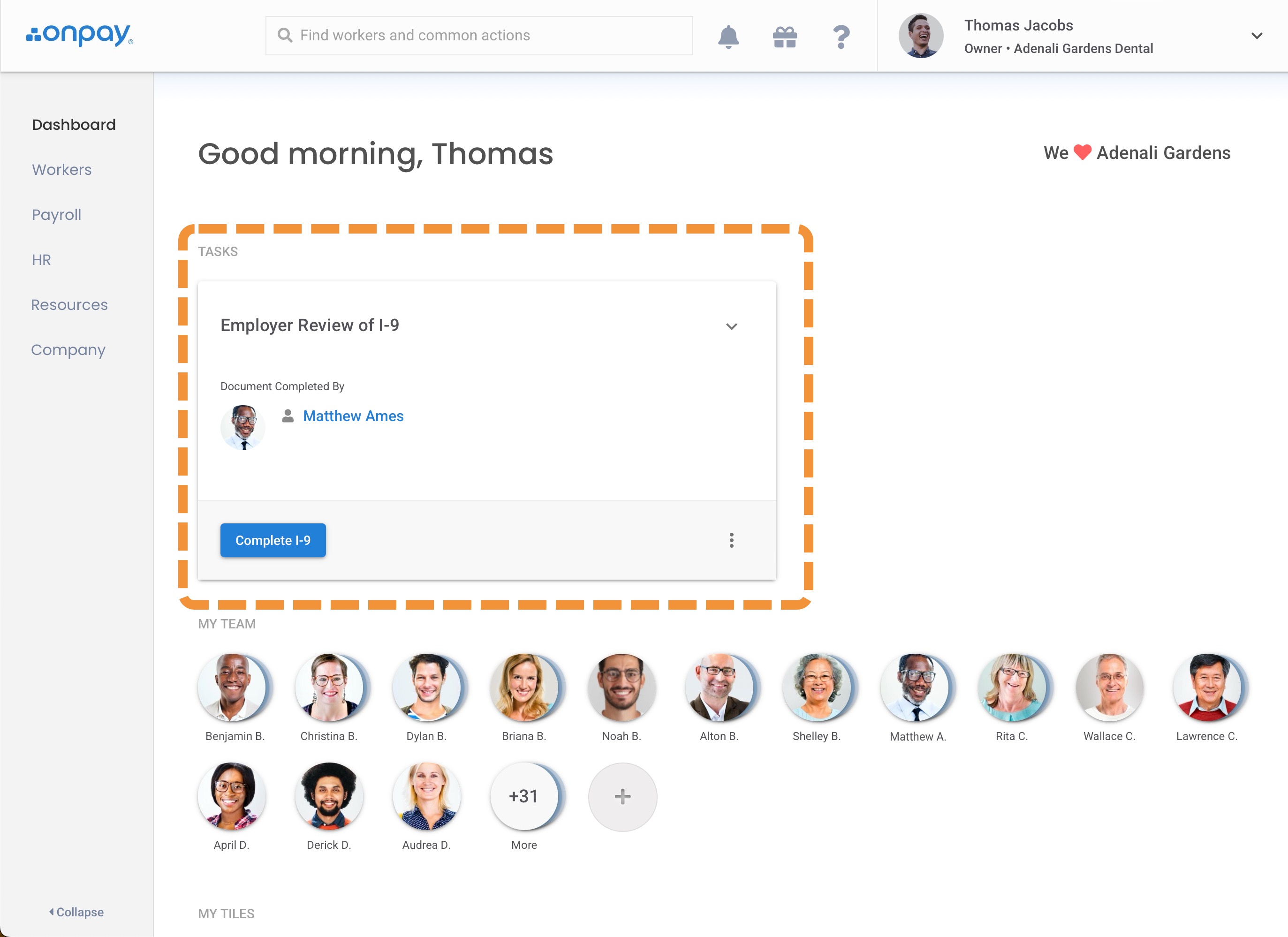 Note that both the W-4 and I-9 are marked as "complete" for the employee in the above example. The W-4 doesn't require review, but the I-9 does.