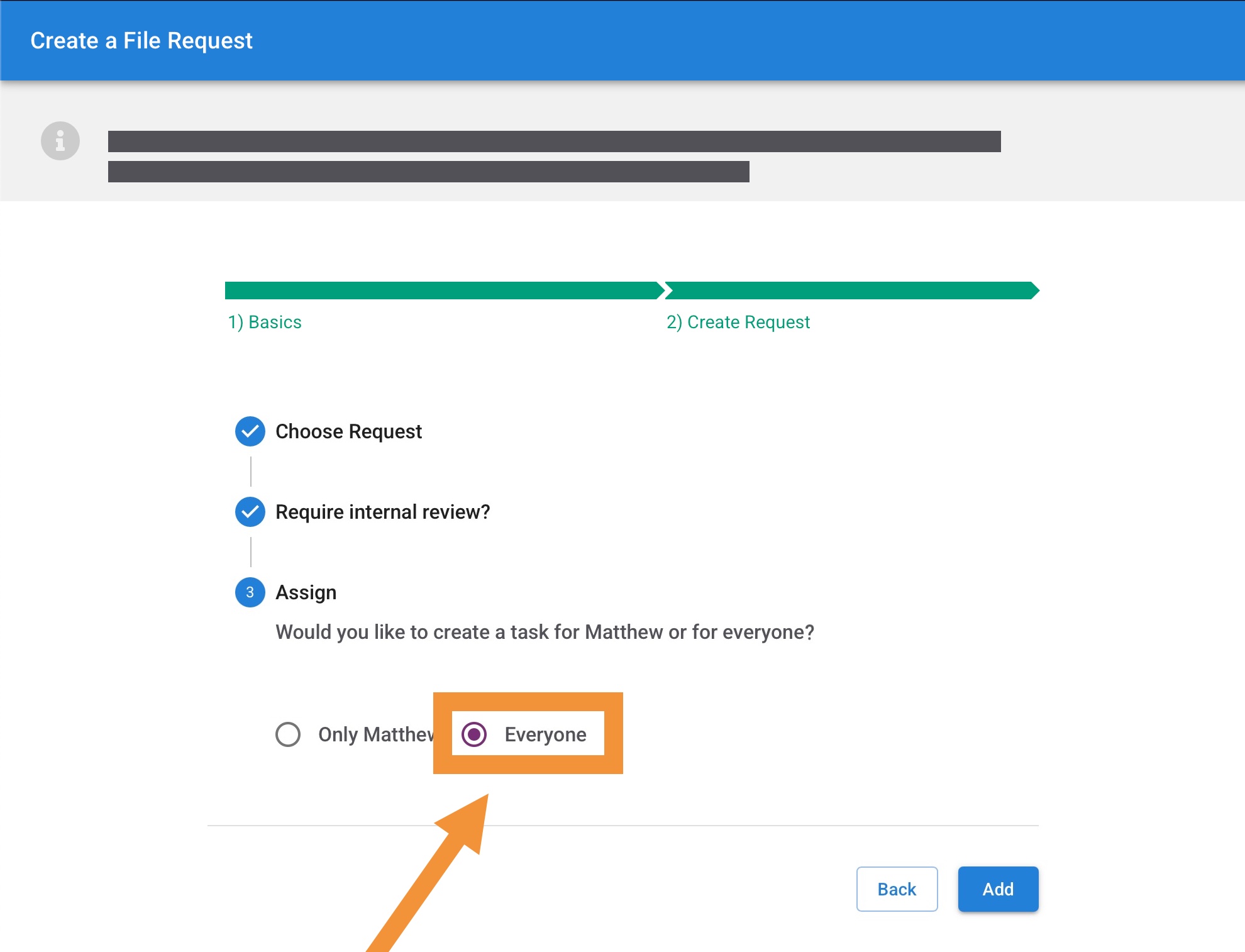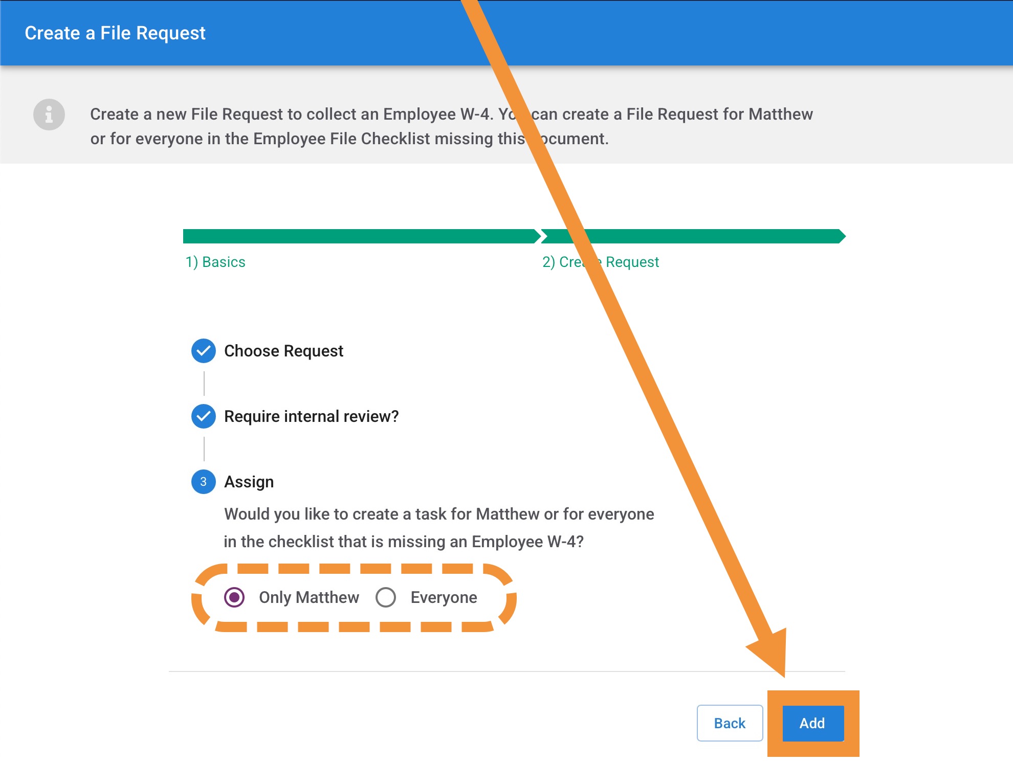If this employee is the only person missing this document, then leave only them selected. If others are also missing this document, select Everyone to automatically replicate this request for anyone who's missing this document in the File Audit.