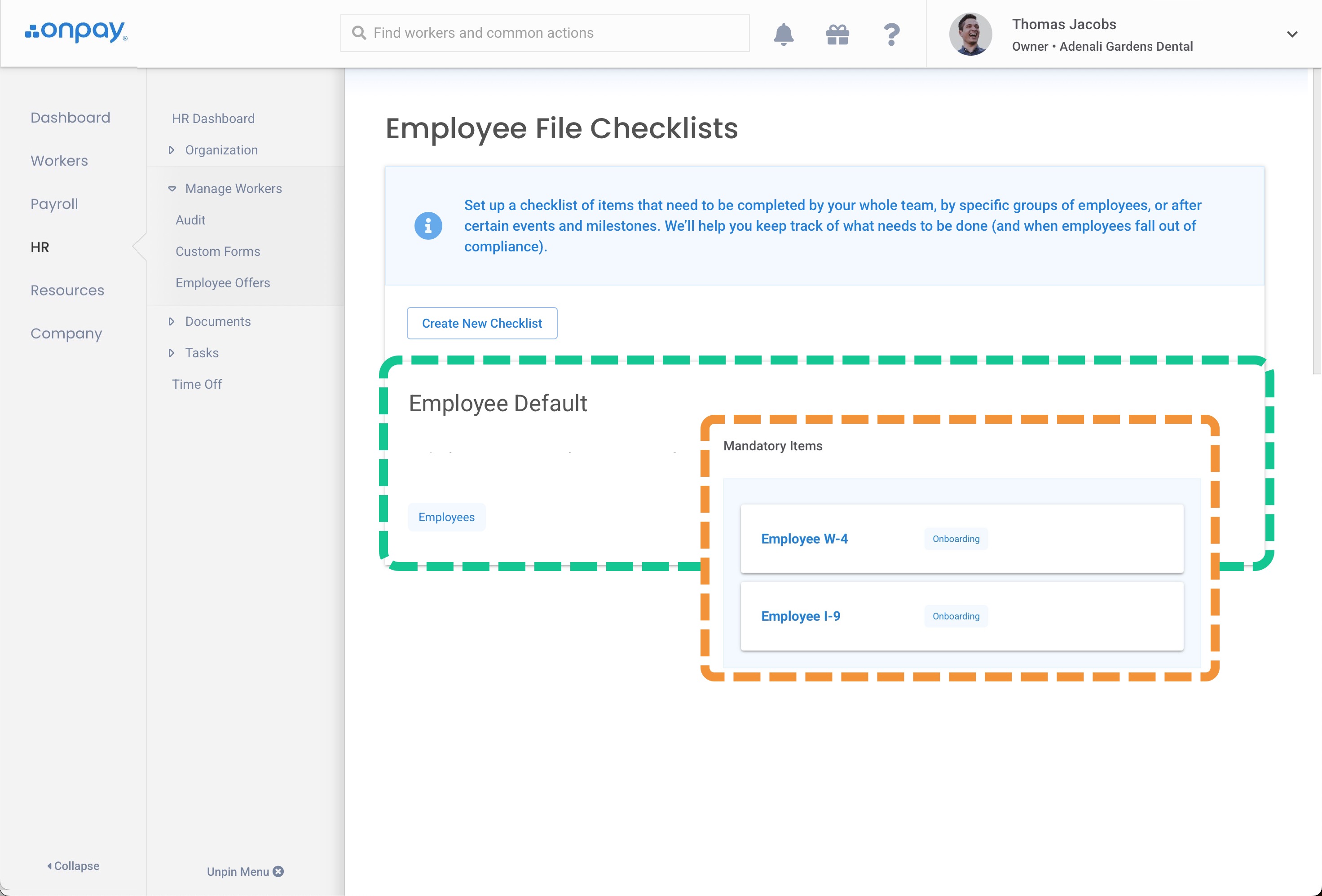 Every checklist includes Forms W-4 and I-9, two mandatory items that must be completed by each employee, and kept on file by the company. And while the "Employee Default" checklist only includes these forms, you can create new checklists and include other items you need to track.