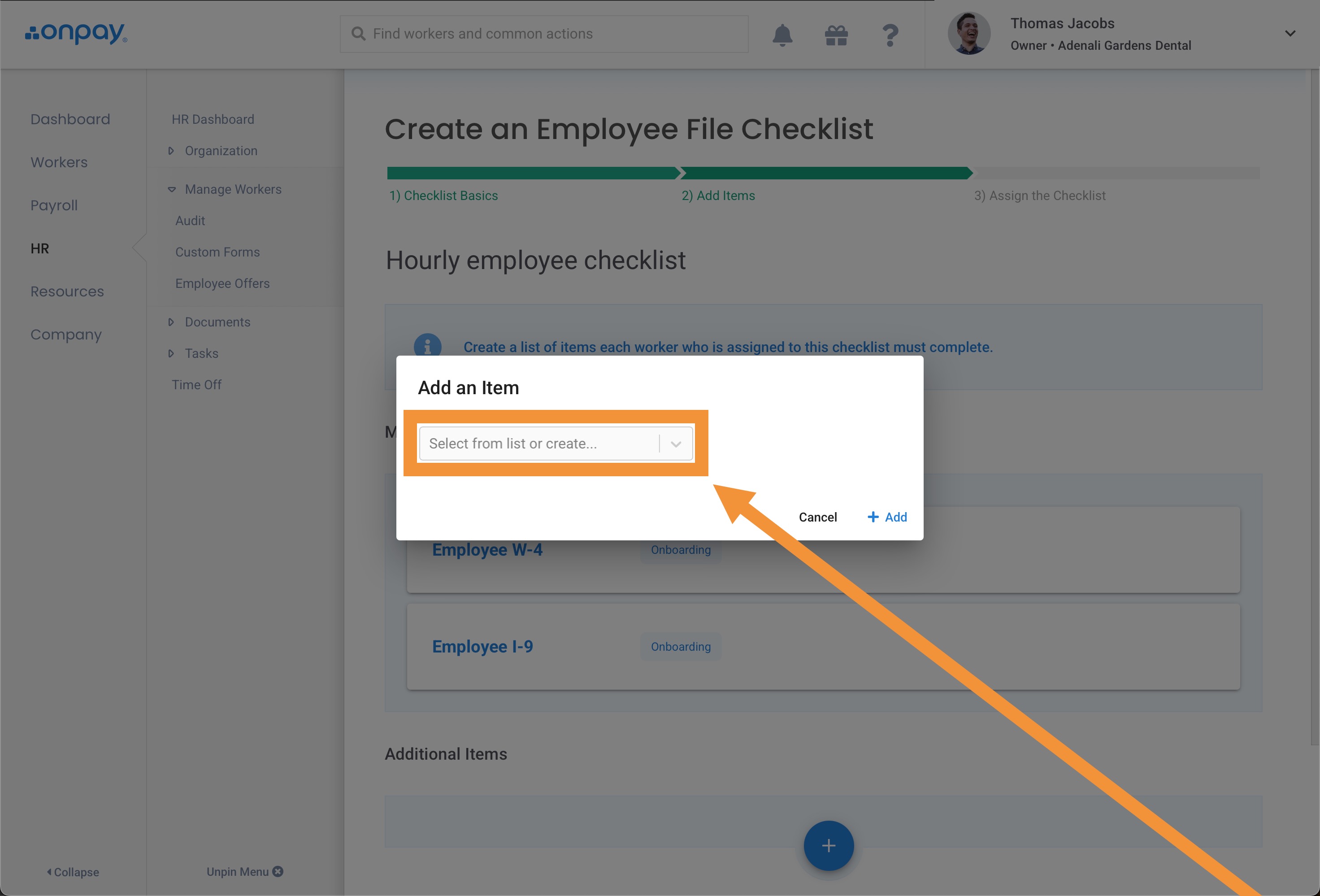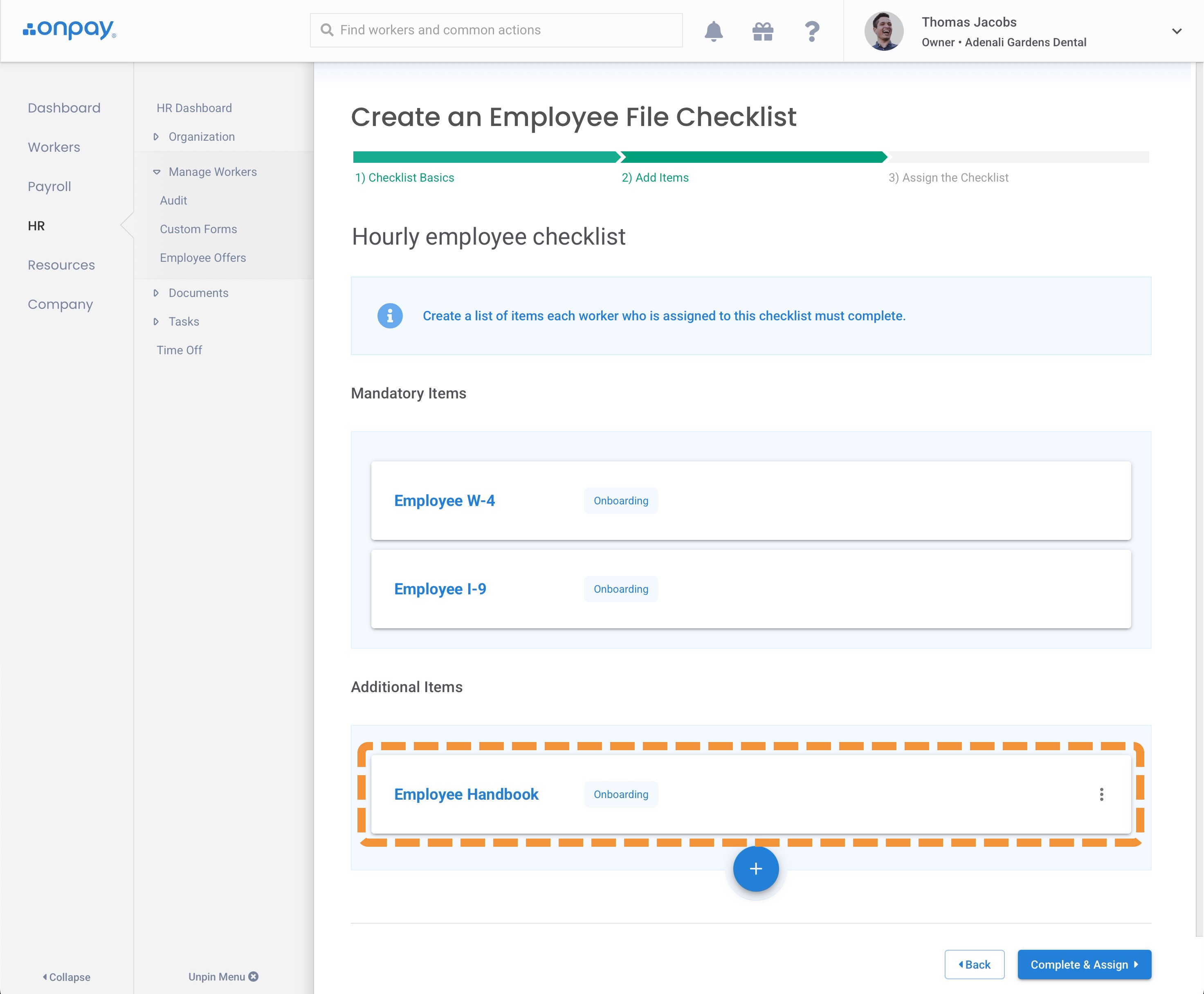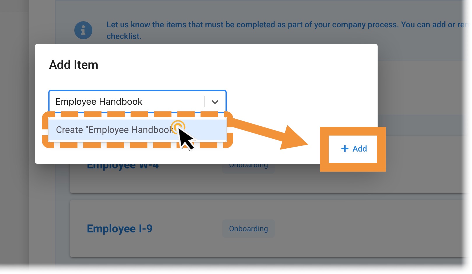 At the top, you'll find Forms W-4 and I-9. These forms are included in every checklist. You can also include additional items by clicking the blue (+) under "Additional Items".