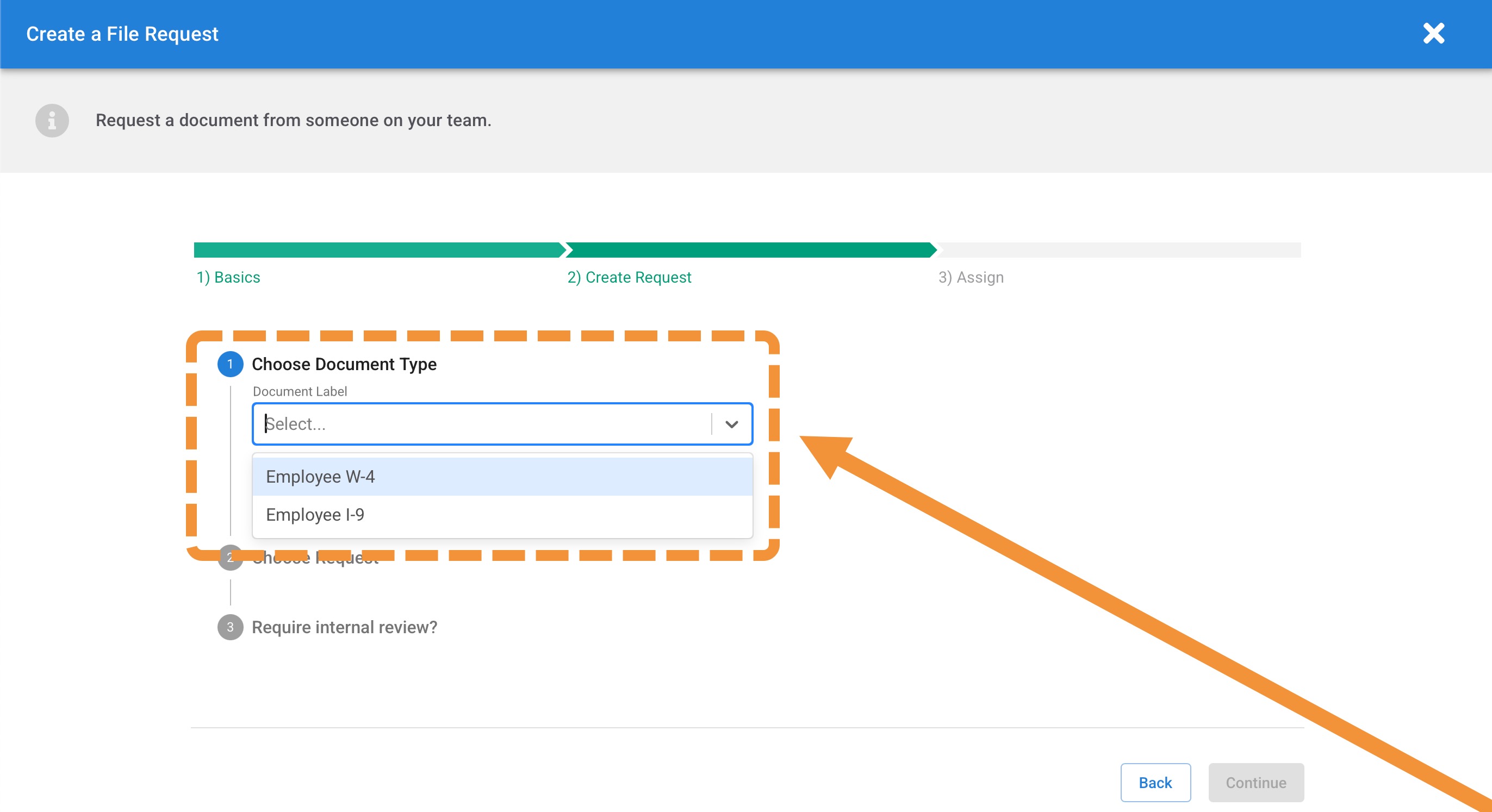 Choose the document type by selecting from the list of document labels from your Employee File Checklist. You can add Employee W-4, or Employee I-9.