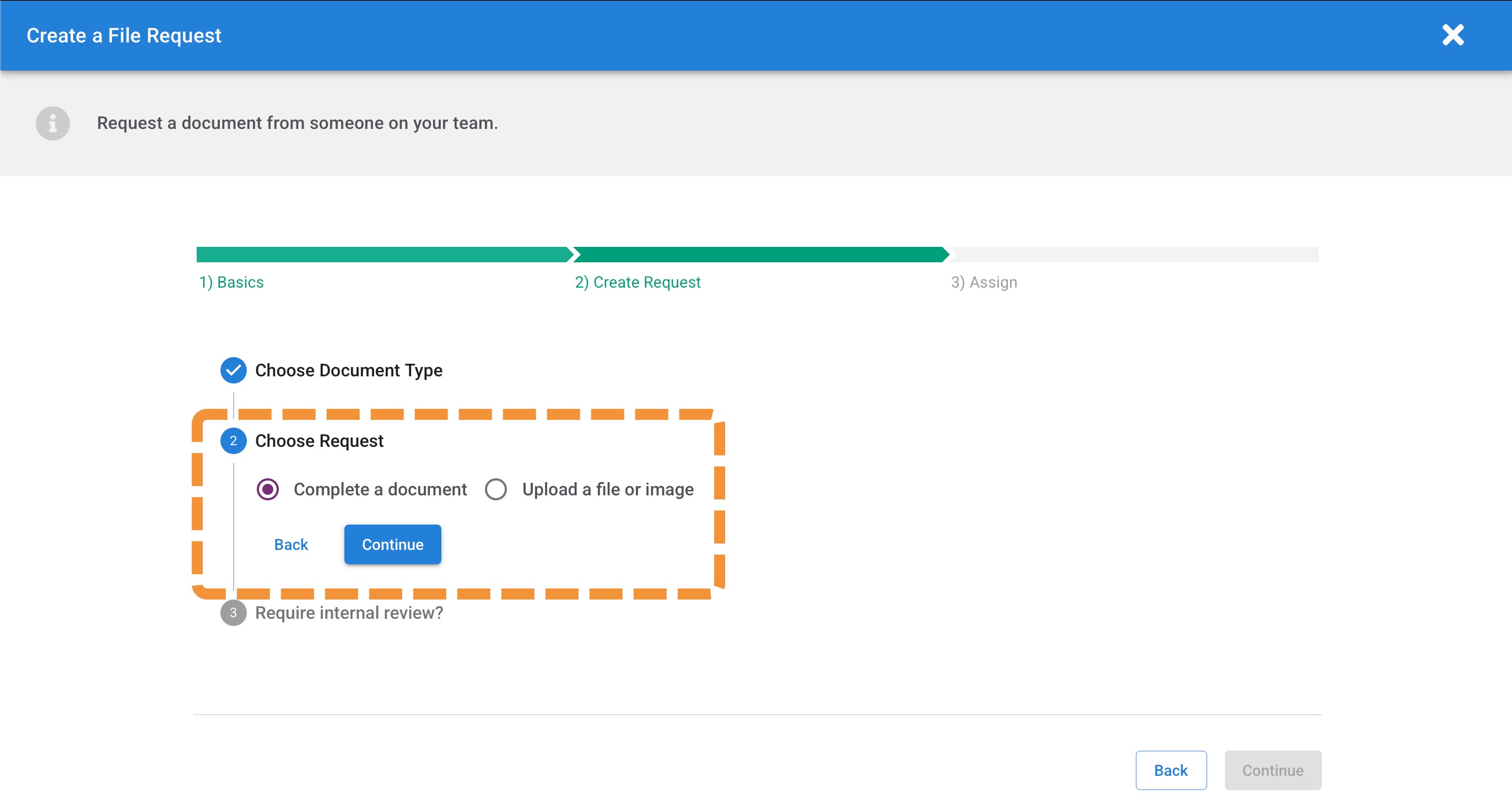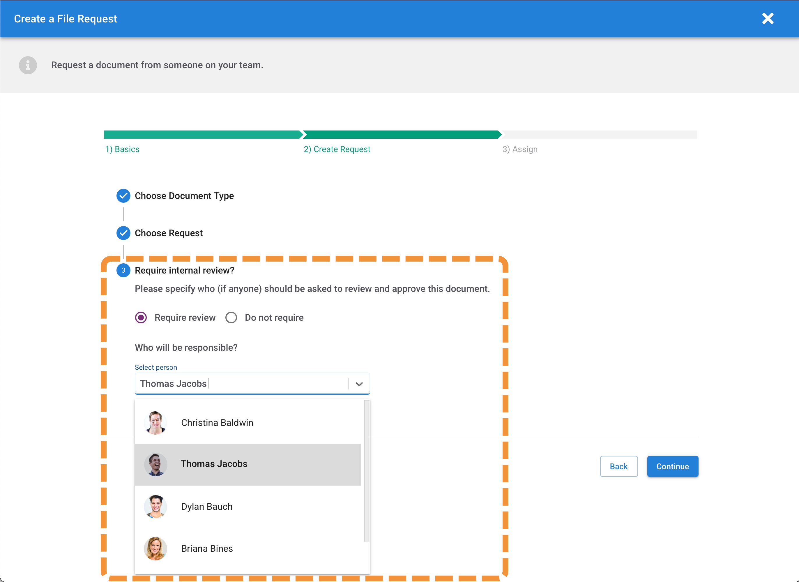 This step may not always be necessary, but it's an easy way to delegate the reviewing of completed forms and documents to another employee, like a manager or supervisor. Choose a person from the list, or select "Do not require", and click Continue to assign this request.