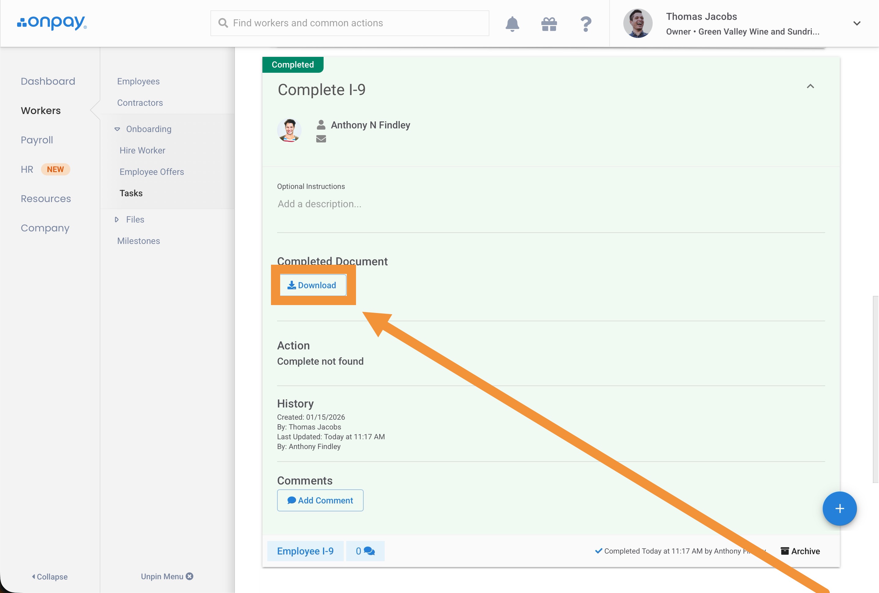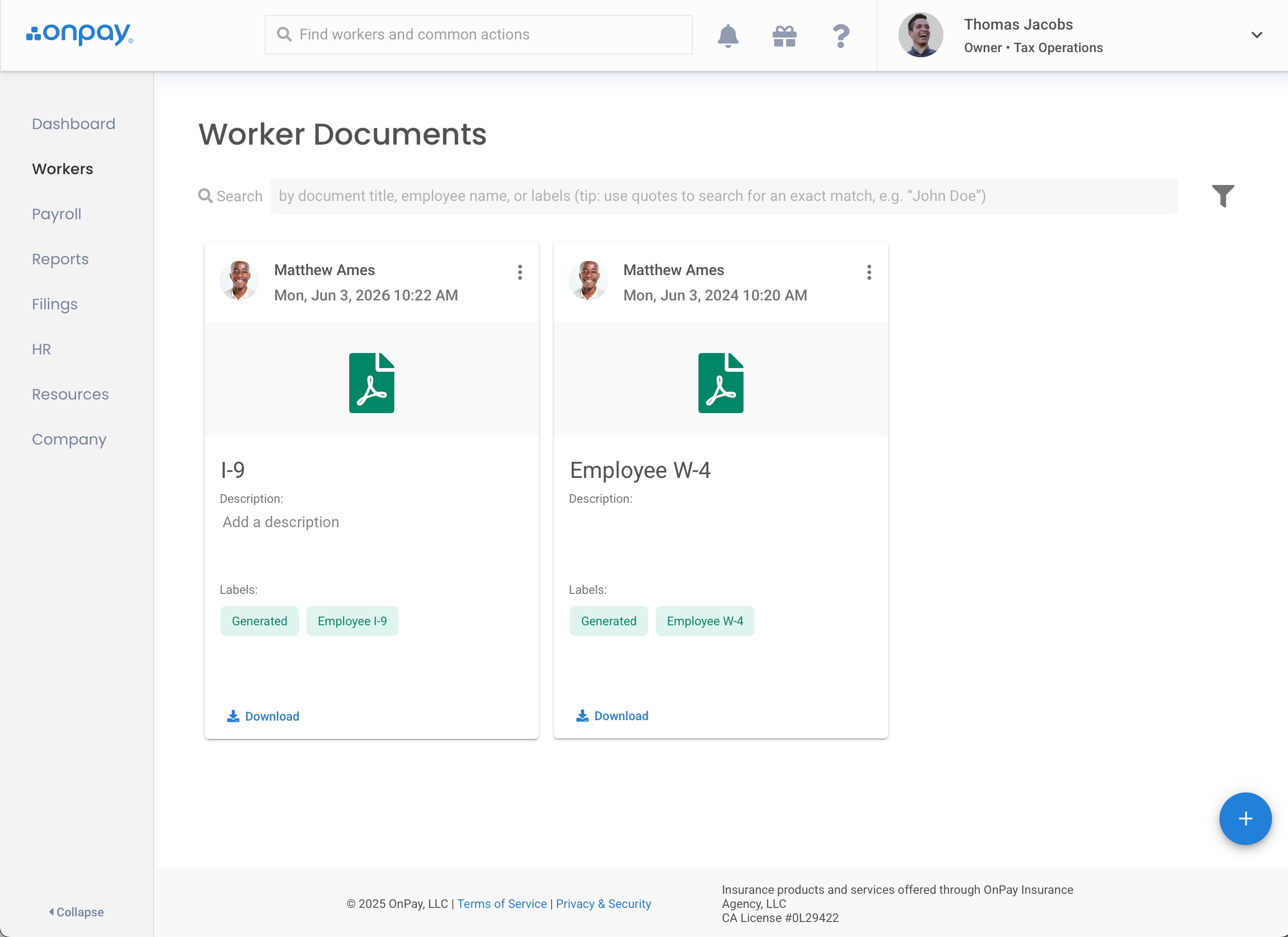 Completed forms (like Employee I-9) are automatically retained in OnPay, and can be downloaded at any time.