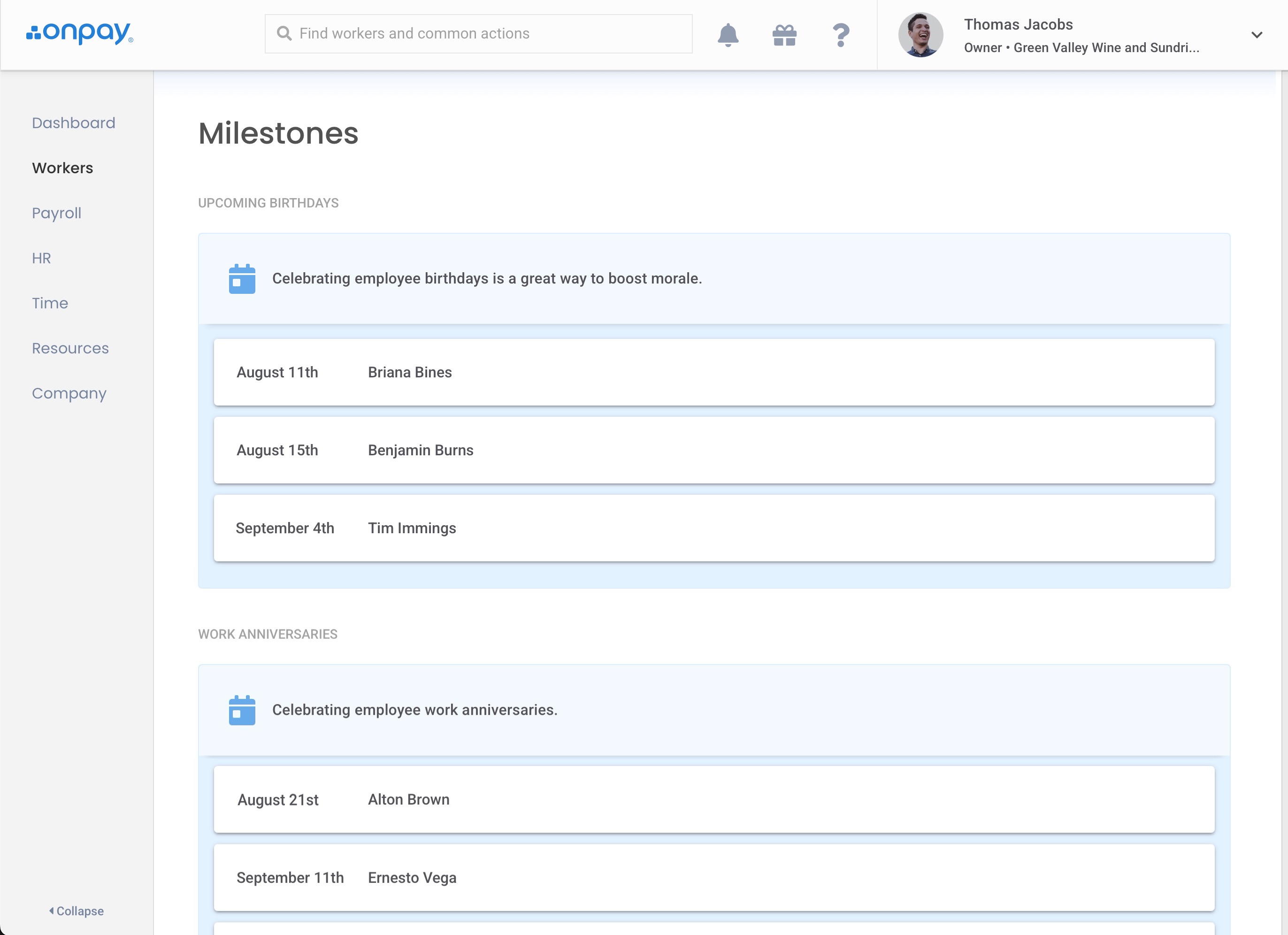 - Milestones - Keep up with employee birthdays and work anniversaries.
