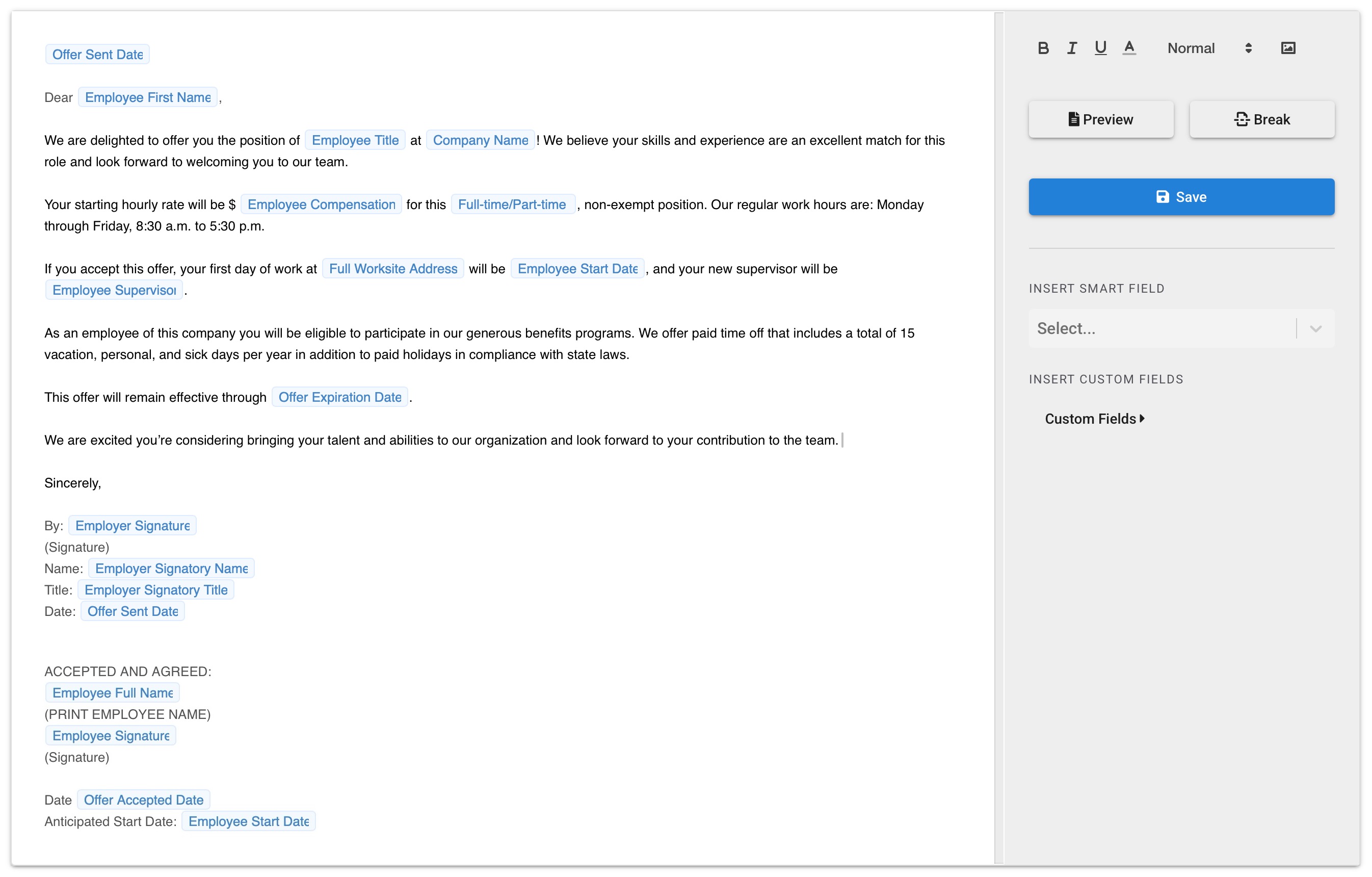 OnPay's Offer Template lets you enter a new employee's information (like their salary, start date, worksite address, and manager's name), and it inserts this information using smart fields in your template, generating a personalized offer letter for each candidate. The template editor includes the formatting styles you need to create professional looking documents. Candidates can accept and sign their offer right in OnPay, to create their profile and kick off the onboarding process.