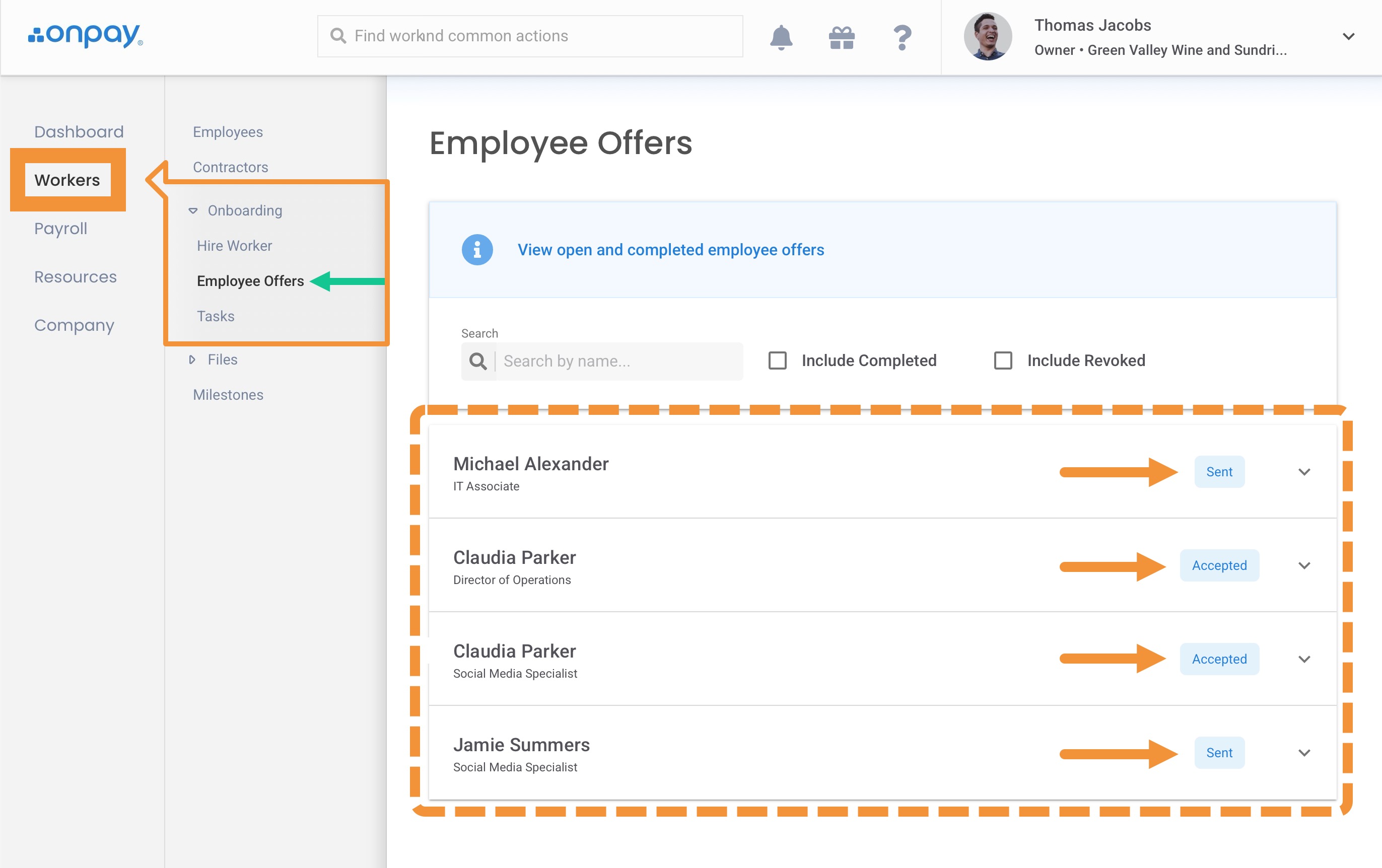 Sending offer letters using OnPay means candidates can review and sign their offer on their computer or smartphone. It also means you can monitor this progress, and take action as soon as they've accepted the offer.