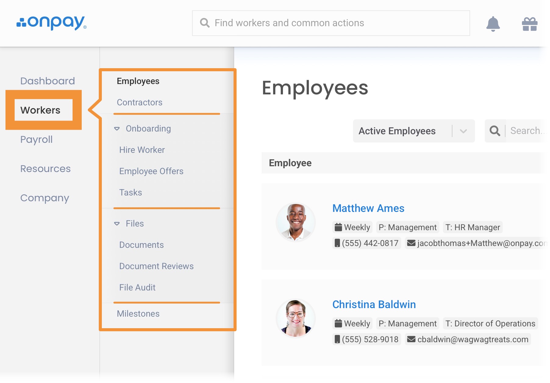 In the Workers tab, click Onboarding to hire workers using a customizable offer letter template, see when candidates have signed their offer, and manage internal onboarding tasks. Click Files to make sure important documents like W-4s and I-9s have been completed, reviewed by management, and kept on-file. Click Milestones to see upcoming work anniversaries and birthdays.