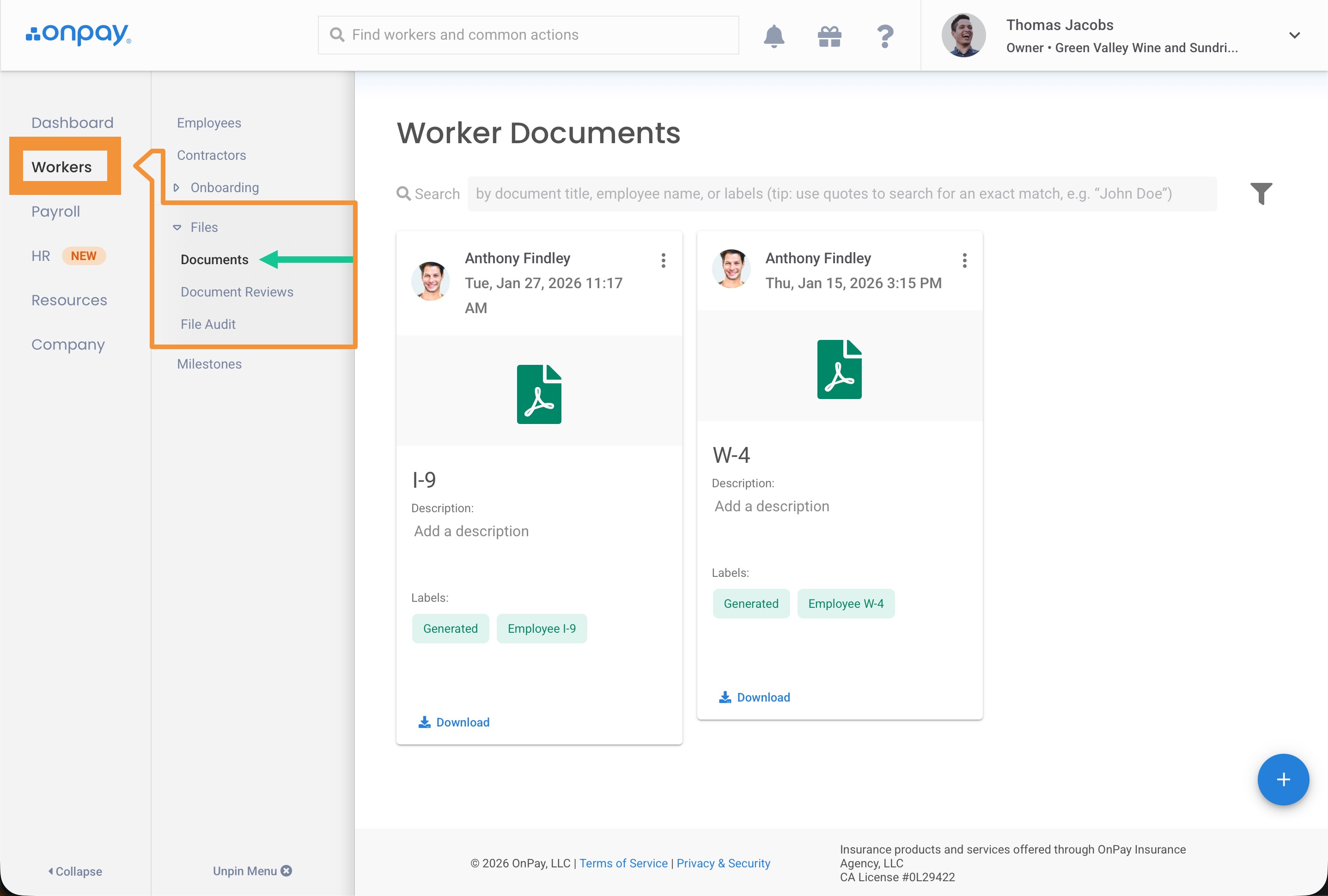 You'll also find completed worker documents in Workers>Documents. The Documents tab lets you search for documents by its title, employee name, or by label.