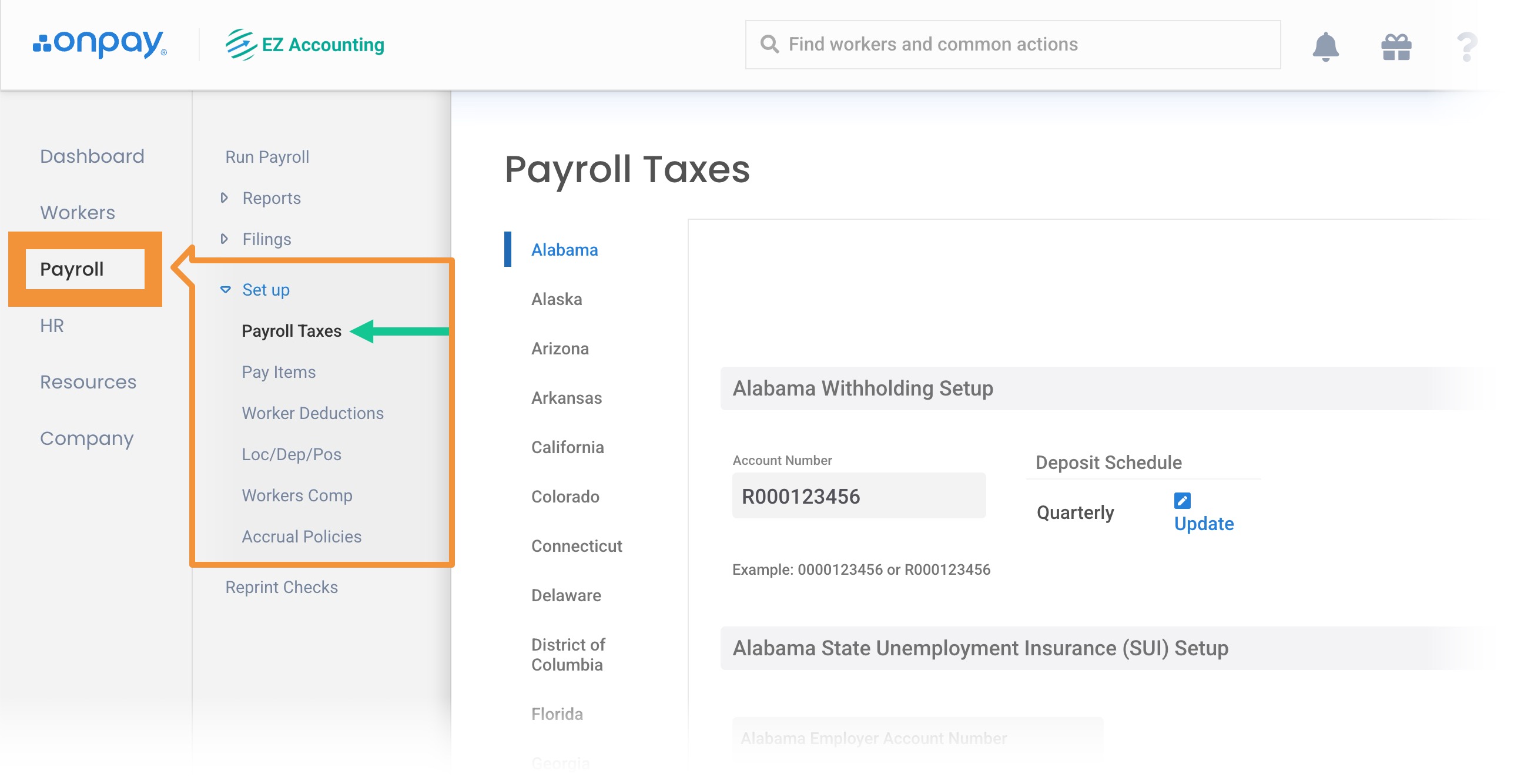 You'll need to enter your state tax information for each state where you pay employees. You'll find this option in Payroll>Set up>Payroll Taxes. You'll see a tab for each state where you have a worksite. Each will have its own state and local tax fields for entering employer IDs and rates, and in some cases, setting contribution amounts. These fields are determined by the addresses entered when creating Worksites, and where applicable, employee home addresses.