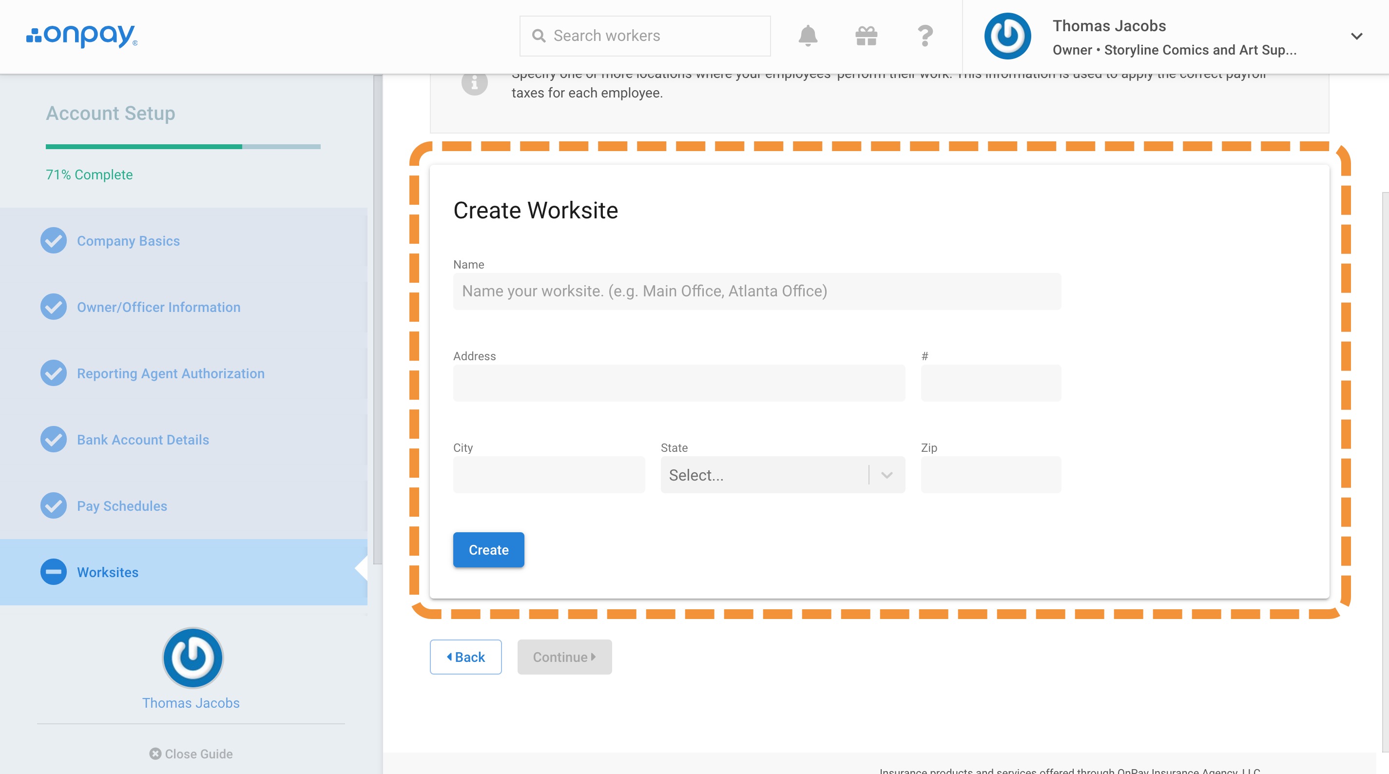 Worksites represent physical locations where employees and contractors perform work. If you have multiple worksites, start by entering the company's main location. You'll be able to add others later.