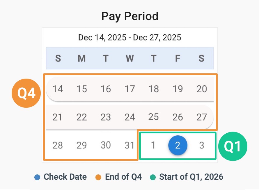 Here's an example of a two-week pay period that spanned the 14th through the 27th of December, 2025. However, because the check date for this pay period was Friday, January 2nd, this prior pay must be included in your Q1 payroll report.