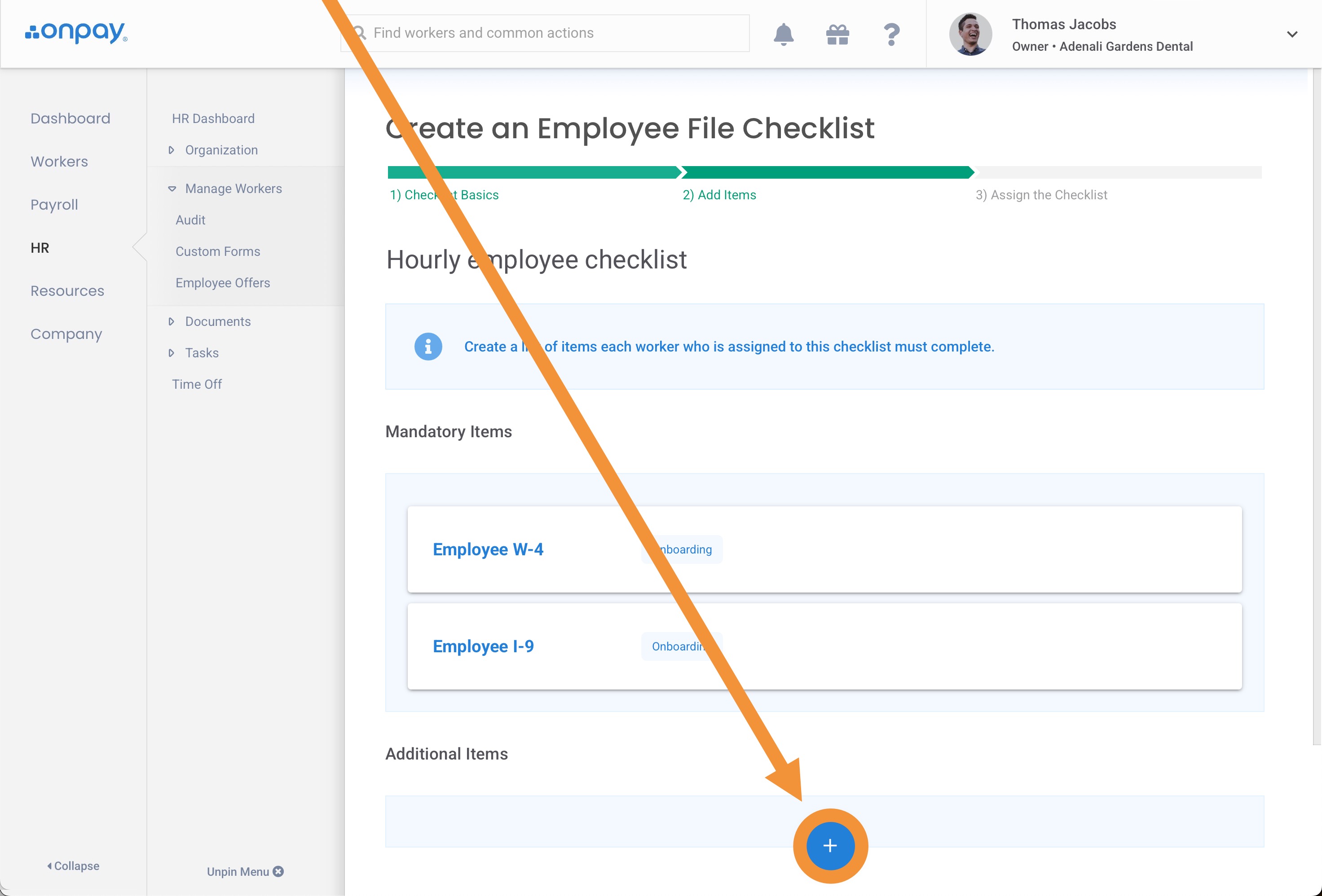 At the top, you'll find Forms W-4 and I-9. These forms are included in every checklist. You can also include additional items by clicking the blue (+) under "Additional Items".