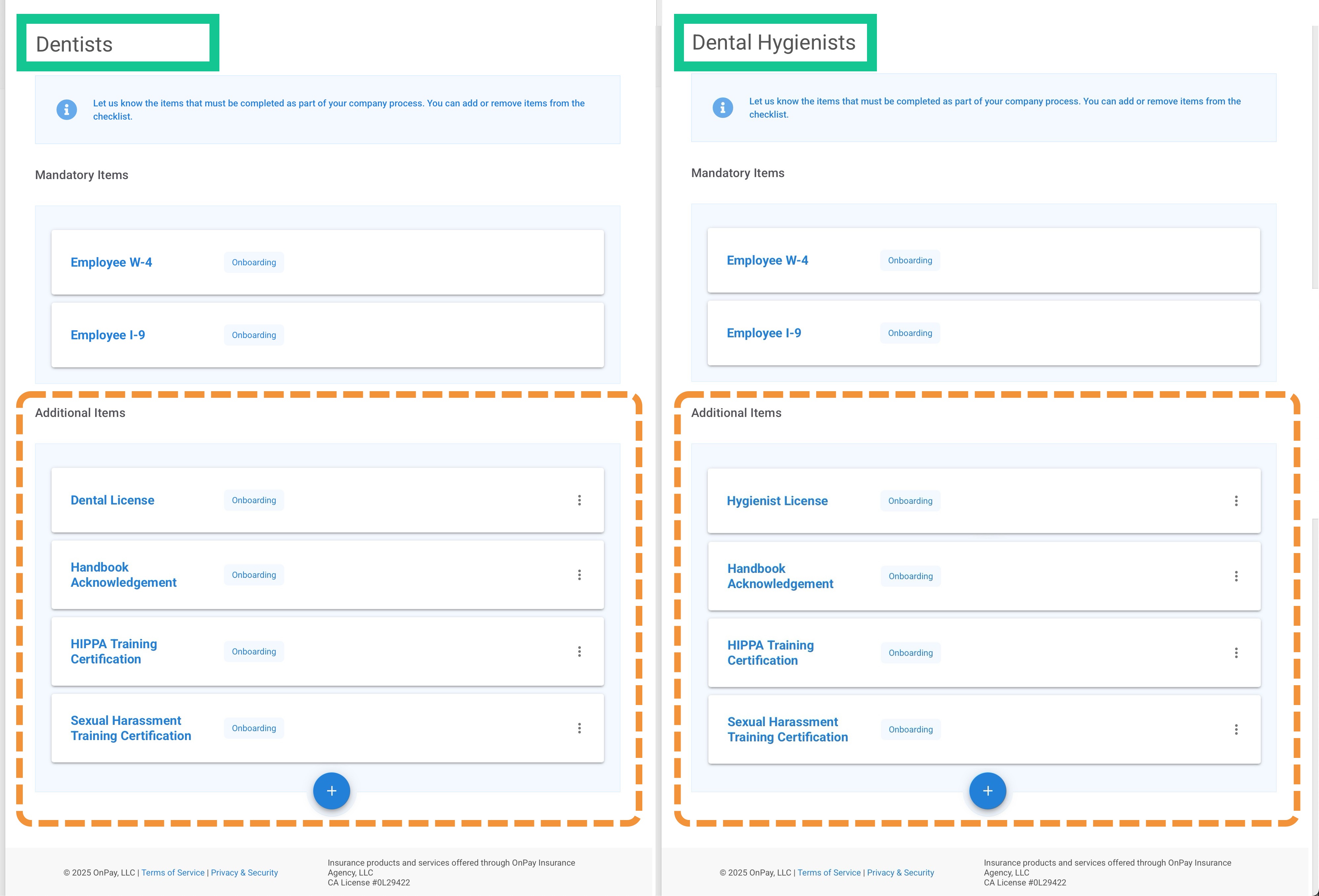 In the example below, a dental practice has separate checklists for Dentists and Hygienists. Note that they have some items in common, and some that are unique to their role.
