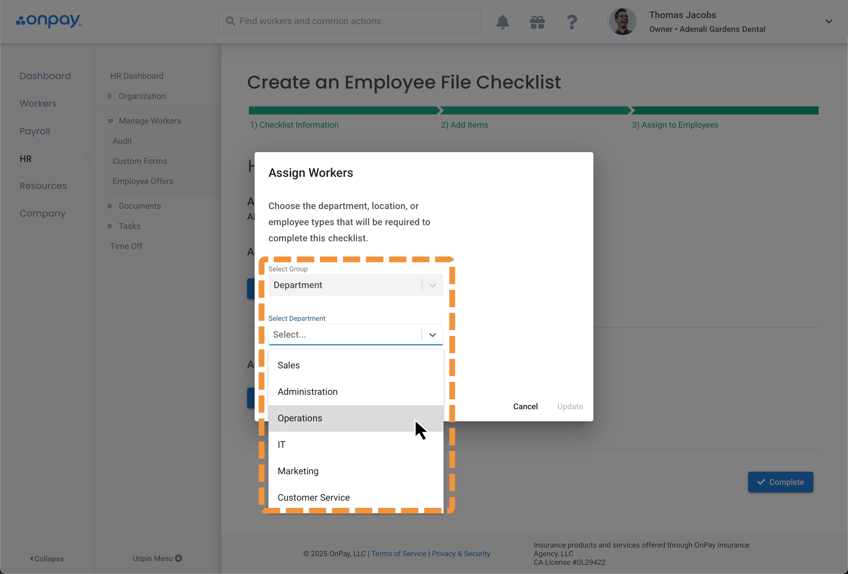 In this example, we have two different companies, a dental practice (left) and a convenience store (right). The dental practice has assigned employees to departments in their OnPay profiles, so they're assigning their checklists by "Department". But the convenience store doesn't have multiple departments, just different positions within the store, so they're assigning their checklists by "Position".