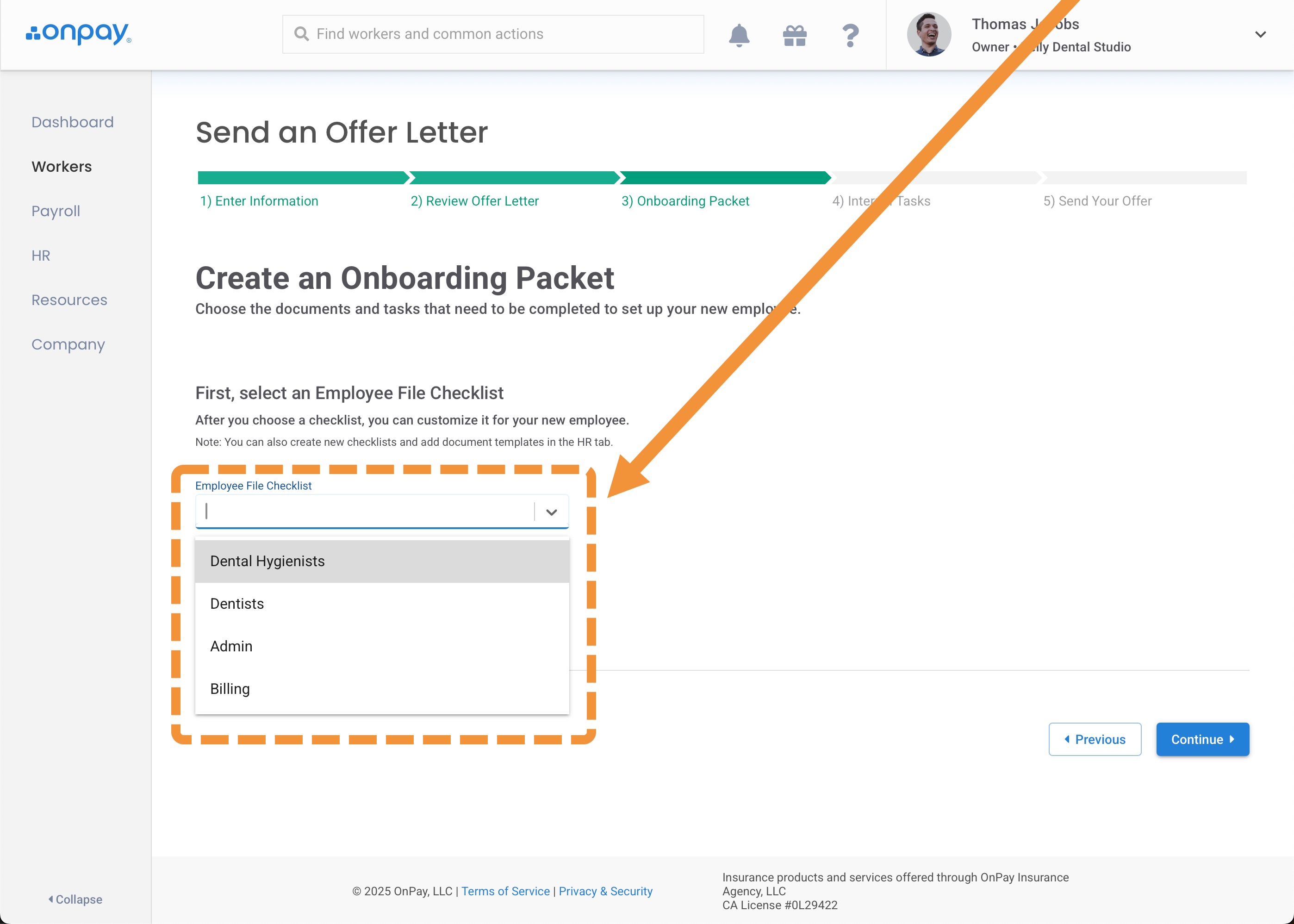 In step 3 of sending an Offer Letter, select the appropriate File Checklist for the employee.