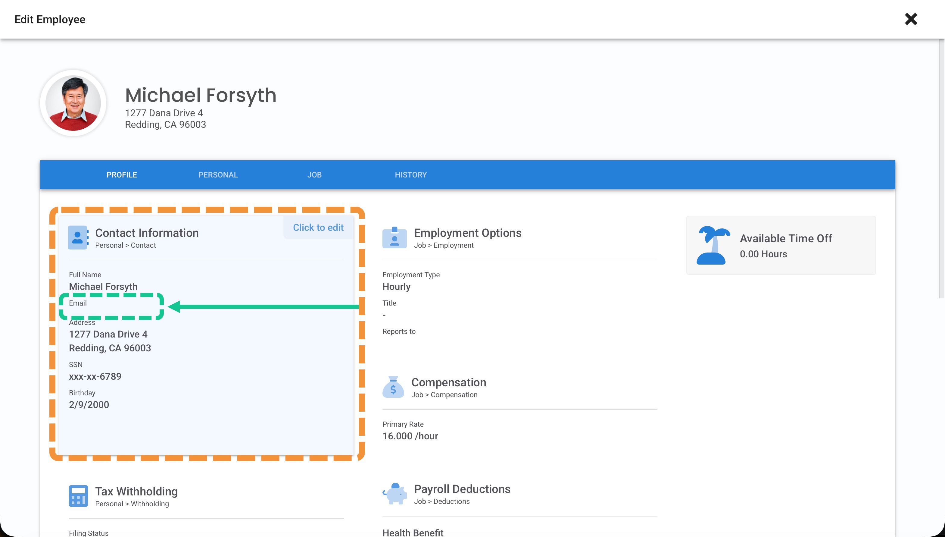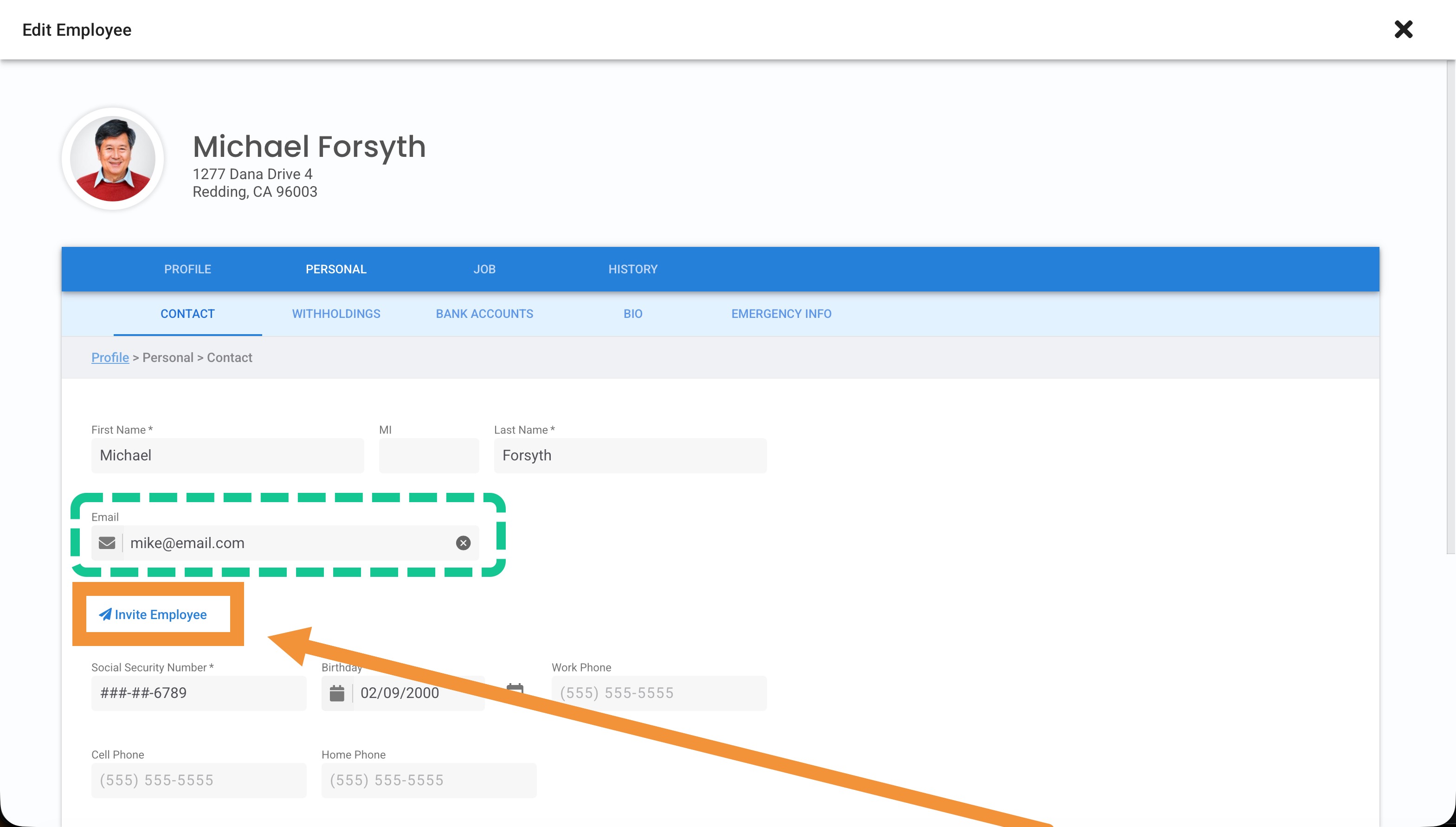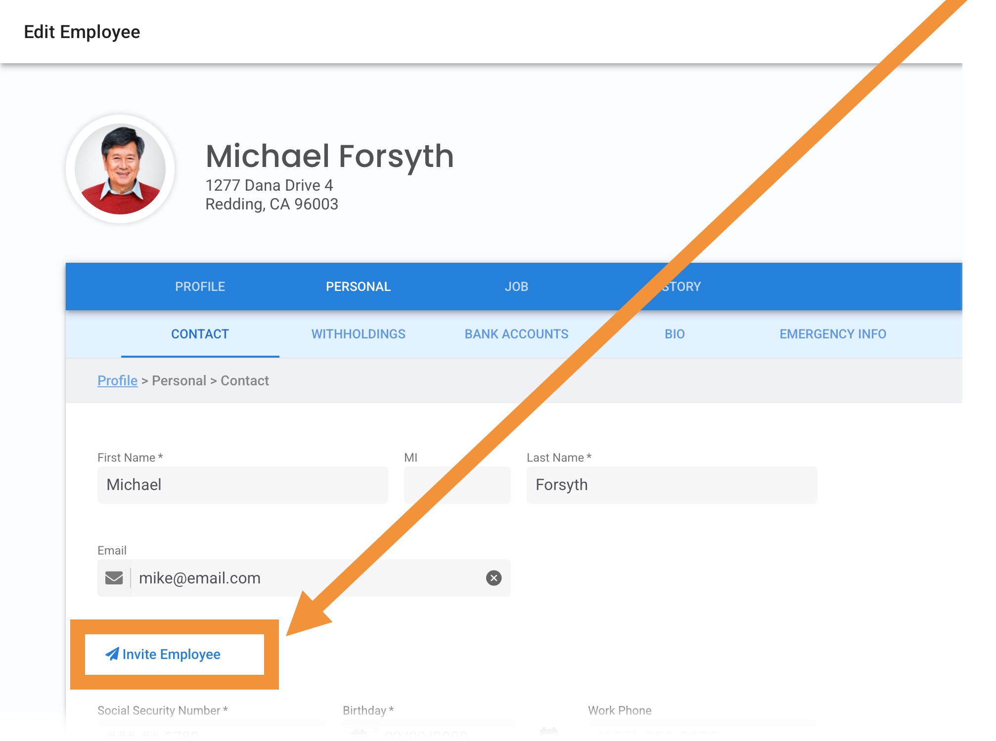 The email address will appear in the employee's Contact Information tile of their profile. Make sure it's entered correctly. To update the email, or confirm the invitation was sent, Click to edit.
